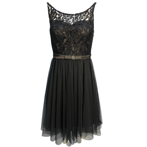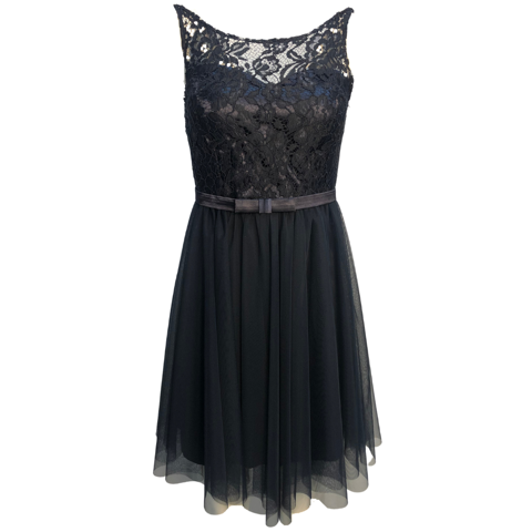 Feestelijke cocktail jurk met een kanten top en mesh/tulle rok. De jurk is te dragen voor maat 36/40 door de elastische achterzijde. De spaghettibandjes zijn verstelbaar en de taille kan strakker gemaakt worden d.m.v. de taille bandjes te strikken.