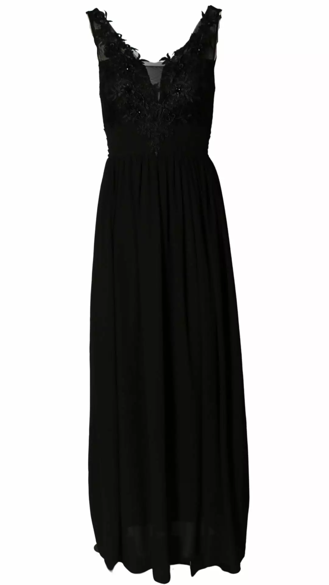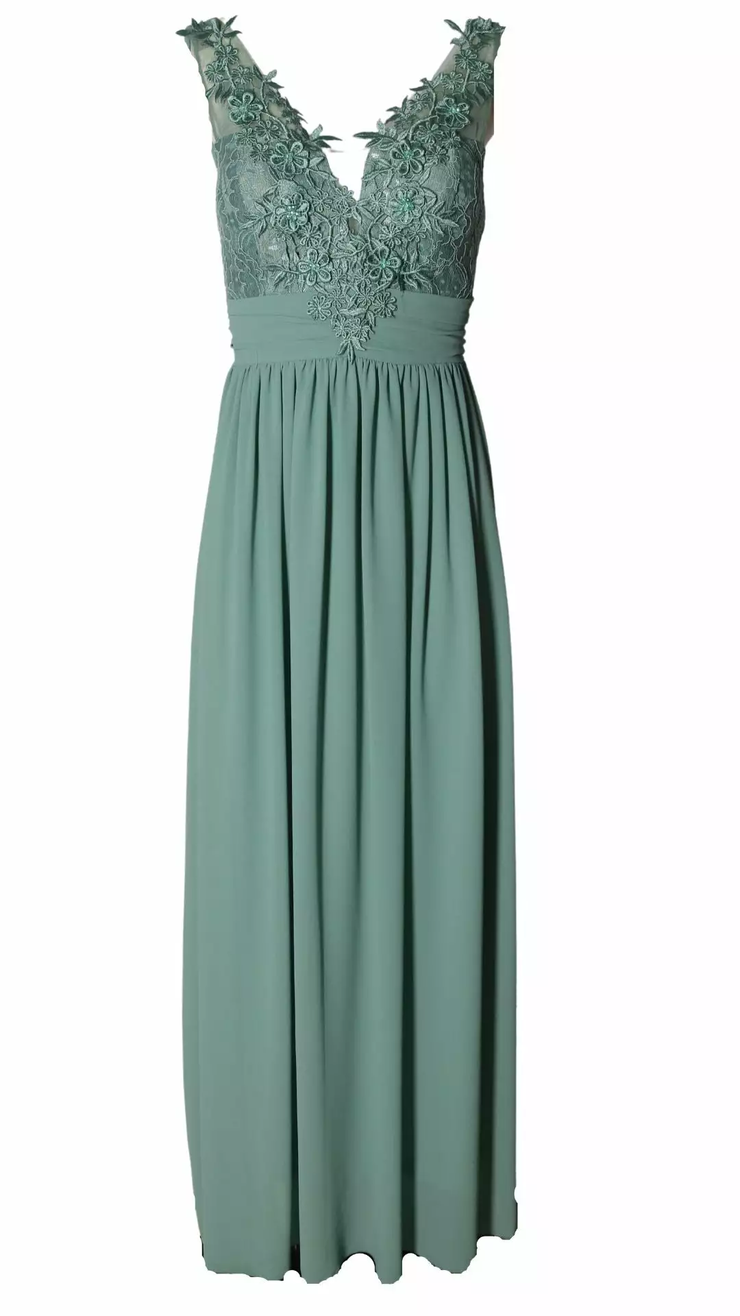 Gala jurk met top van kant en v-hals. Vanuit de taille loopt de jurk zwierig uit.