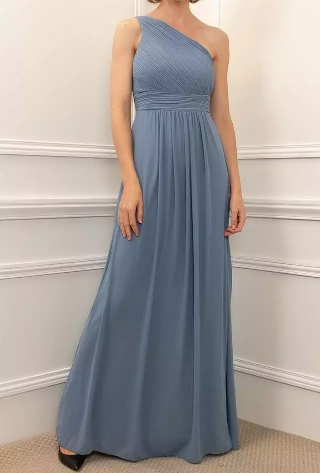 Deze offshoulder avondjurk is voorzien van een geplisseerd top gedeelte en loopt dan vanuit de geplisseerde taille band uit in een mooie chiffon rok. Mooi zwierig.