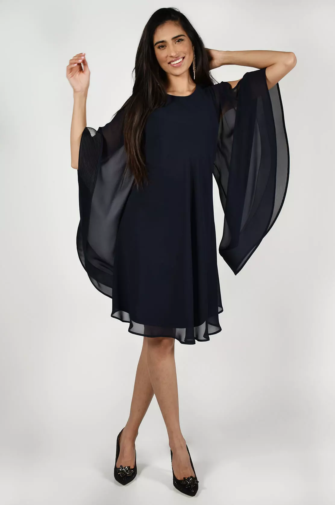Navy kleurige a-lijn jurk met aangesloten onderjurk waarover een prachtig soepelvallende chiffon laag overheen valt. De jurk heeft zeer aparte en opvallende wijde mouwen welke een speciaal effect geven aan de jurk. Aan de achterzijde zit er een zilverkleurige steen knoop-lus sluiting.