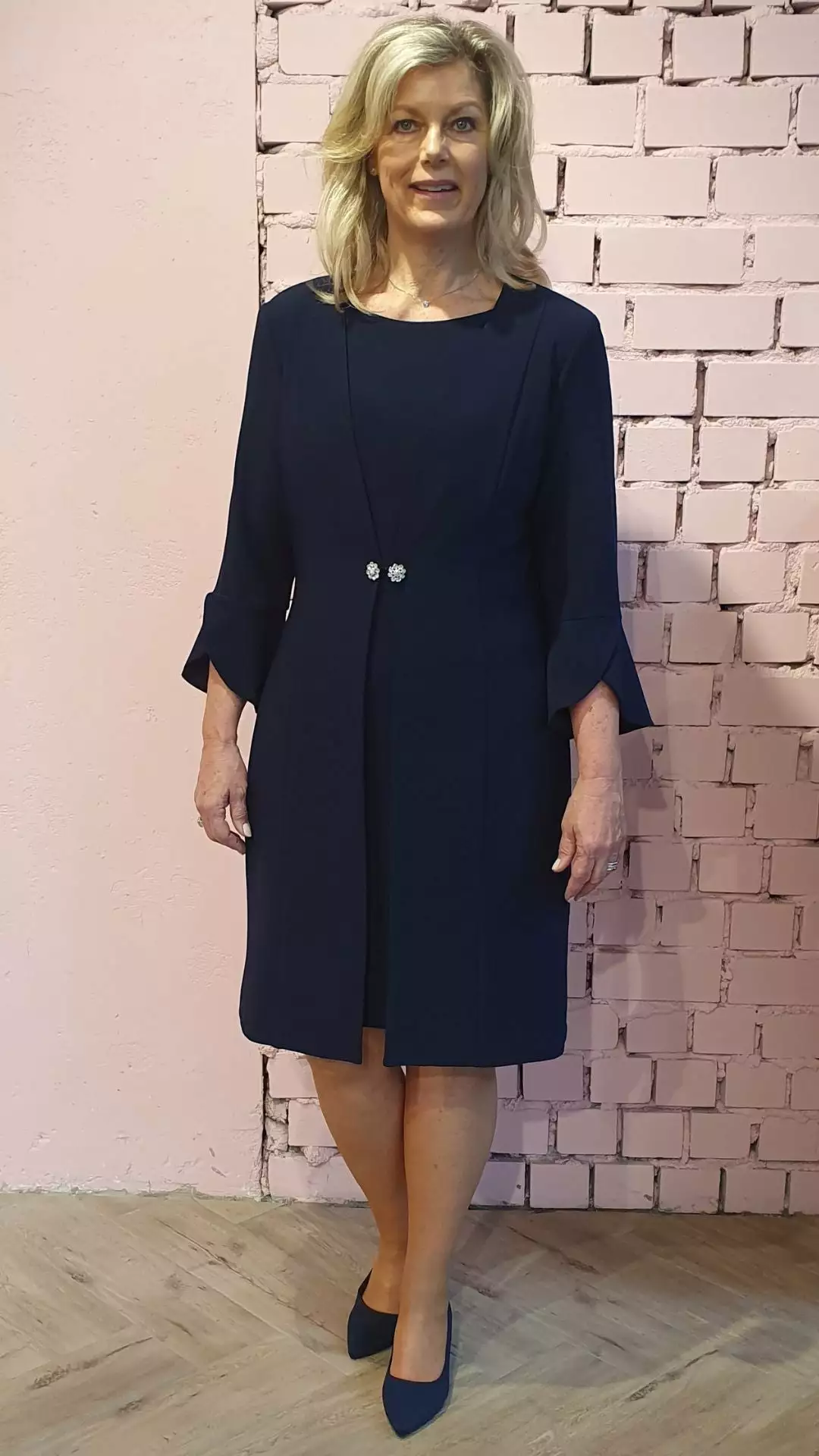 Prachtige mantel met drie kwart tulp mouw en haak-oog sluiting om de mantel mooi te tailleren. Deze mantel is perfect te combineren met de basis jurk van Frank Lyman welke je hier kunt vinden.