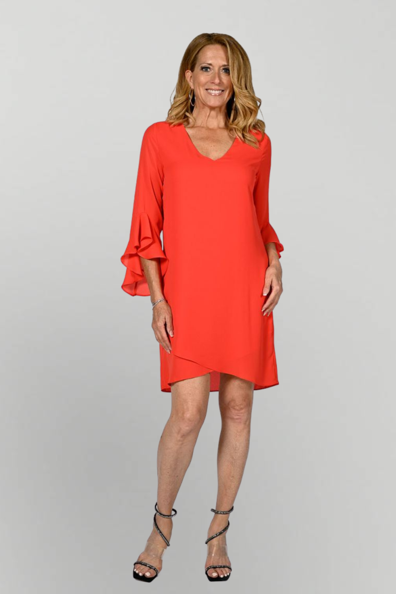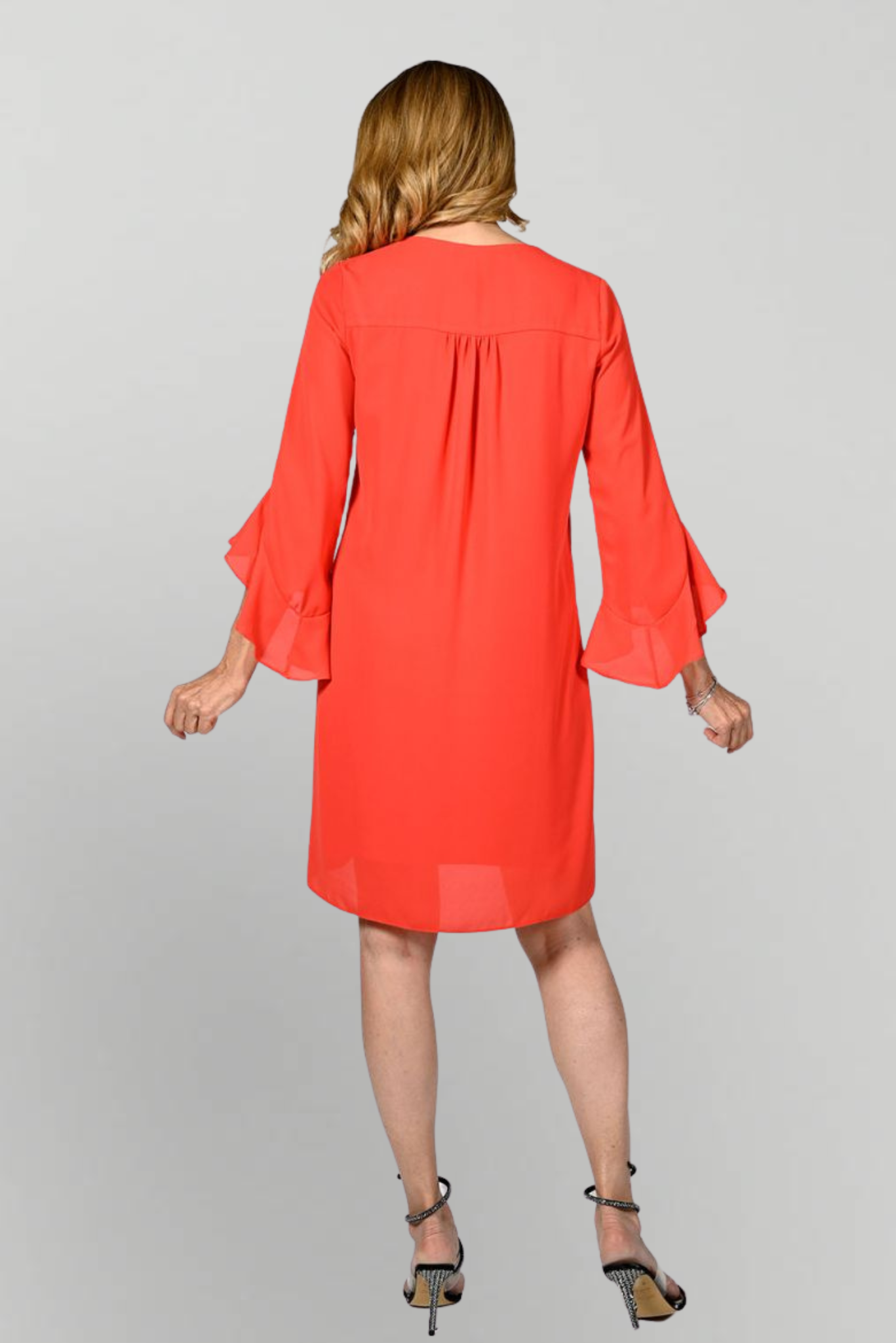 Deze prachtige jurk van Frank Lyman is een echte ete catcher en niet alleen door de kleur. Deze jurk heeft prachtige asymetrische trompet mouwen en doordat de jurk dubbellaags is valt een eventueel buikje ook goed te verbloemen. De jurk heeft een v-hals en valt tot rondom de knie.
