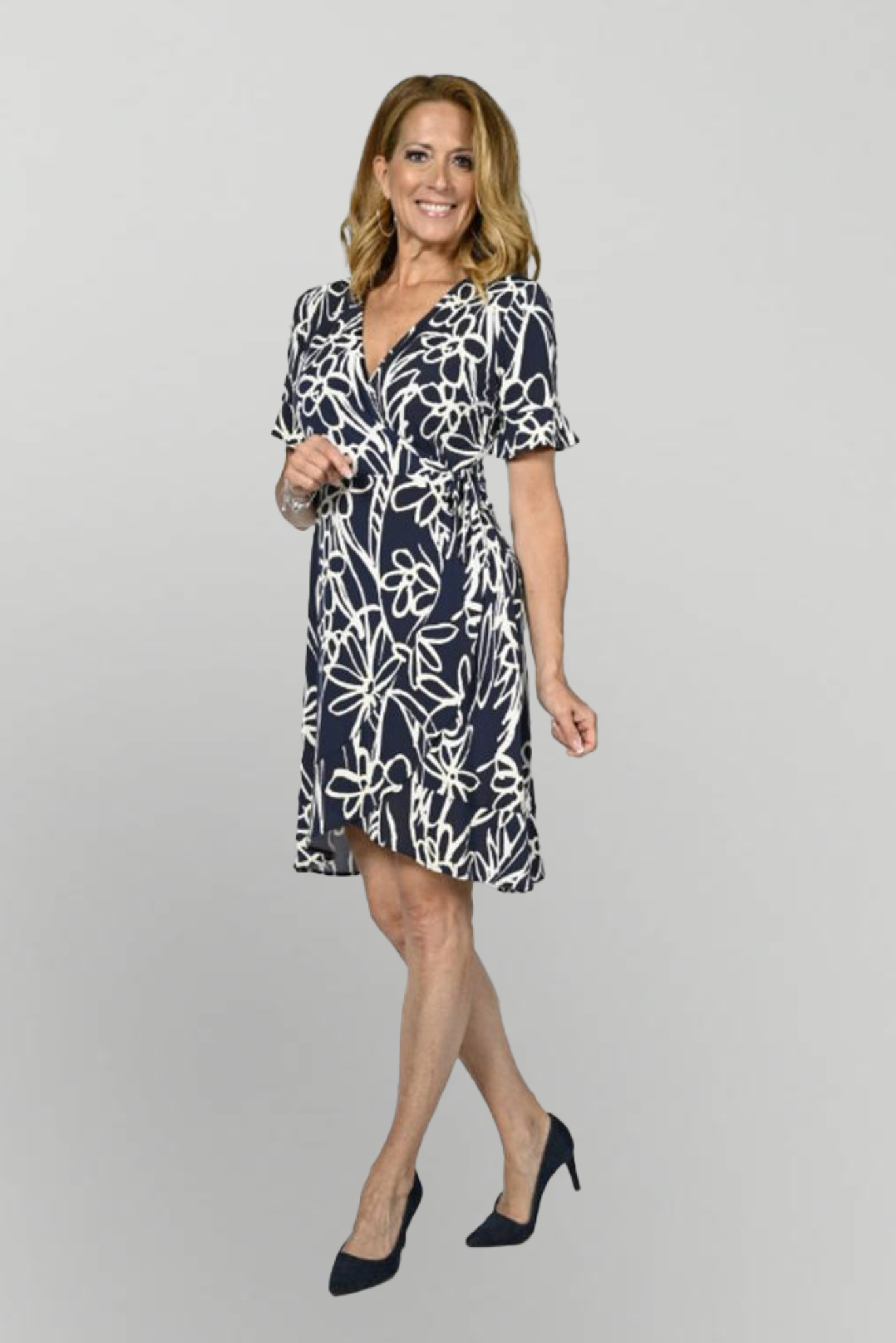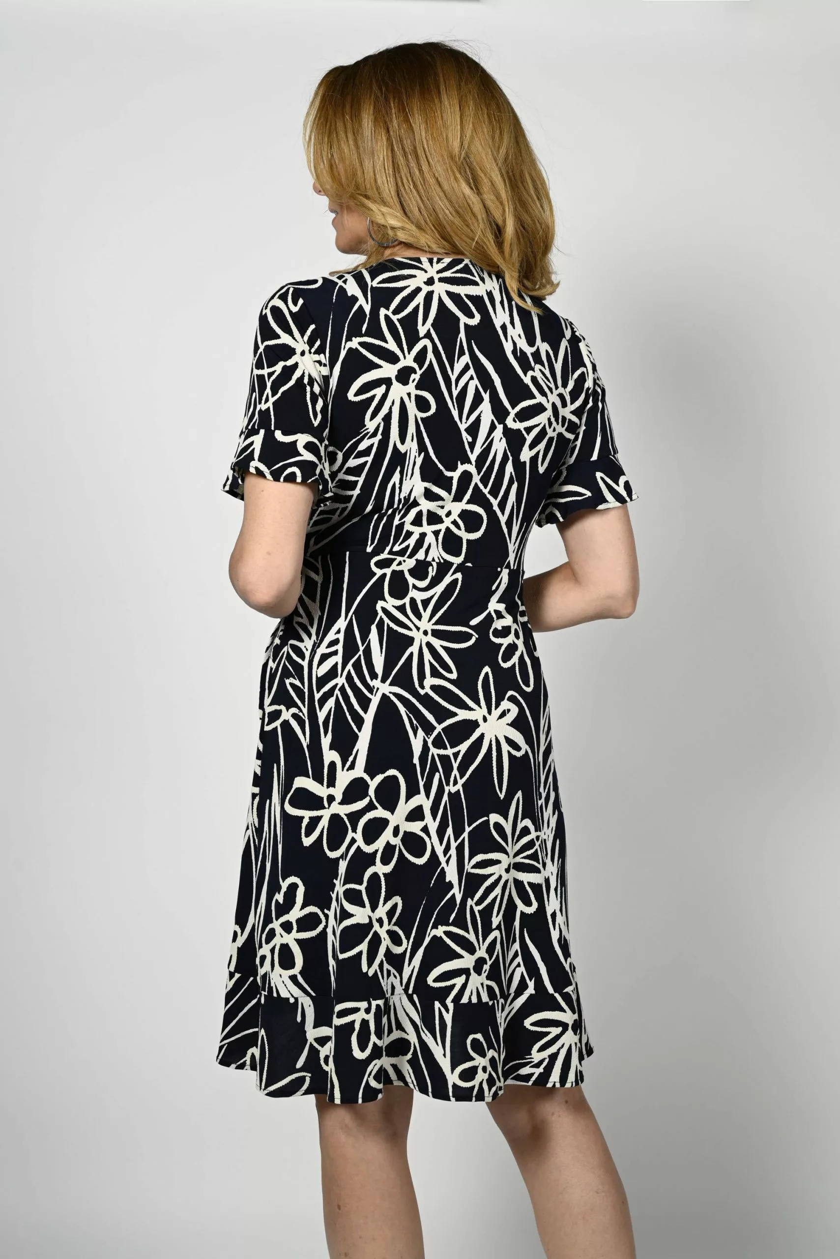 Navy-wit kleurige jurk met bloemenprint. De jurk heeft een overslag effect, valt tot rondom de knie en geeft lekker mee.