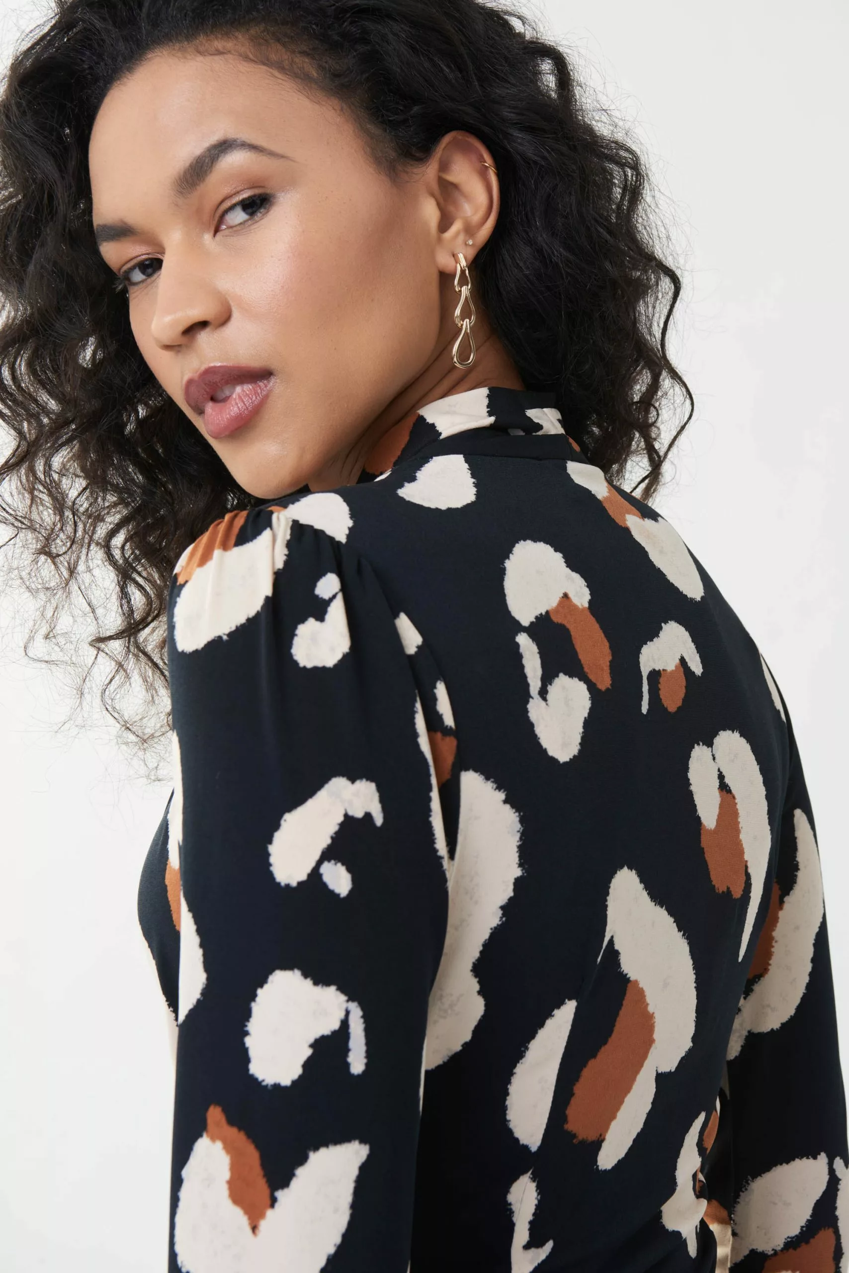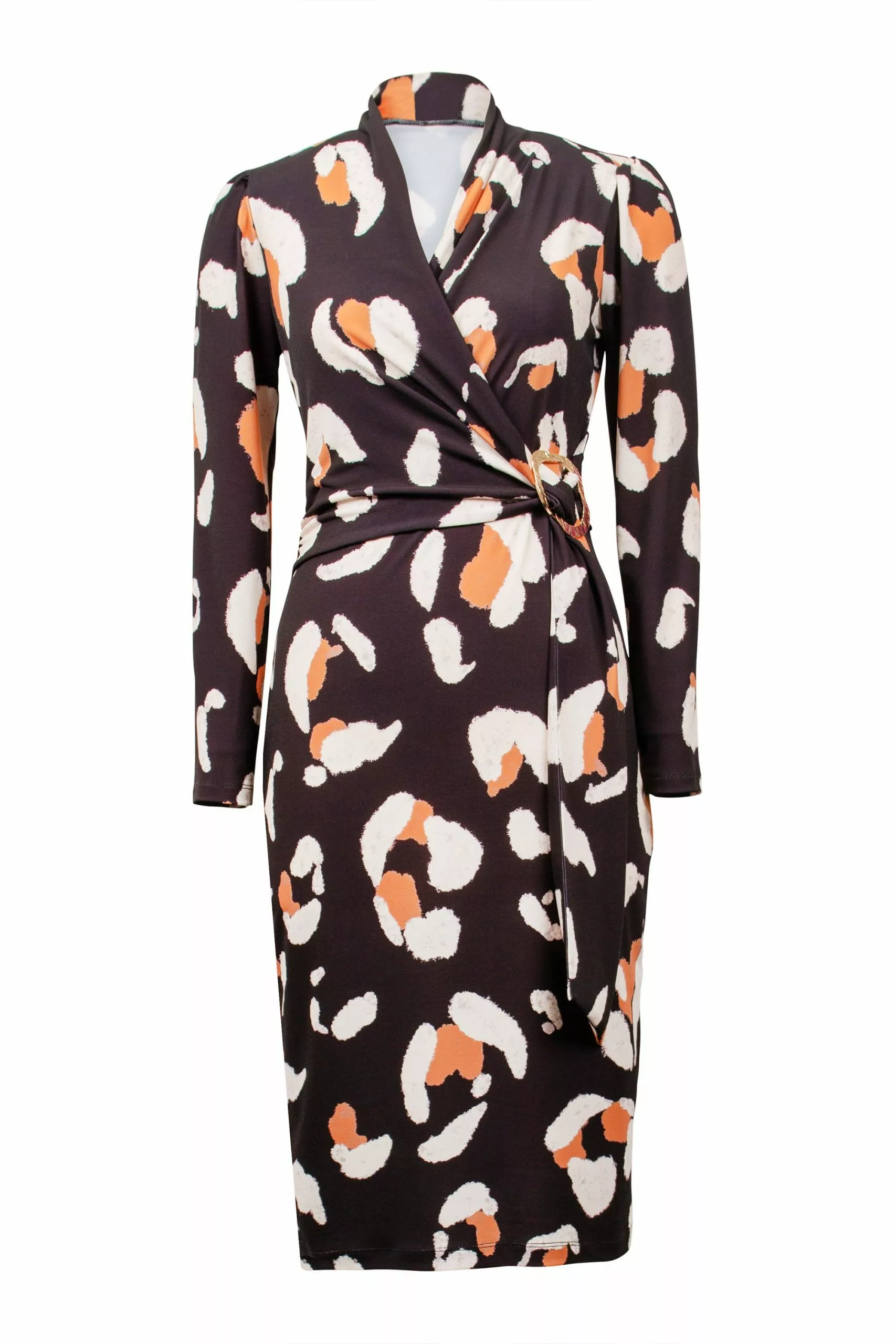 Aansluitende jurk met overslag top die strakker of losser gedragen kan worden door de riem. De stof rekt mee en draag comfortabel. De jurk heeft een v-hals, lange mouw en valt rondom de knie.