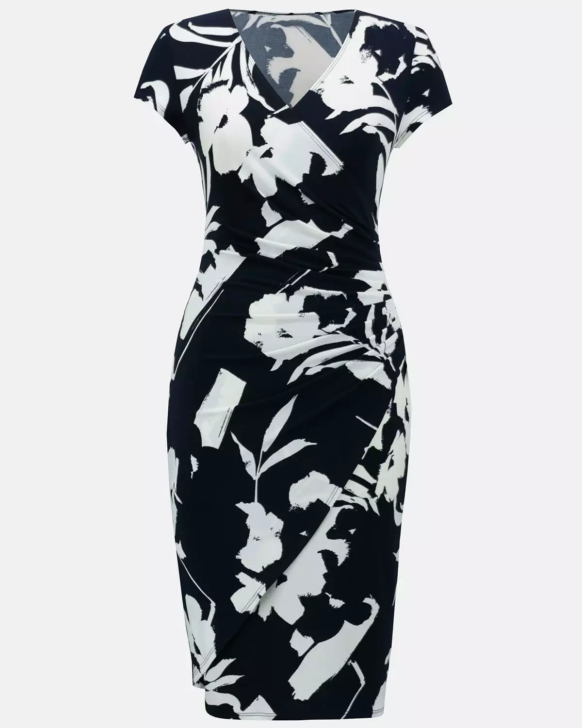 Deze mooi jurk heeft een levendige bloemenprint tegen een donkere achtergrond. Het wikkelsilhouet is prachtig figuur flatterend en samen met de v-hals en kapmouwen is dit simpelweg een jurk die niet mag ontbreken in je garderobe. Zowel zakelijk, dagelijks als voor een feestje is deze jurk zeer draagbaar. De jurk is volledig gevoerd.