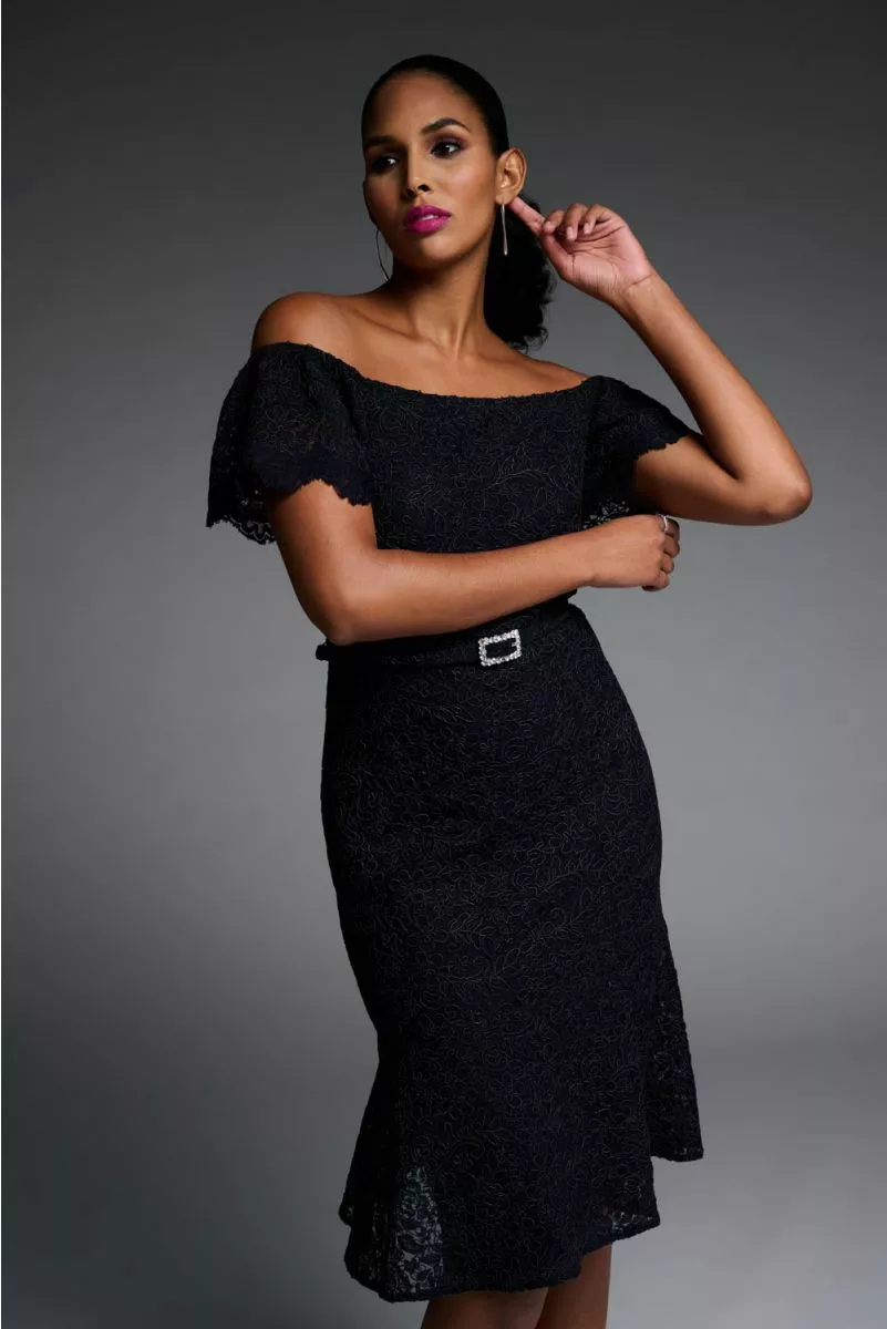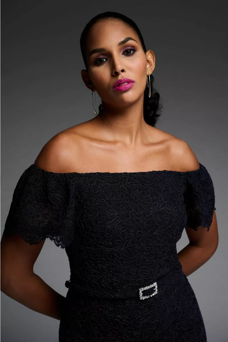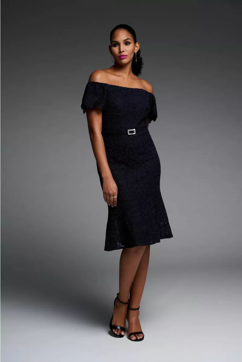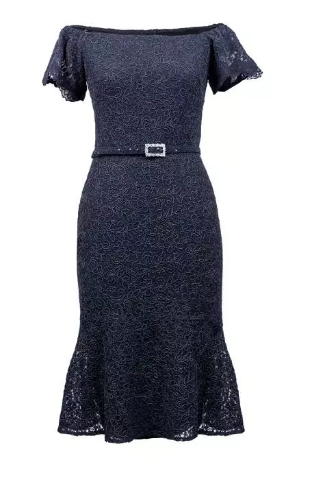 Deze broderie jurk kun je zowel offshoulder als onshoulder dragen. Elegant & classy ten alle tijden. De jurk valt rondom de knie en heeft een bijpassend riempje voorzien van strass steentjes.