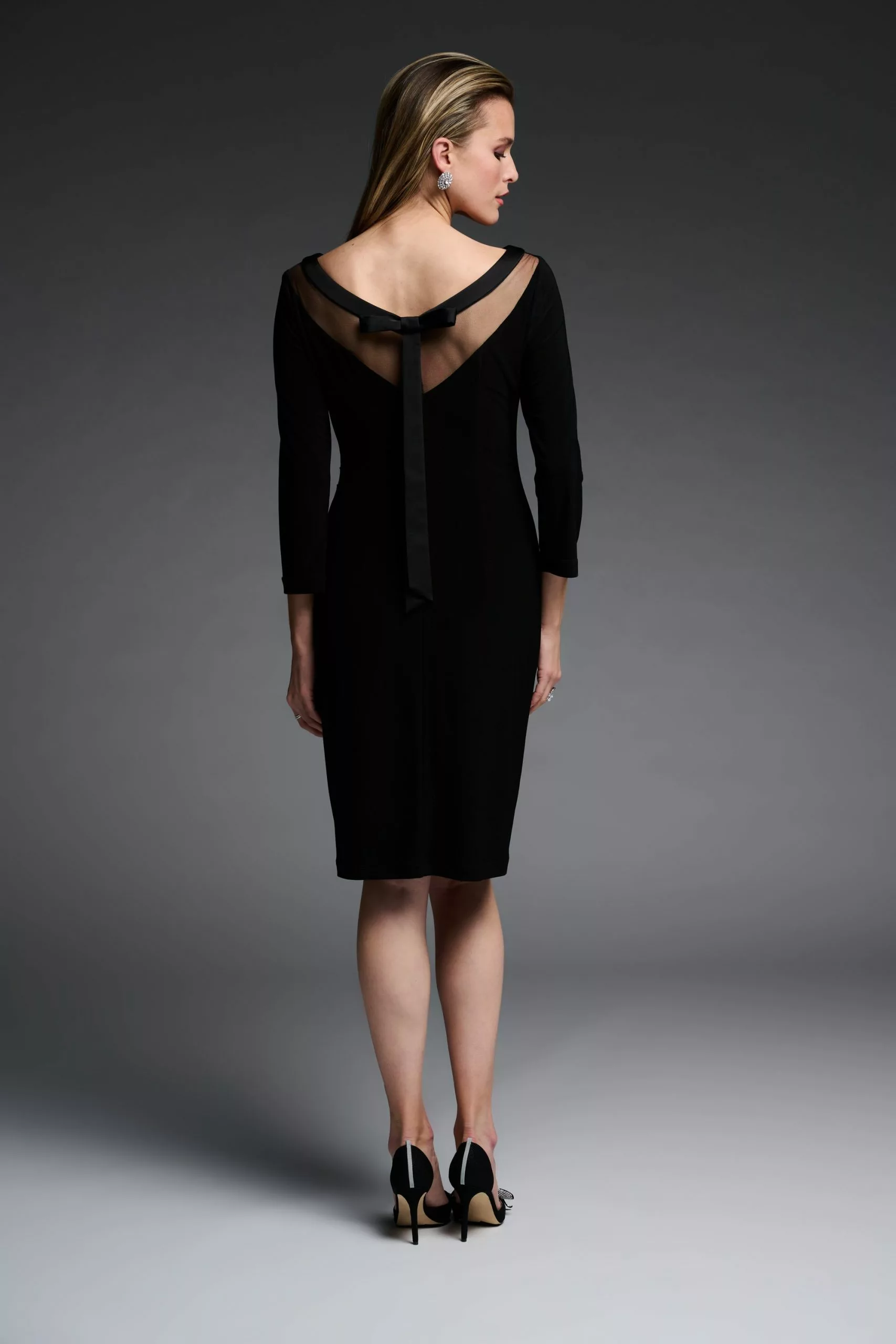 Aansluitende cocktailjurk met prachtige strikdetail aan de achterzijde. De jurk rekt mee en is zeer geschikt voor een nettere gelegenheid. De kleur is midnight blue.