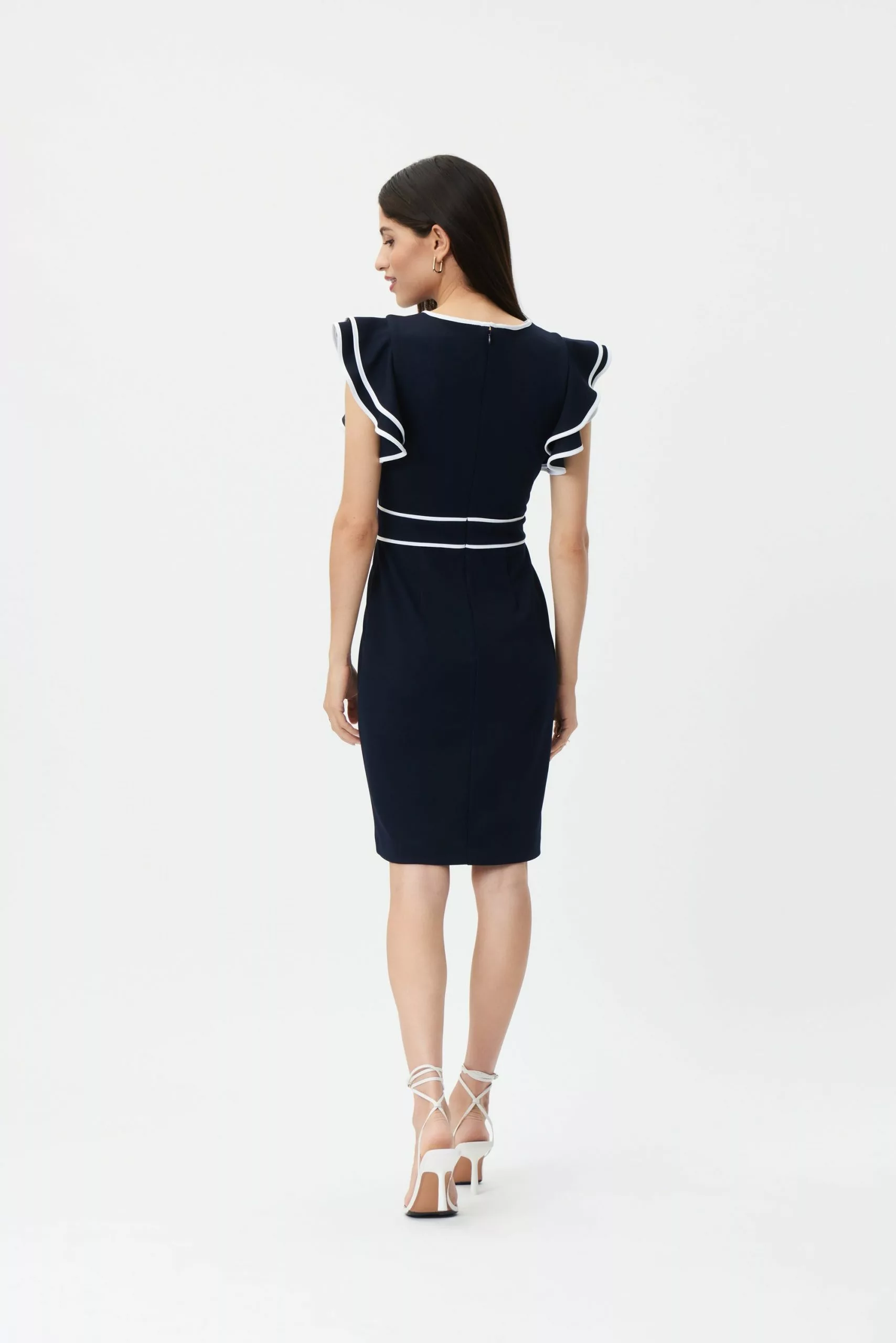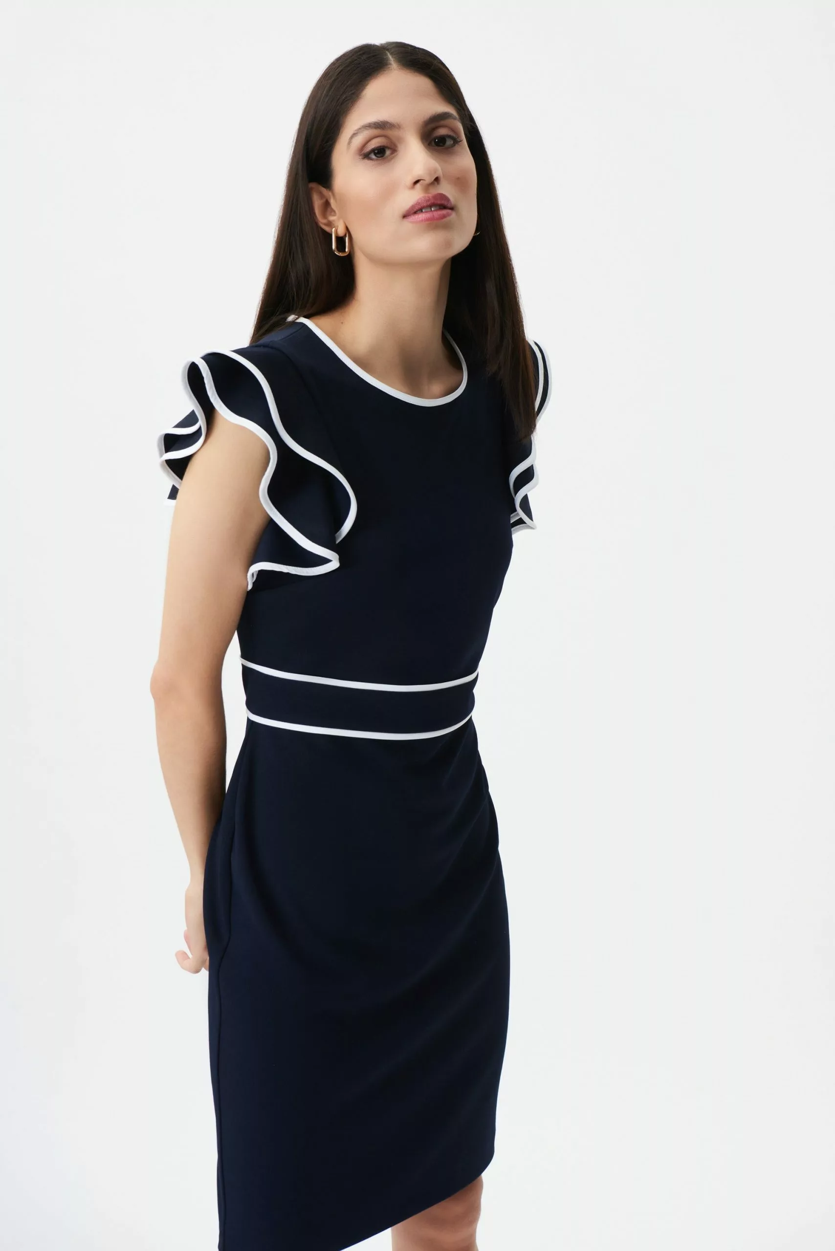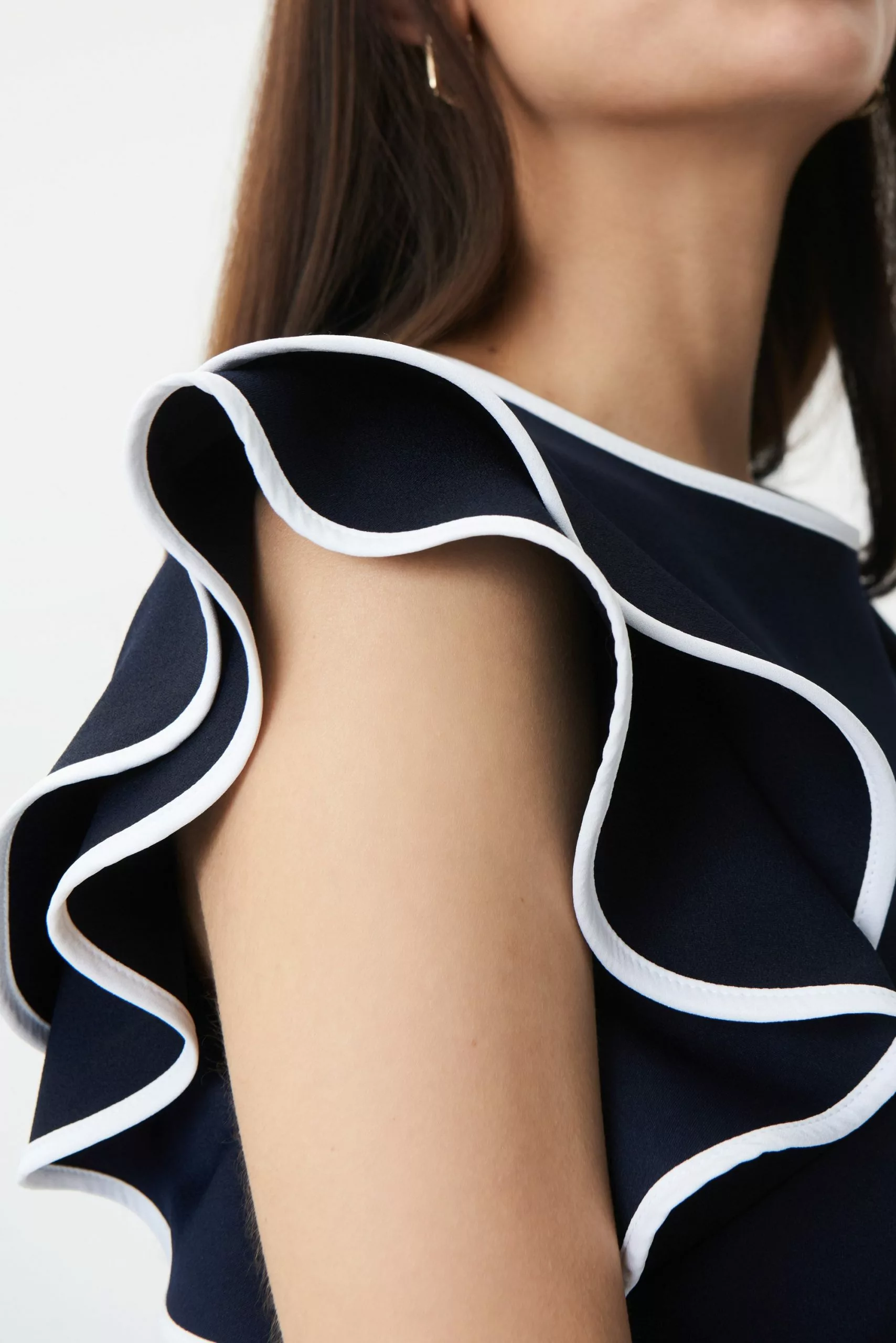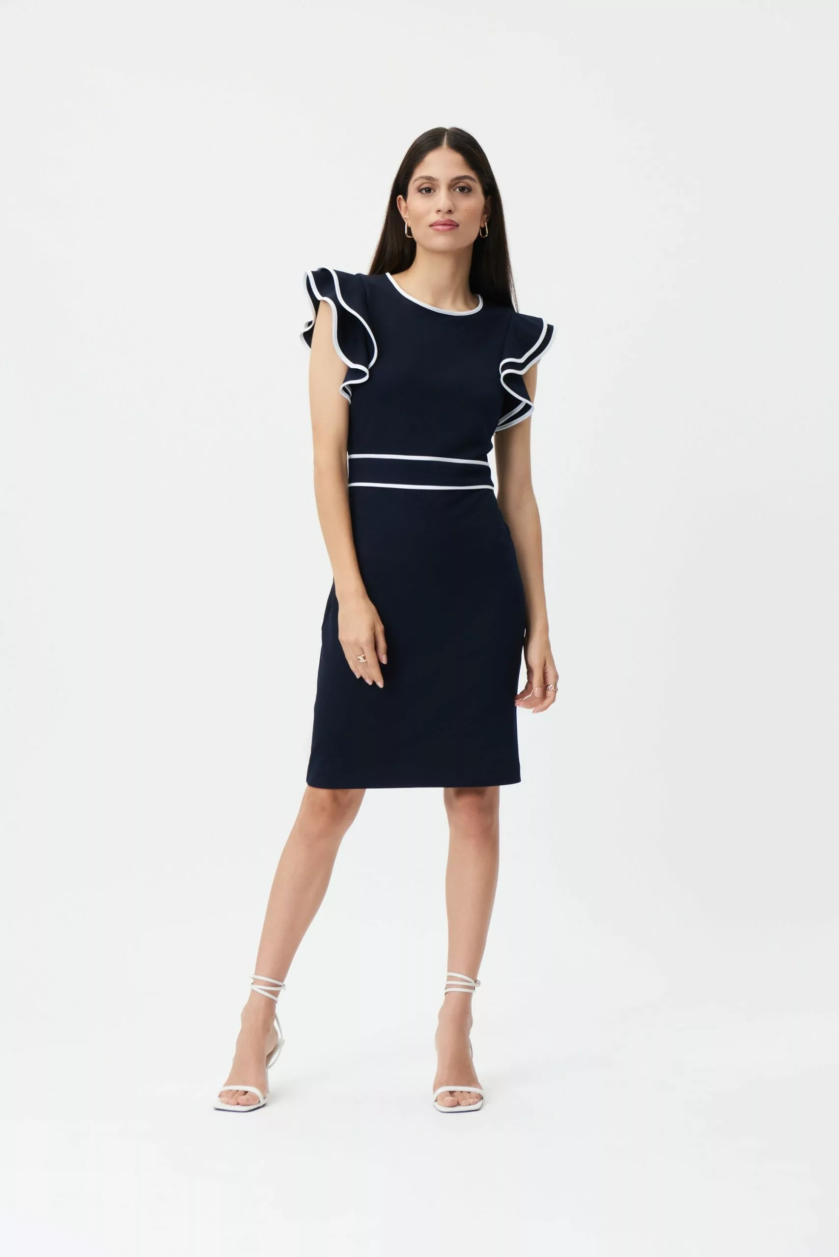 Klassieke jurk in donkerblauw met witte omrandingen. De sierlijke mouw met gegolfde mouwen maakt deze jurk bijzonder. De jurk heeft een ritssluiting aan de achterzijde en valt tot rondom de knie. De stof is een mix van scuba en georgette.