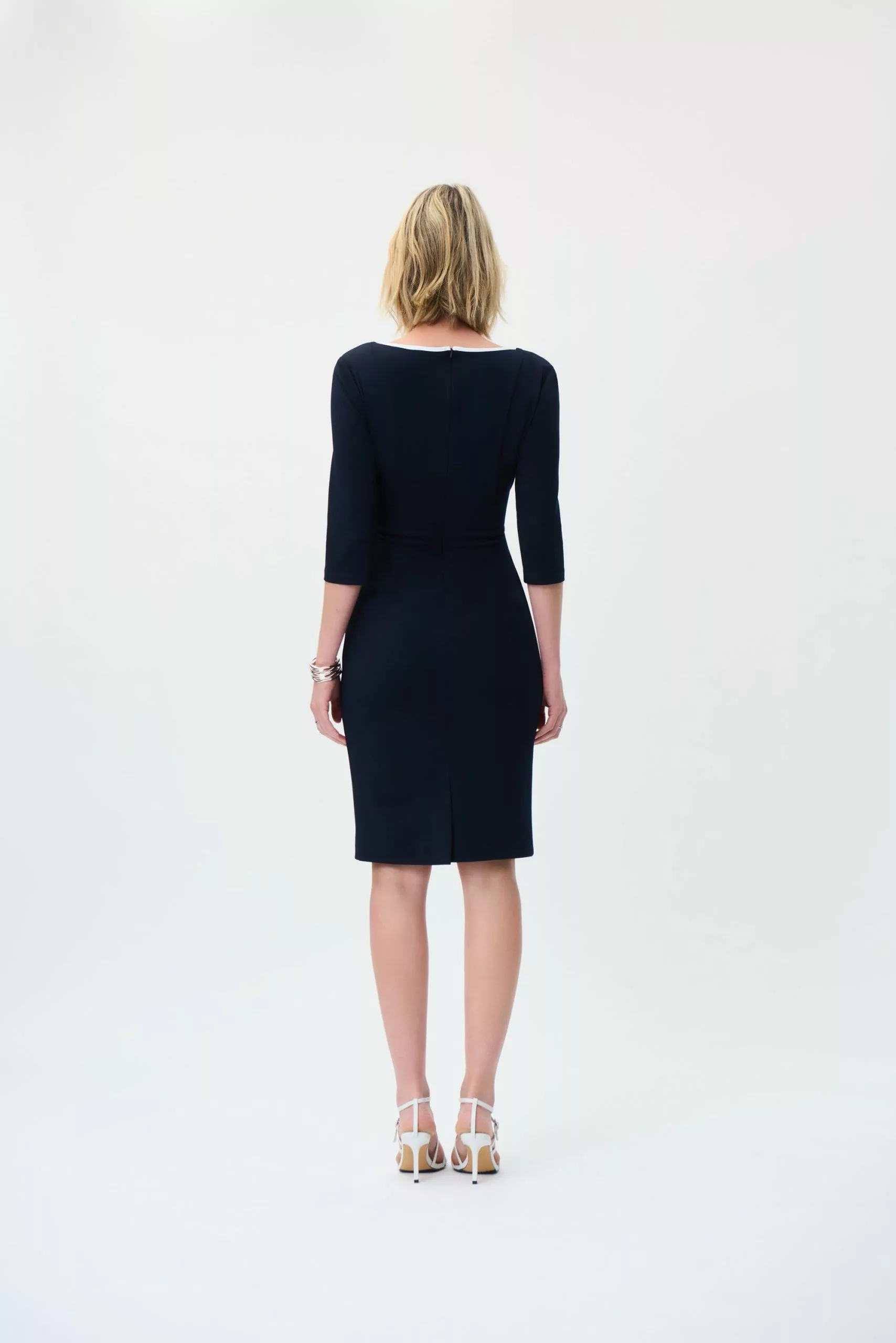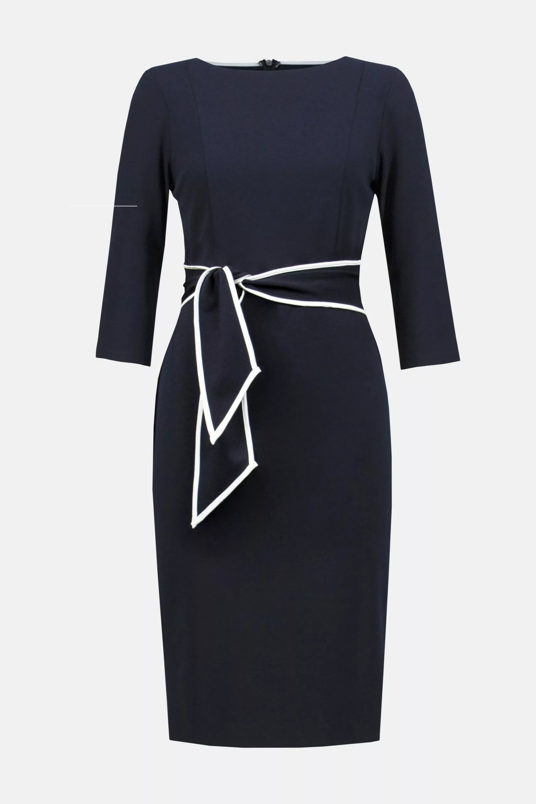 Loop je volgende sociale evenement binnen en voel je elegant en gecomponeerd in deze zwart-witte schedejurk. De sjerp met vanille georgette binding gebonden in de taille samen met de ronde halslijn met bijpassende binding zorgen voor een eenvoudig maar gedurfd statement. De onder-de-knie lengte van deze jurk maakt het perfect voor elke gelegenheid, of het nu voor het kantoor of een etentje is.