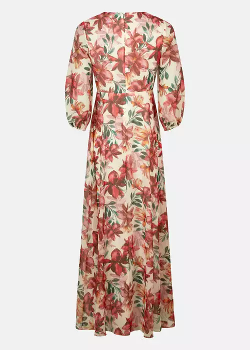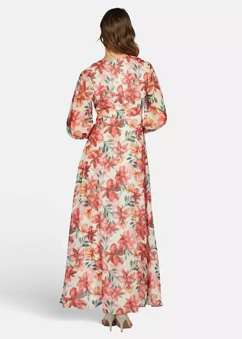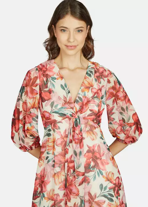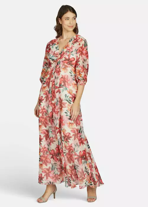Deze maxi jurk met vrolijke bloemenprint heeft een knoopdetail onder de boezem waardoor de jurk in een twist valt. De jurk heeft een korte mouw, heeft een v-hals en is gevoerd.