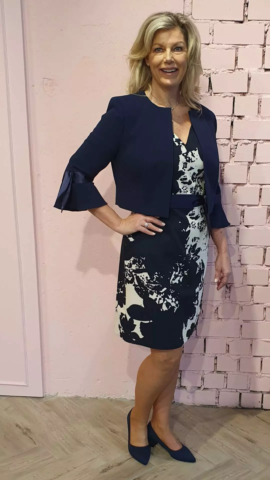 Cocktail jurk van Linea Raffaelli met prachtig donkerblauw bloemendessin op een offwhite ondergrond. In de taille zit een satijnen band. De jurk heeft verder een ritssluiting aan de achterzijde, v-hals, korte mouw en valt tot rondom de knie. Wij verkopen de lange mantel zoals afgebeeld op de foto niet maar hebben hiervoor een korter bijpassend jacket.