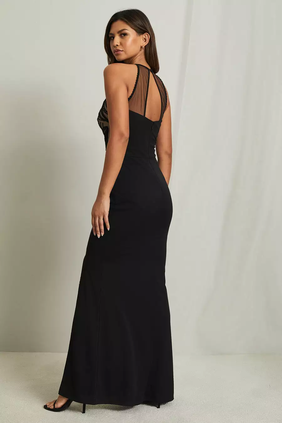 Deze aangesloten maxi jurk heeft een prachtige en gat vanuit de taille over in een zwarte rok met een split tot nom de knie.