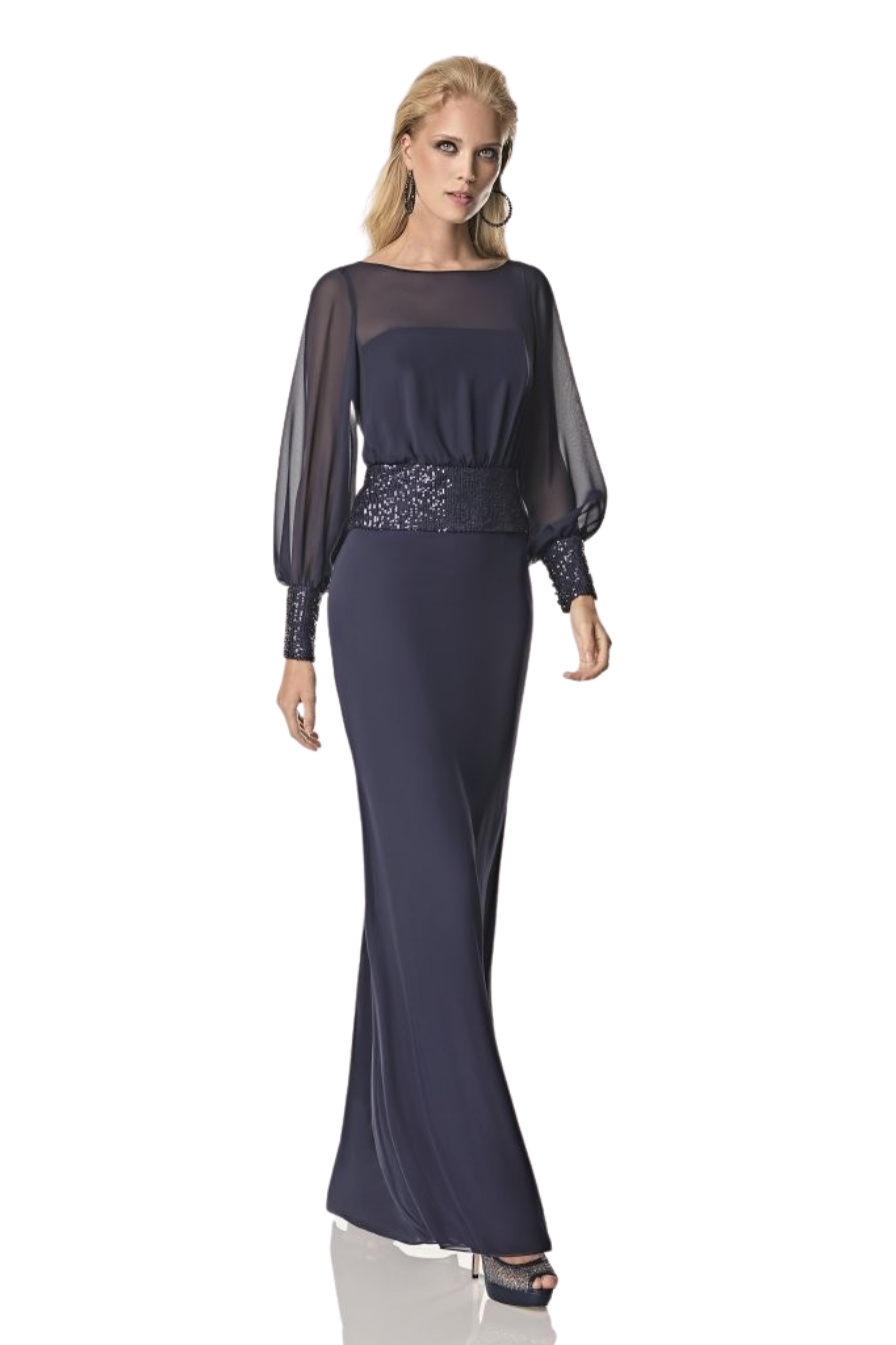 Avondjurk van crepe materiaal en lovertjes afwerking aan de mouwen en in de taille.