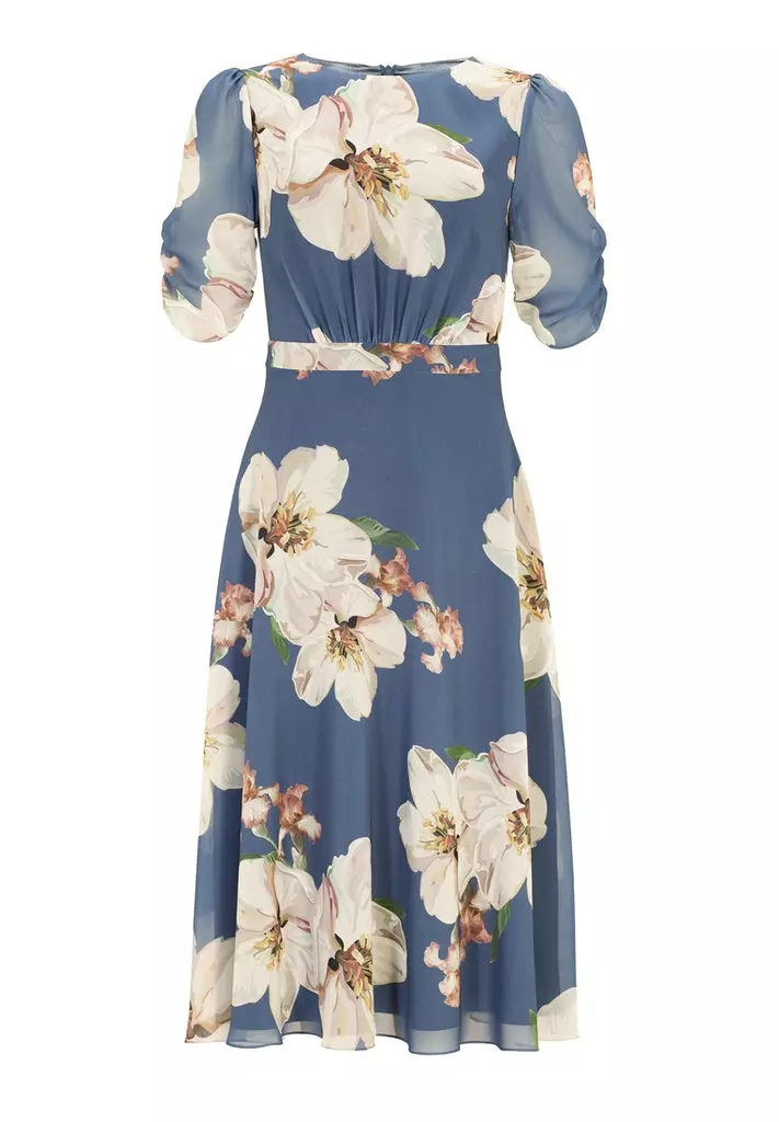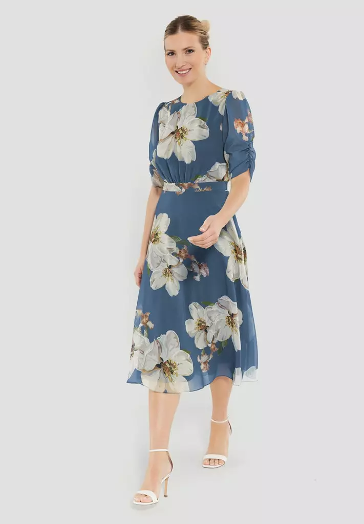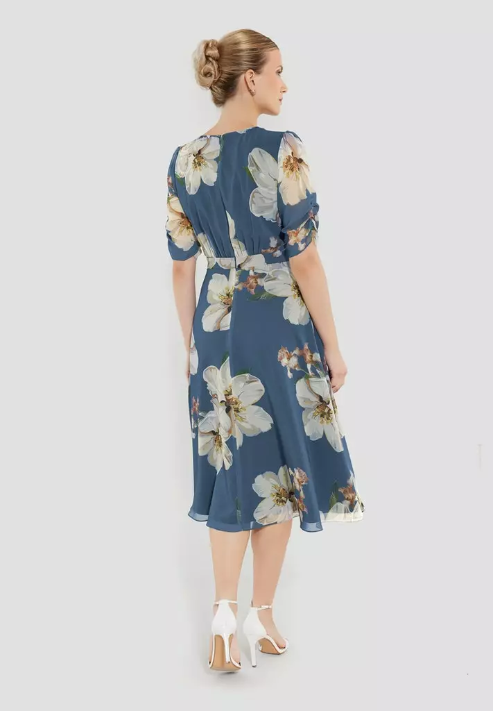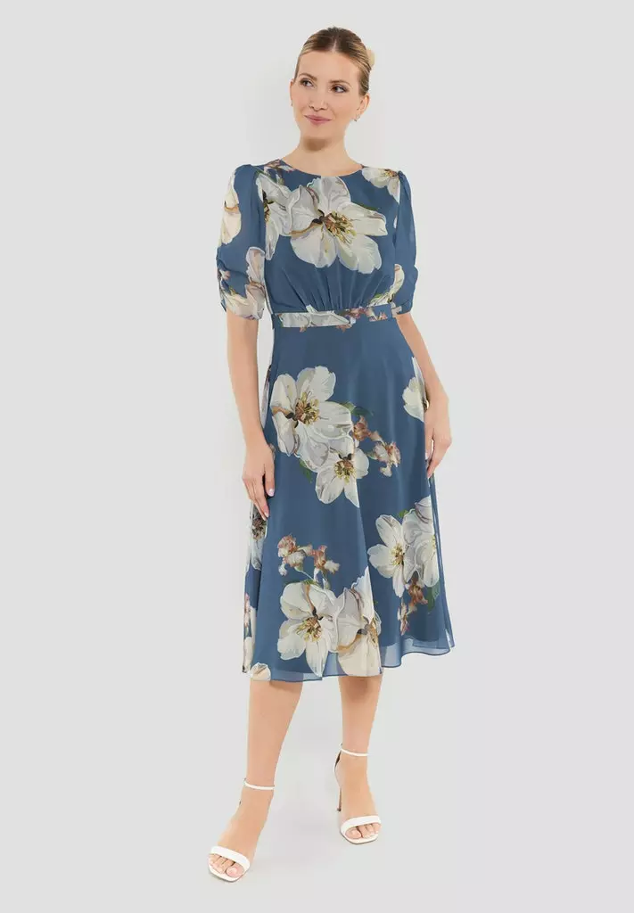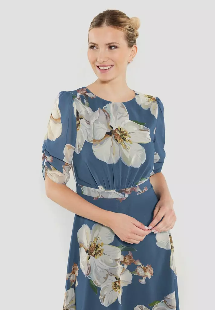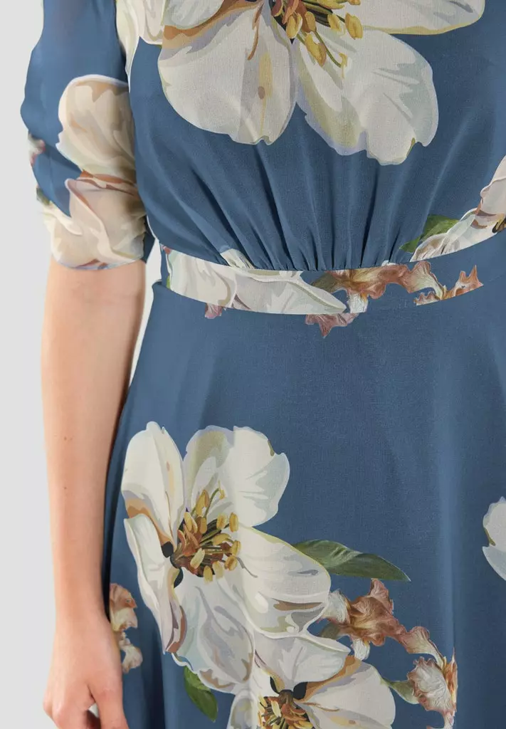 Midi jurk met bloemenprint en drie kwart chiffon mouw. Deze jurk heeft een getailleerde taille en loopt vanuit daar soepel uit. Een model dat ook heel leuk dat makkelijk te combineren is ook voor casual kleedmomenten.