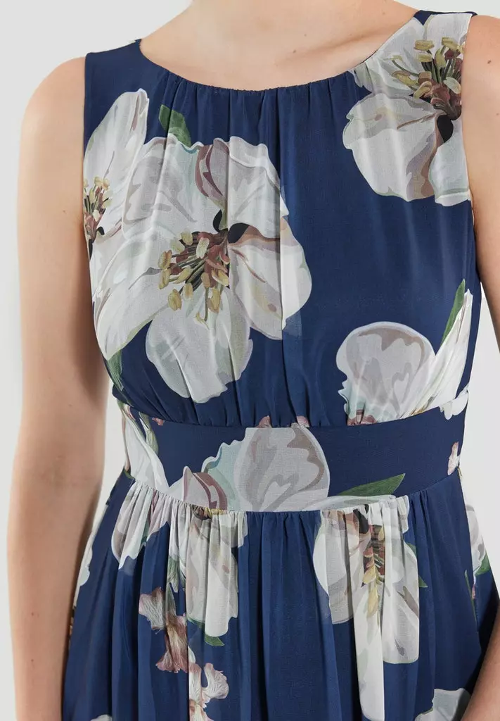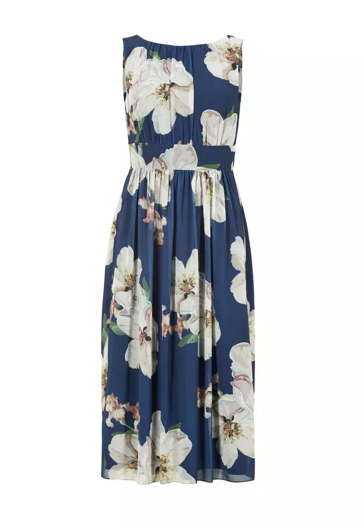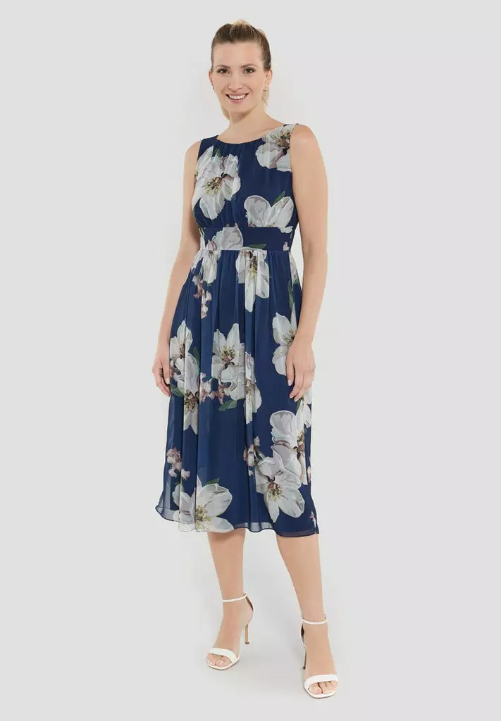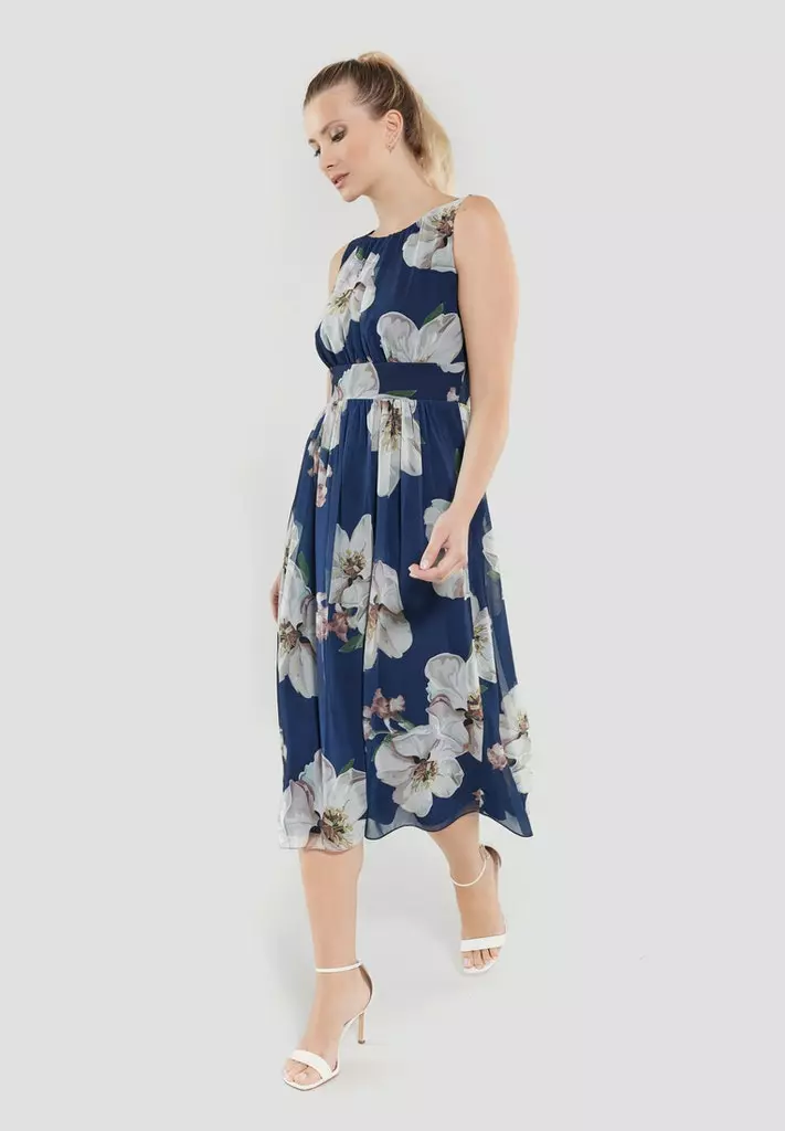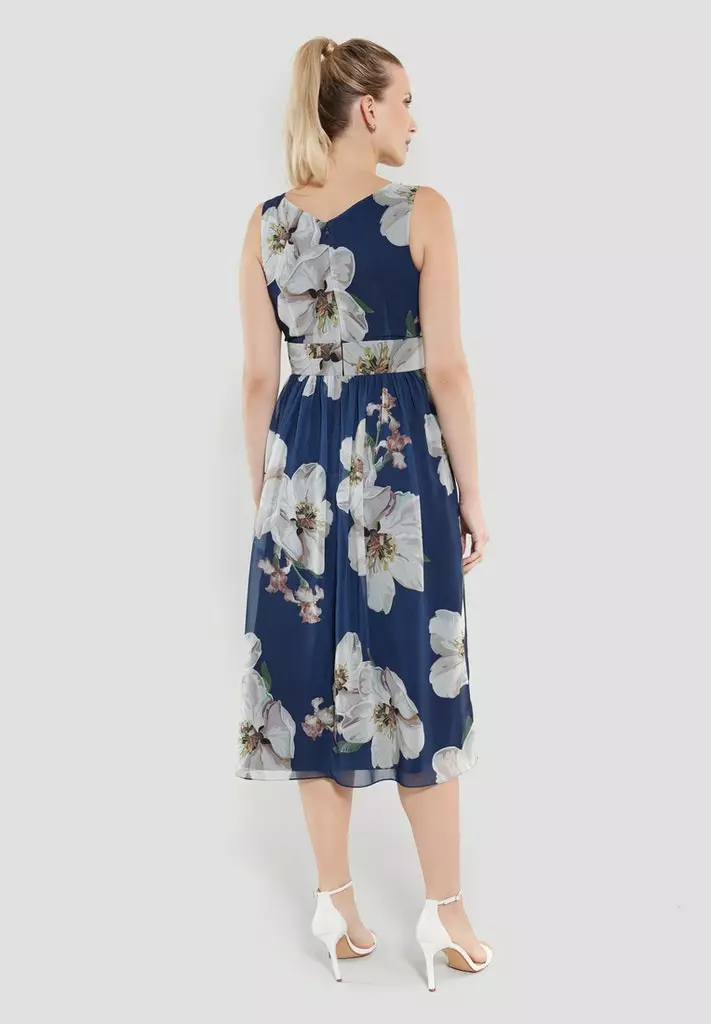 Jurk op knielengte met bloemenprint waarin de taille mooi getailleerd zit en vanuit daar losjes lang het lijf valt. De jurk is mouwloos en heeft een ritssluiting aan de achterzijde.