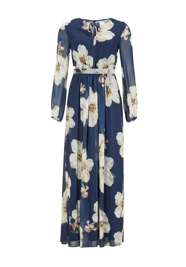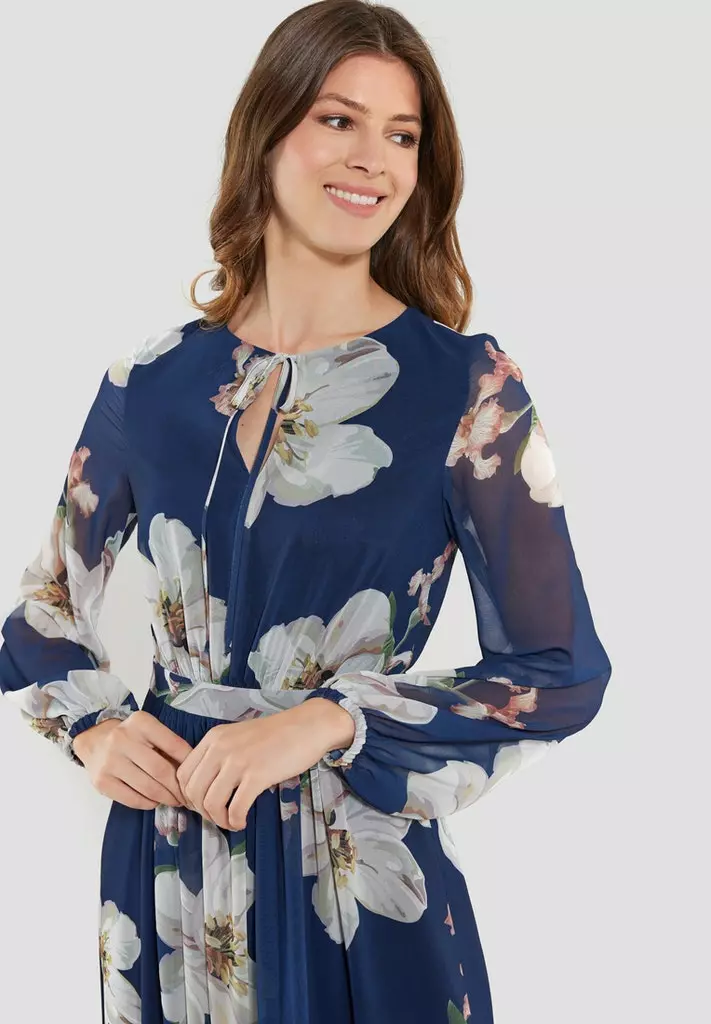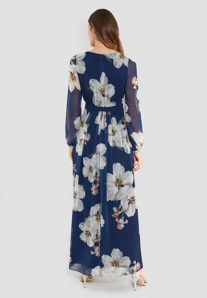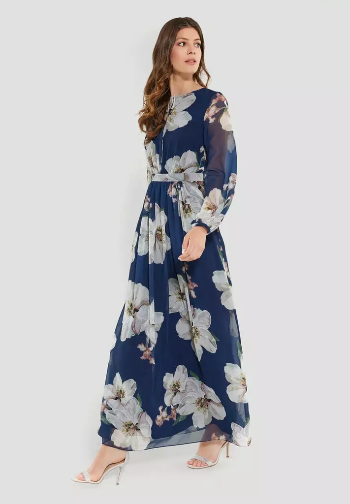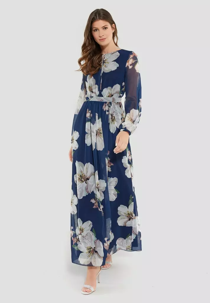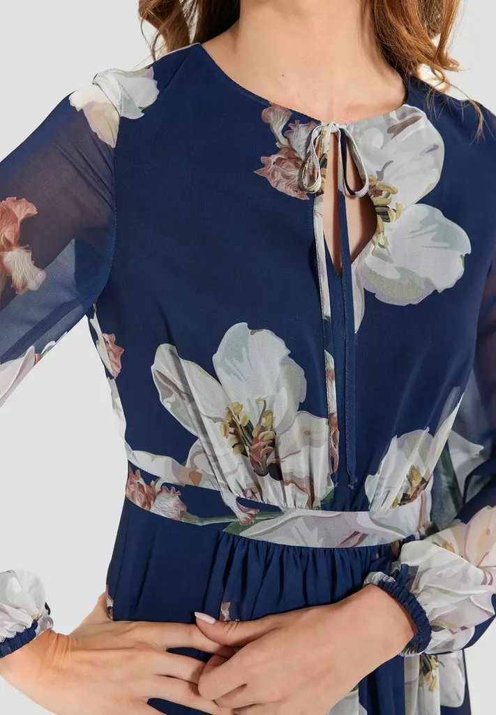 Maxi jurk met mooi bloemenprint. De jurk heeft een lange doorschijnende chiffon mouw en een getailleerde taille.