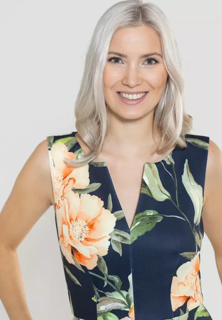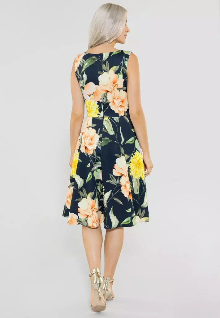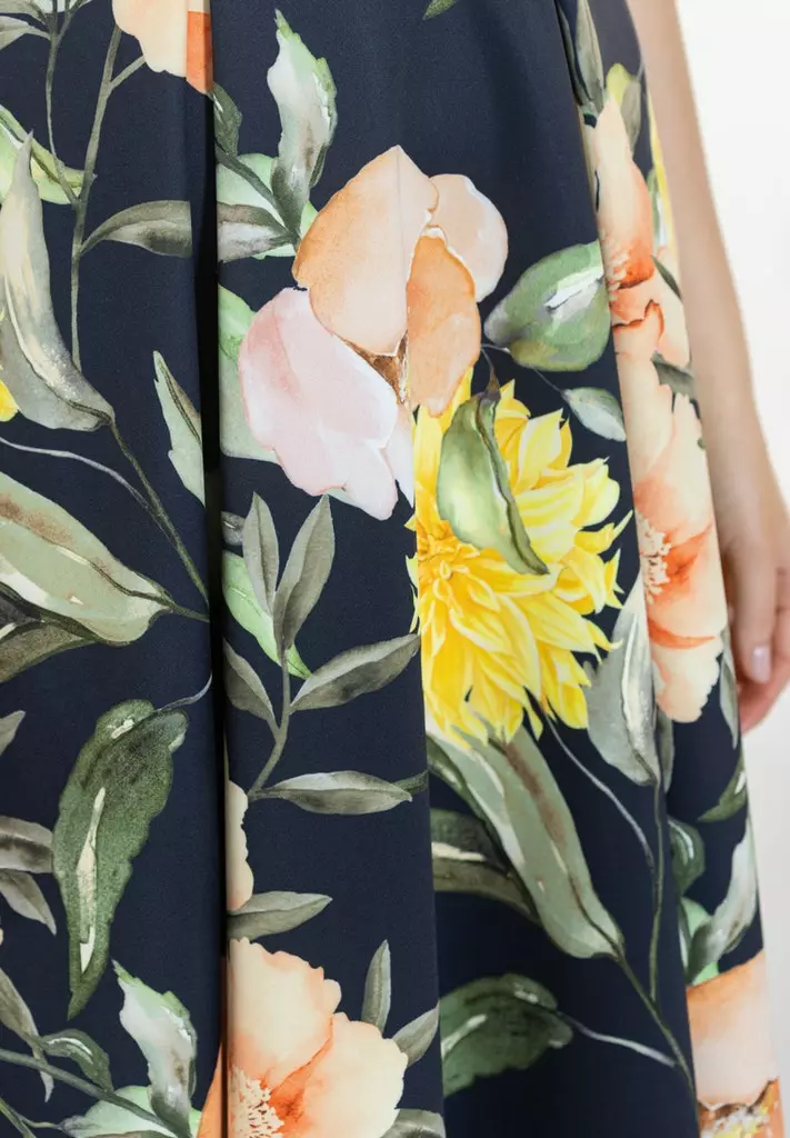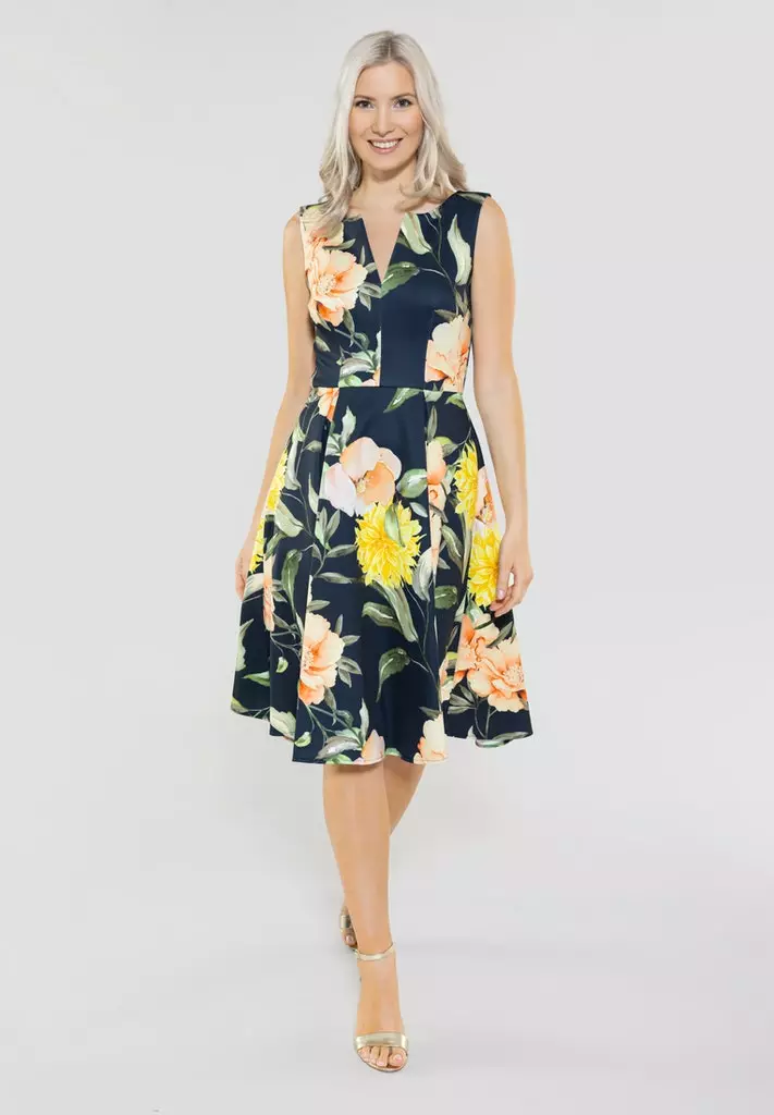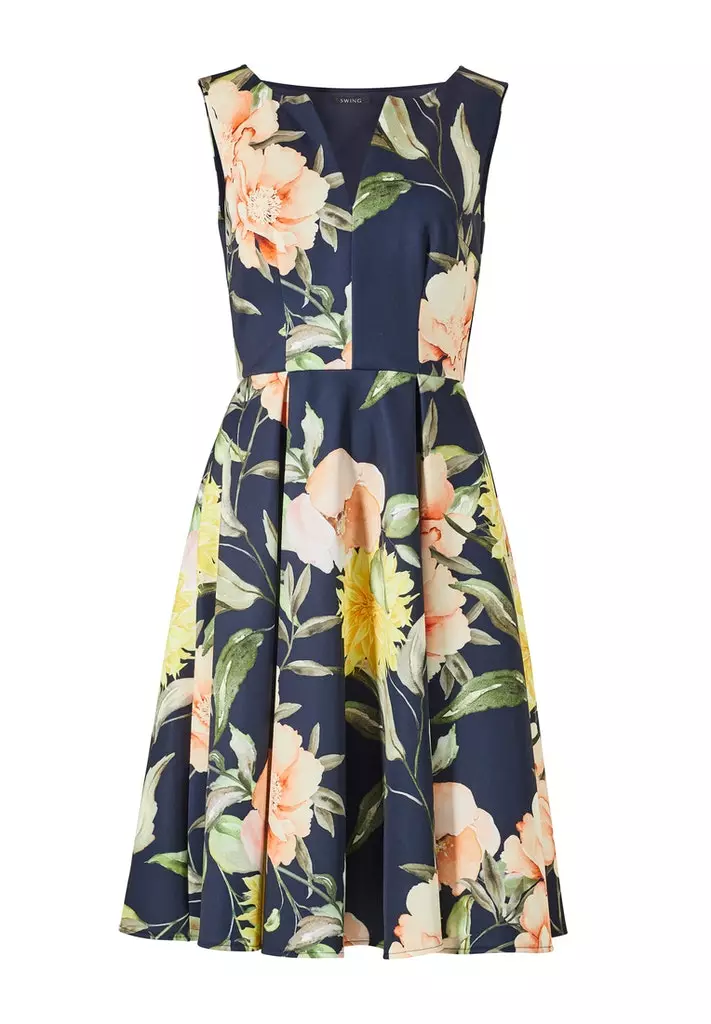 A-lijn jurk met prachtig bloemenmotief en bijzondere v0hals. De jurk loopt klokkend uit en valt soepel.