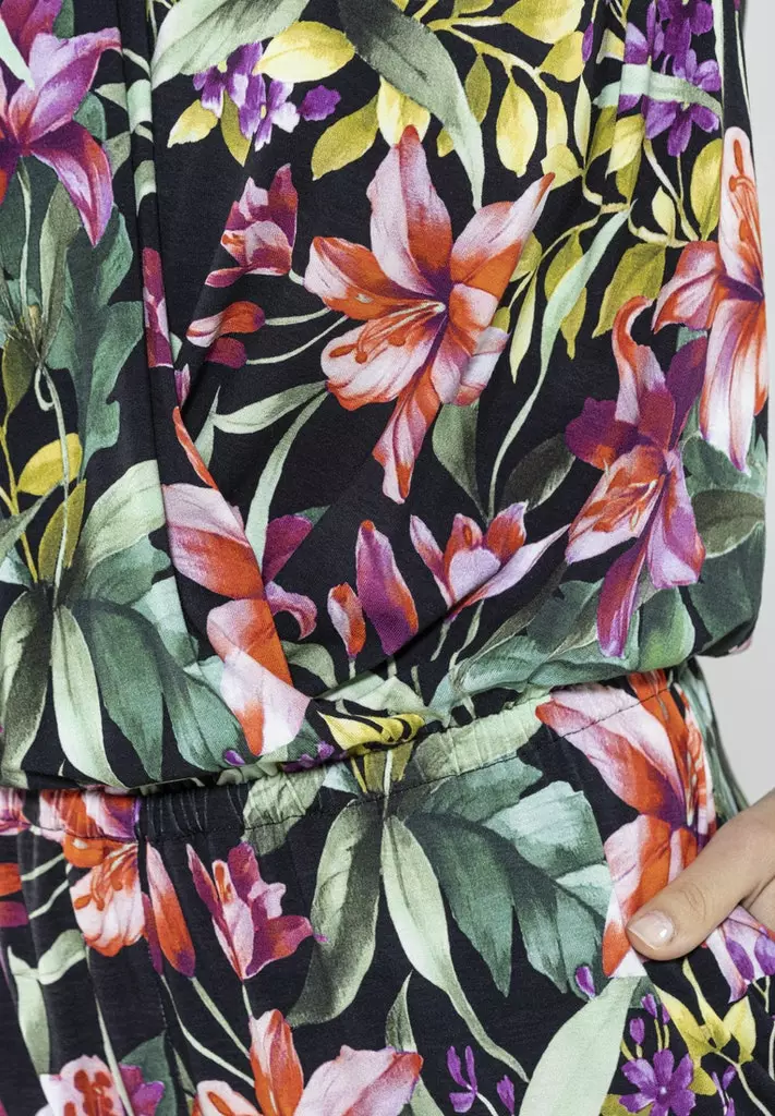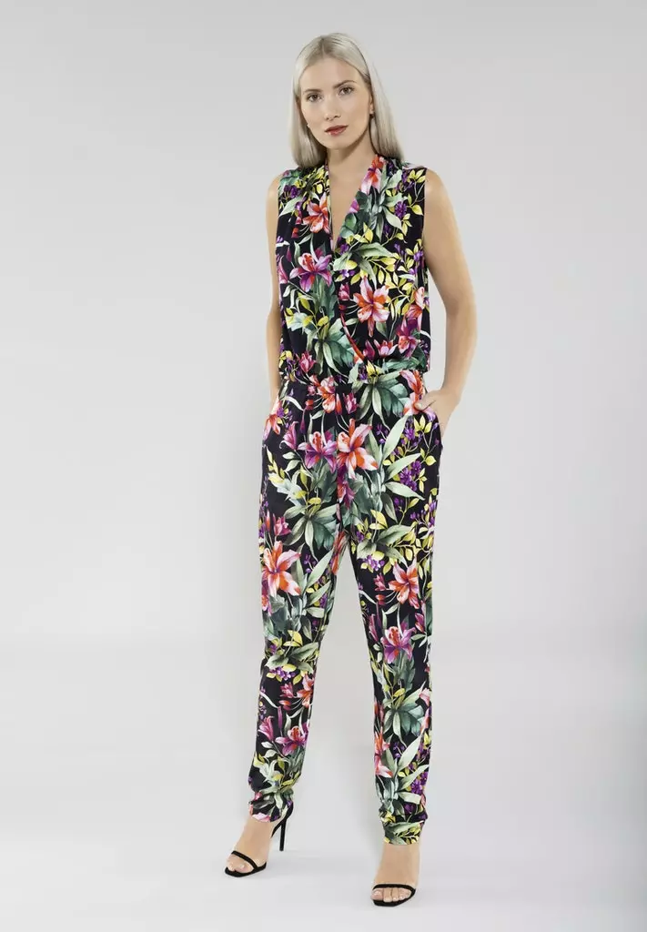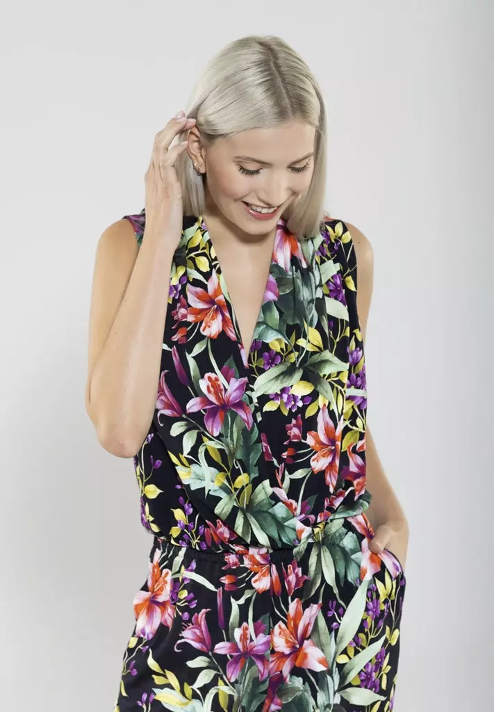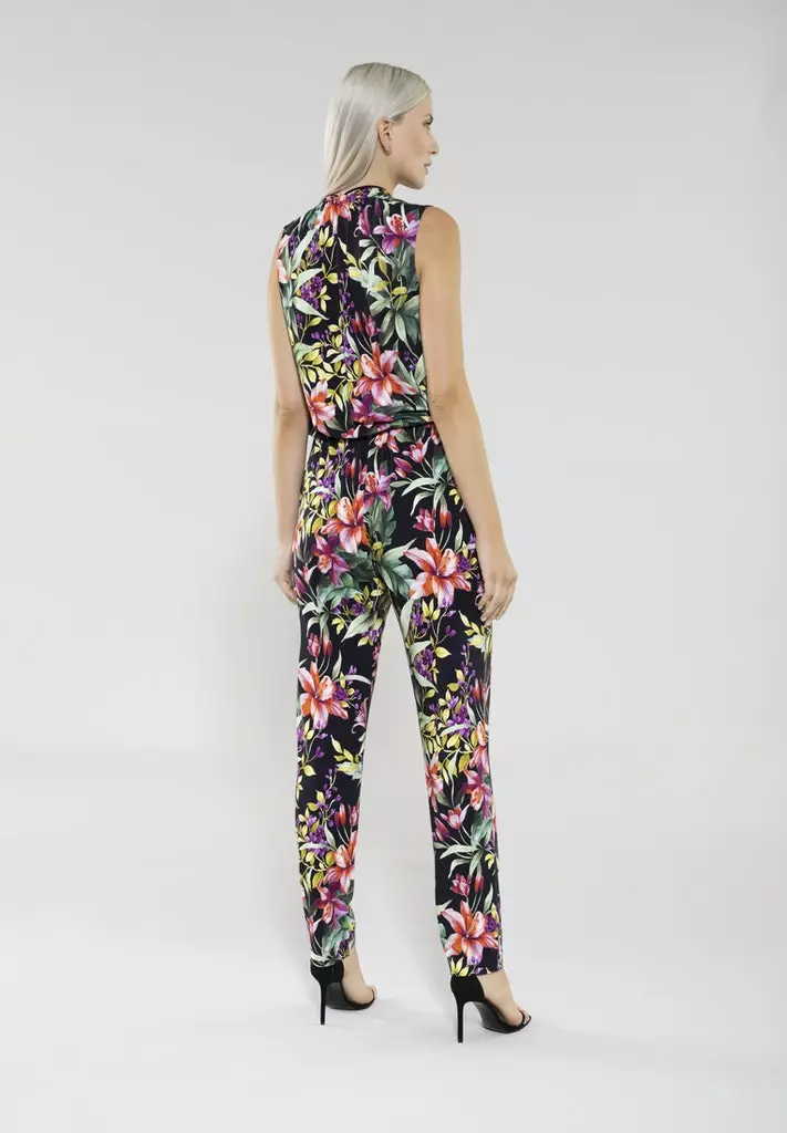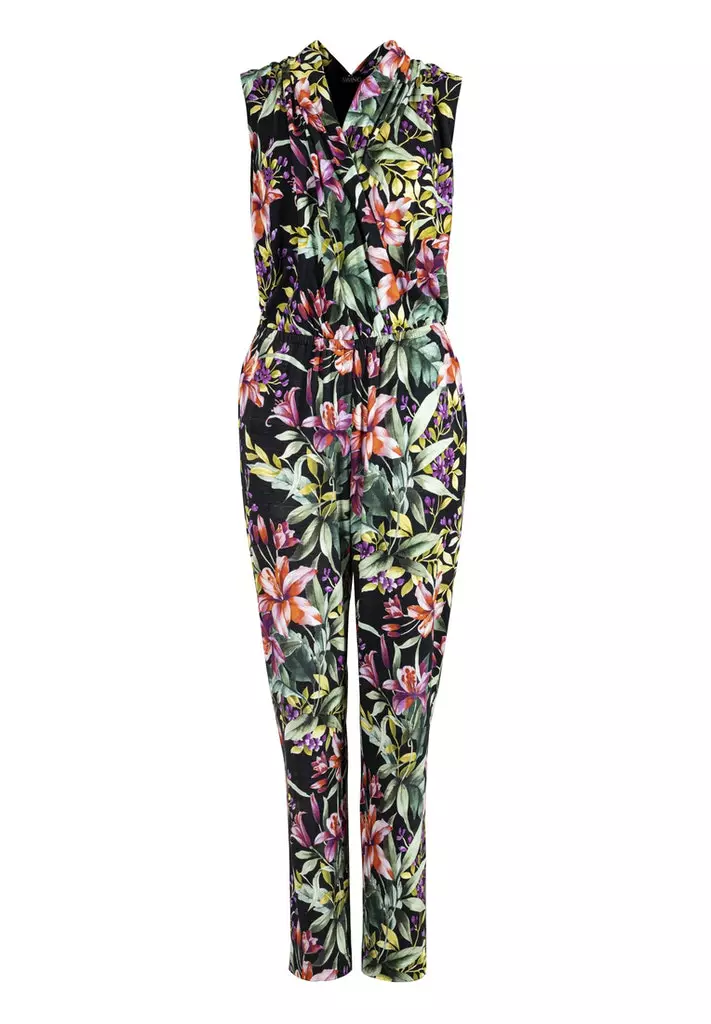 Prachtige jumpsuit van viscose jersey materiaal, ideaal voor de warme dagen! De jumpsuit wordt getailleerd door een elastische band die je naar wens kunt strikken, is mouwloos, heeft een v-hals en valt tot op de schoen.