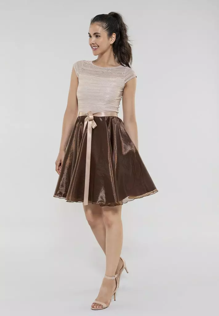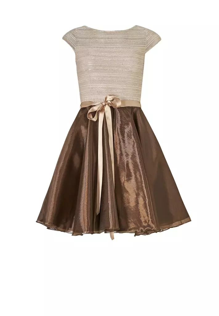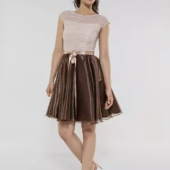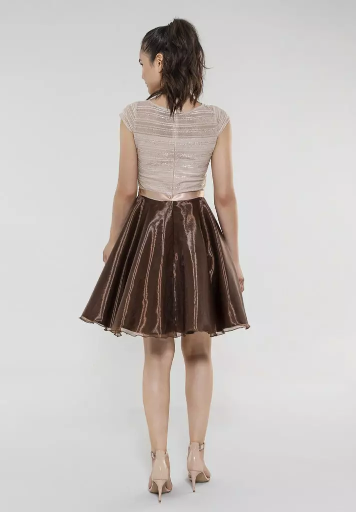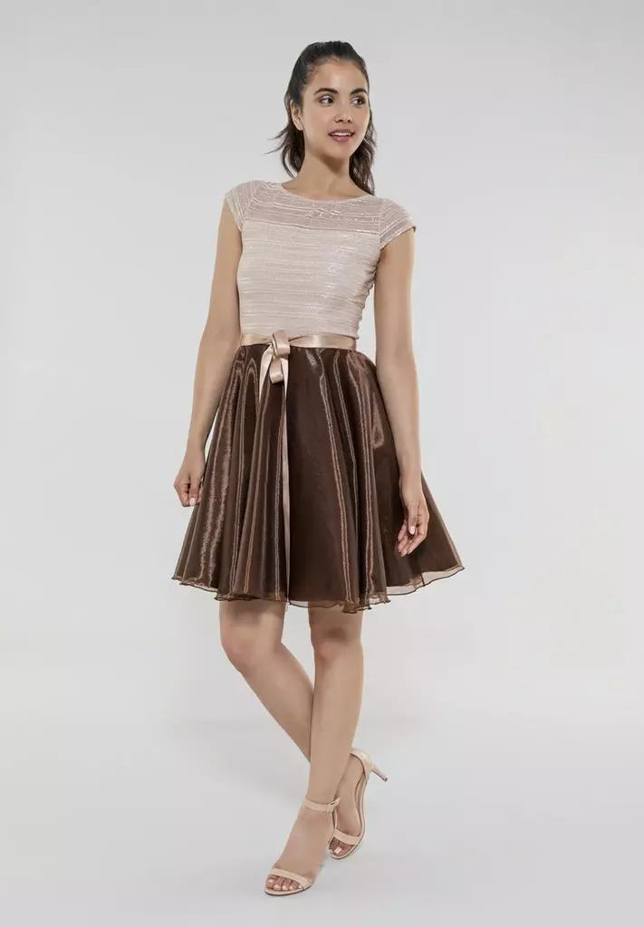 A-lijn jurk met een top waarin lurex draden zijn geweven om een prachtige glans te geven met vanuit de getailleerde taille een uitlopende bruine taft rok. Verder heeft de jurk een kapmouw, valt deze rond de knie en heeft de jurk een ritssluiting aan de achterzijde. Zwierig, feestelijk en zeker een jurk waarin jij zult stralen!