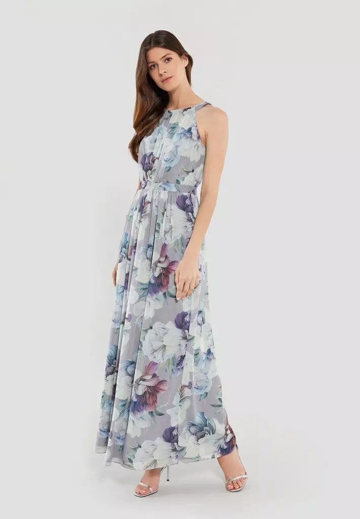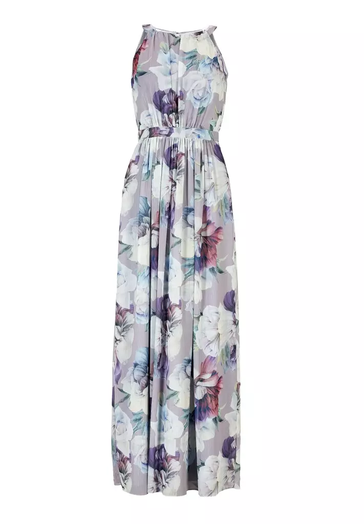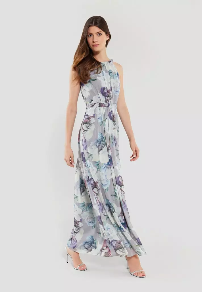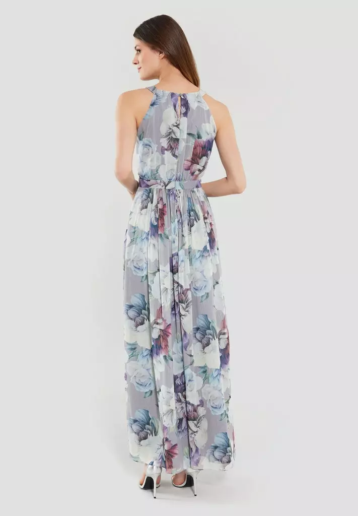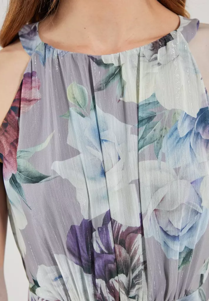 Maxi jurk met bloemendessin en glitterdraad door de stof geweven voor een extra feestelijk effect! De jurk heeft een amerikaanse halslijn en een tailleband die je taille extra mooi accentueerd.