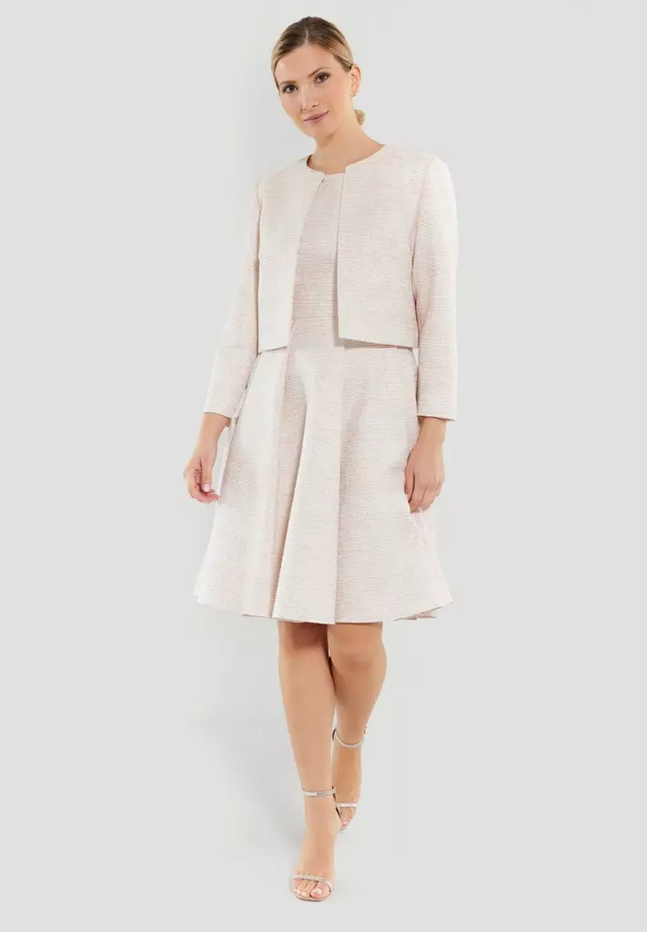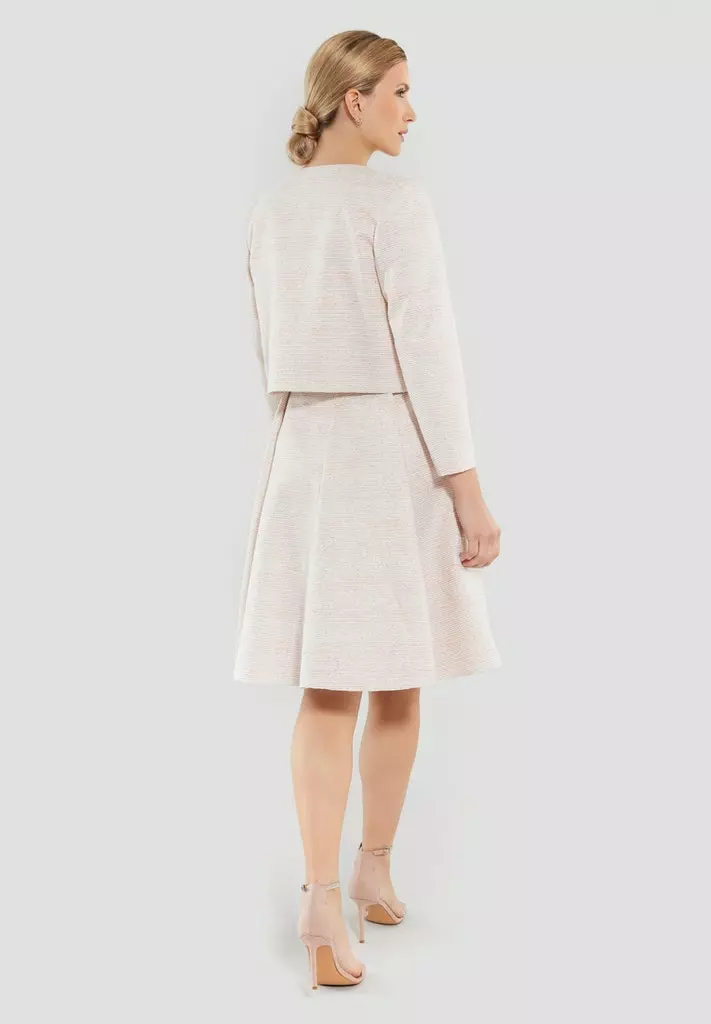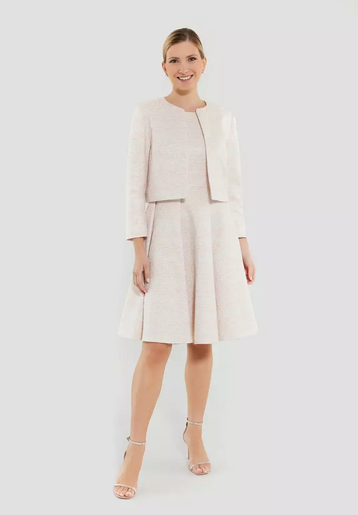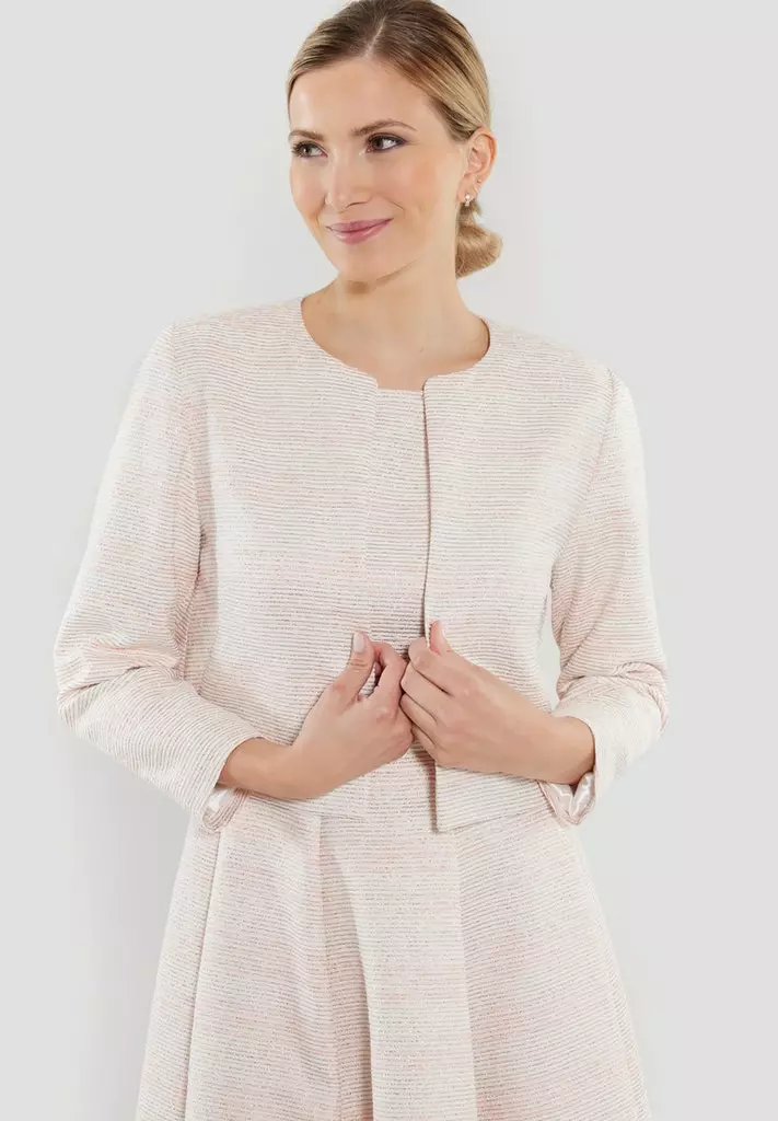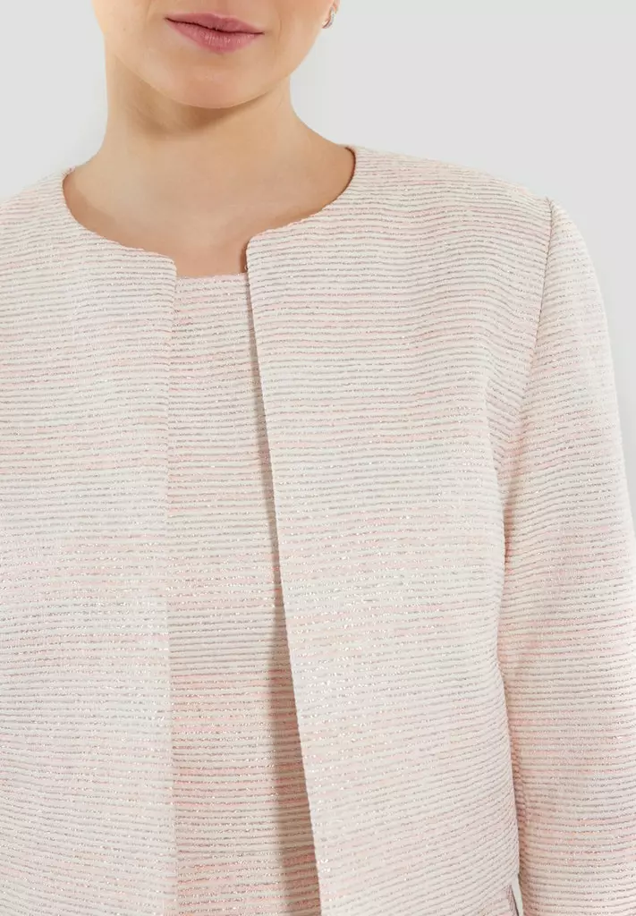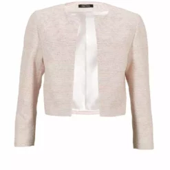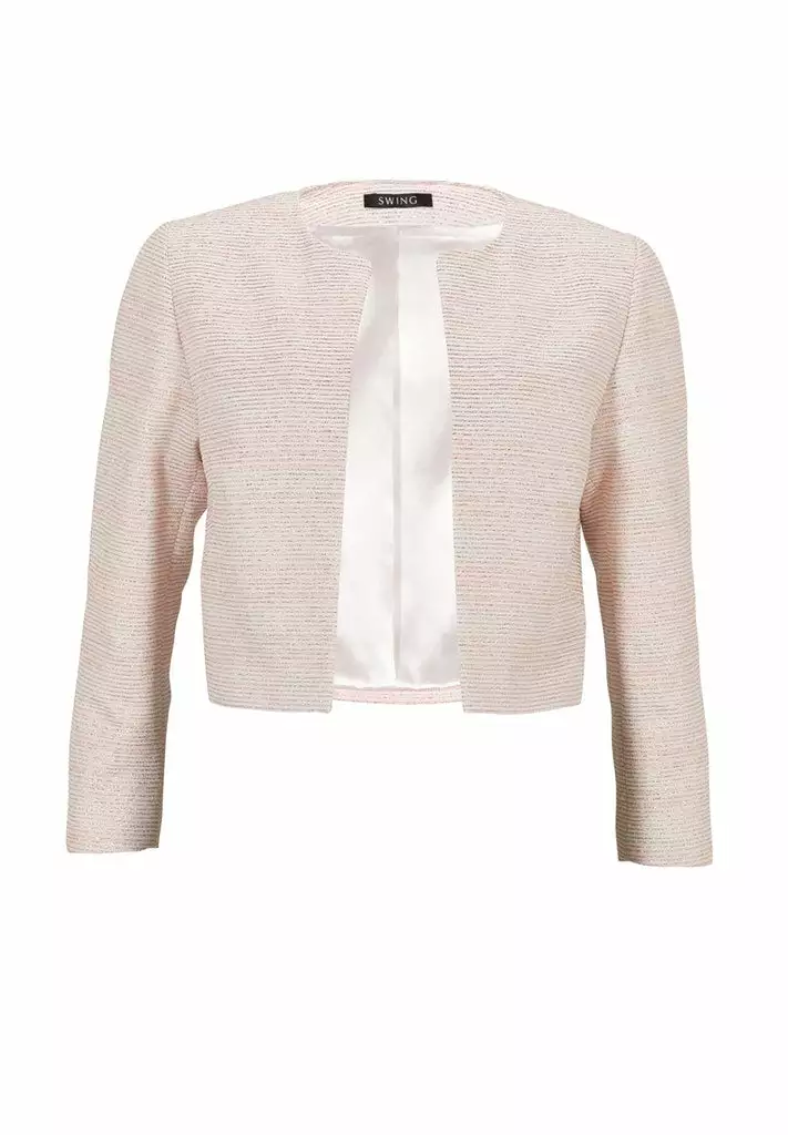 Kort bouclé jacket die iedere outfit extra allure geeft. Het jasje heeft een 3/4 mouw en valt open.