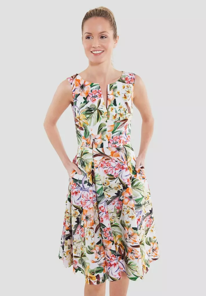 Mouwloze alijn jurk met prachtige kleurrijke bloemenprint die je zowel voor een gelegenheid of alledaags kunt dragen.