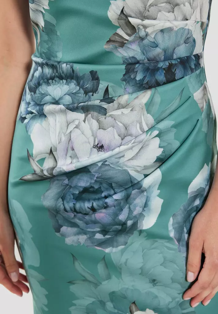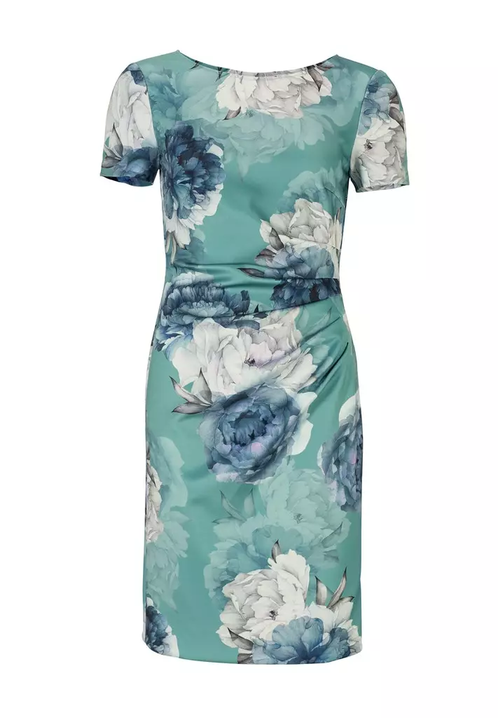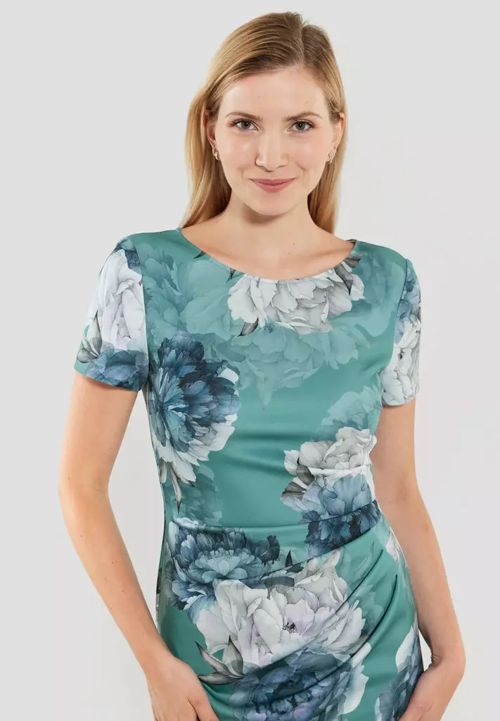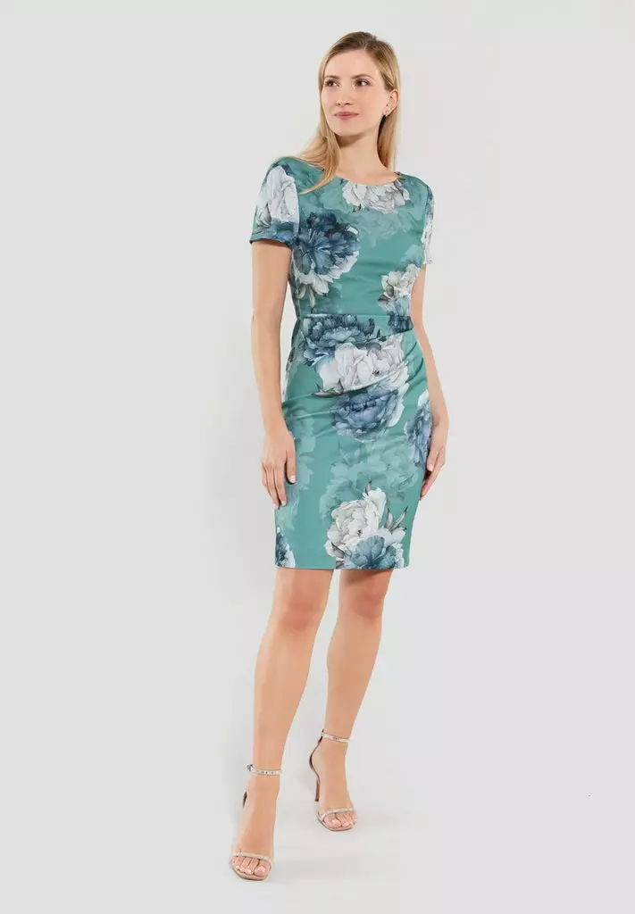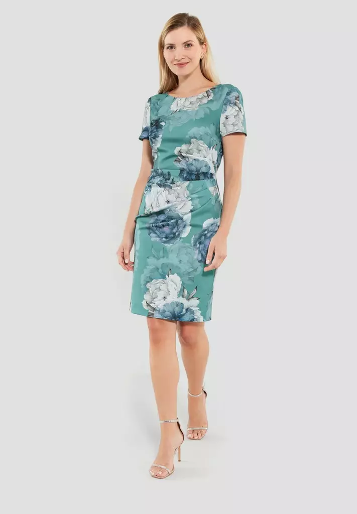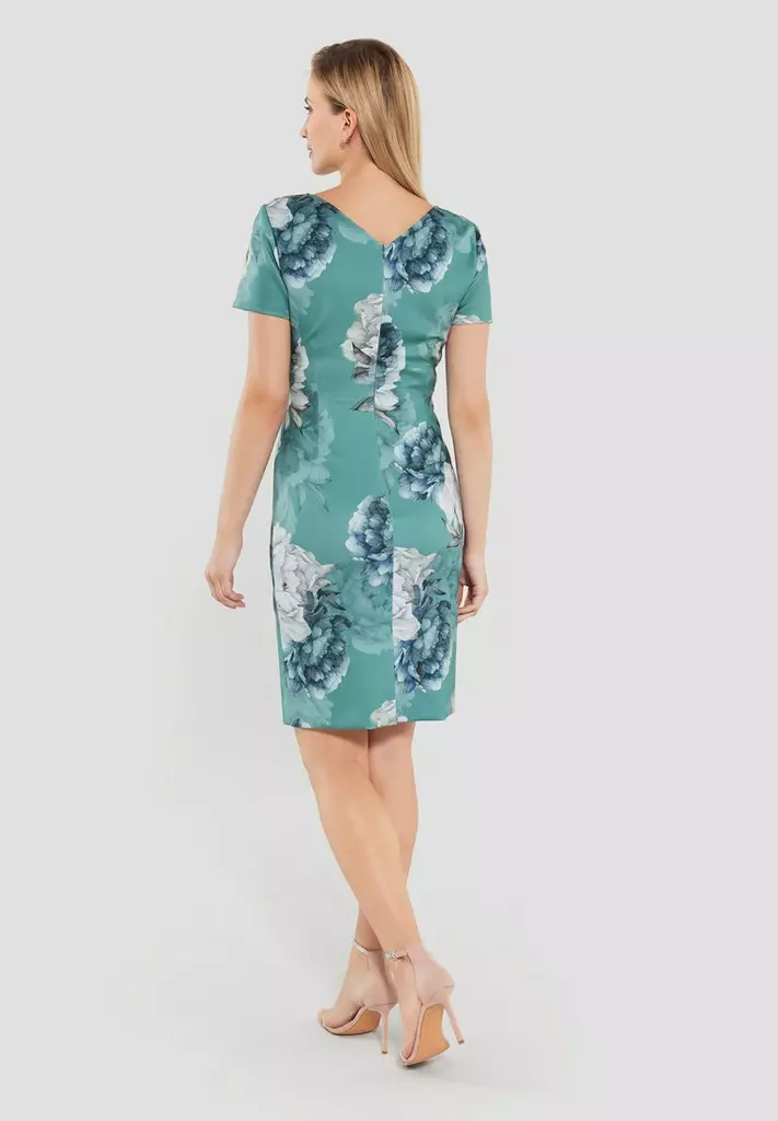 Cocktailjurk van scuba materiaal. De jurk heeft een korte mouw, valt op knielengte en heeft een ronde halslijn. De jurk valt mooi in je taille door de plooien en heeft een ritssluiting aan de achterzijde.