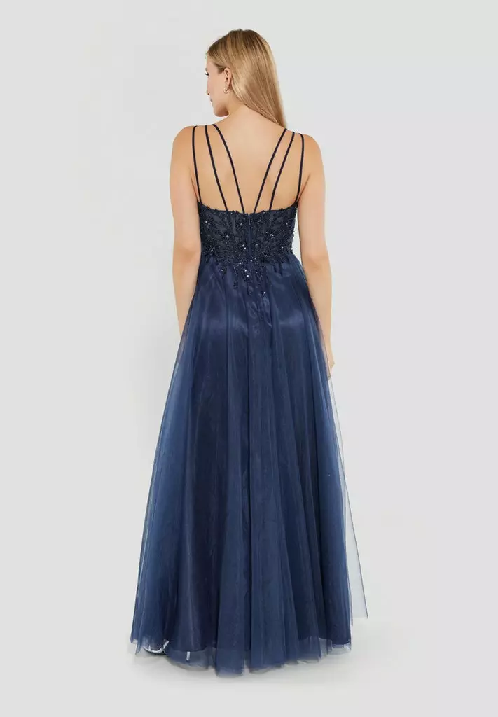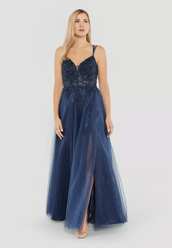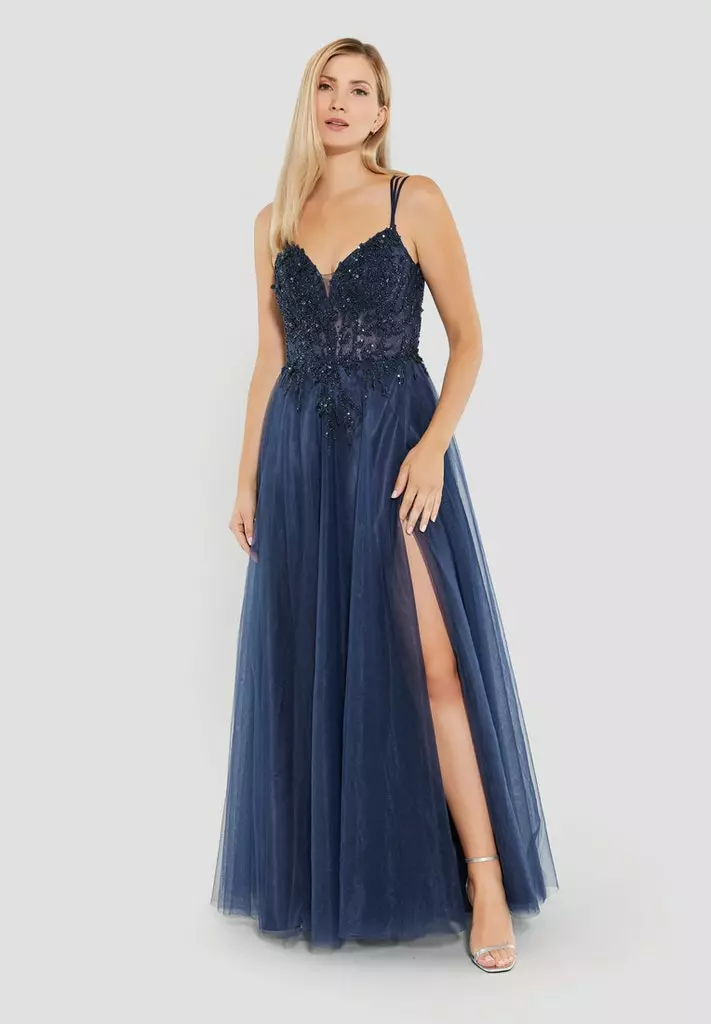 Prachtige gala jurk met hoge split. De bovenkant is prachtig met steentjes versierd. Een echte eye catcher.