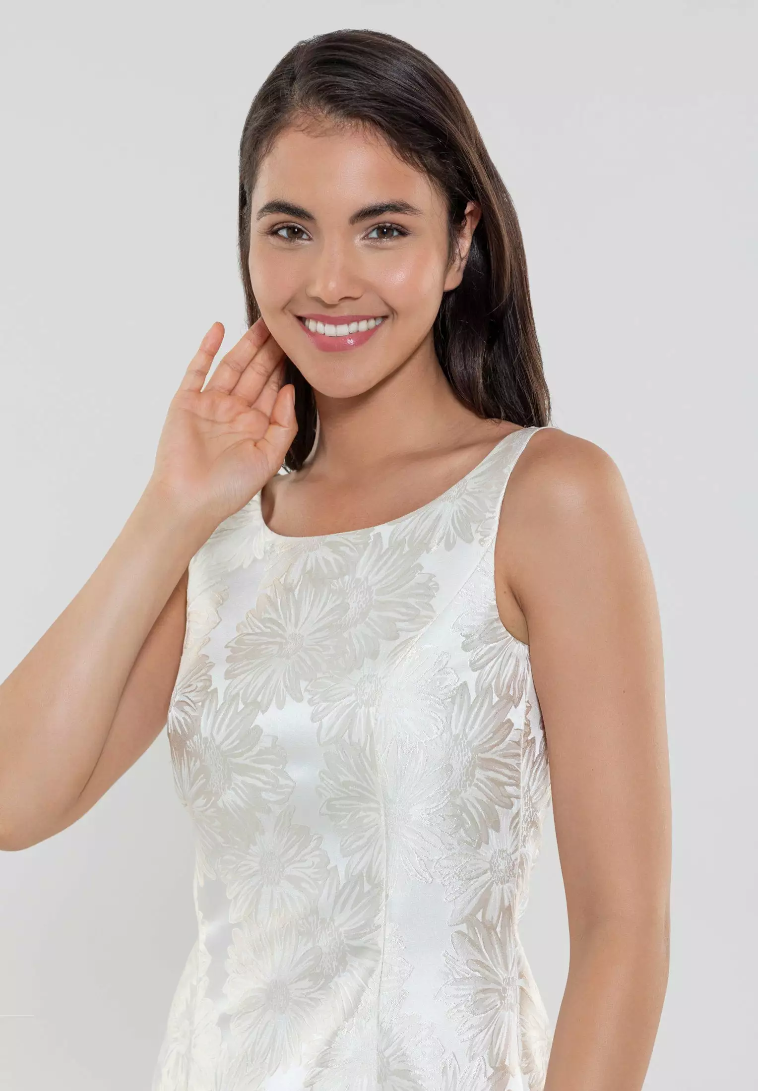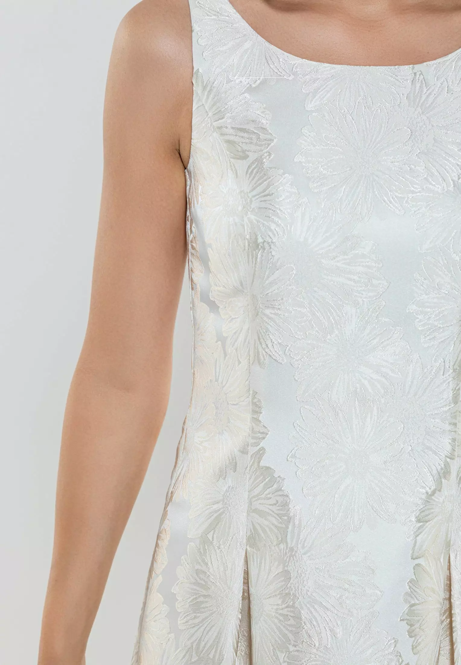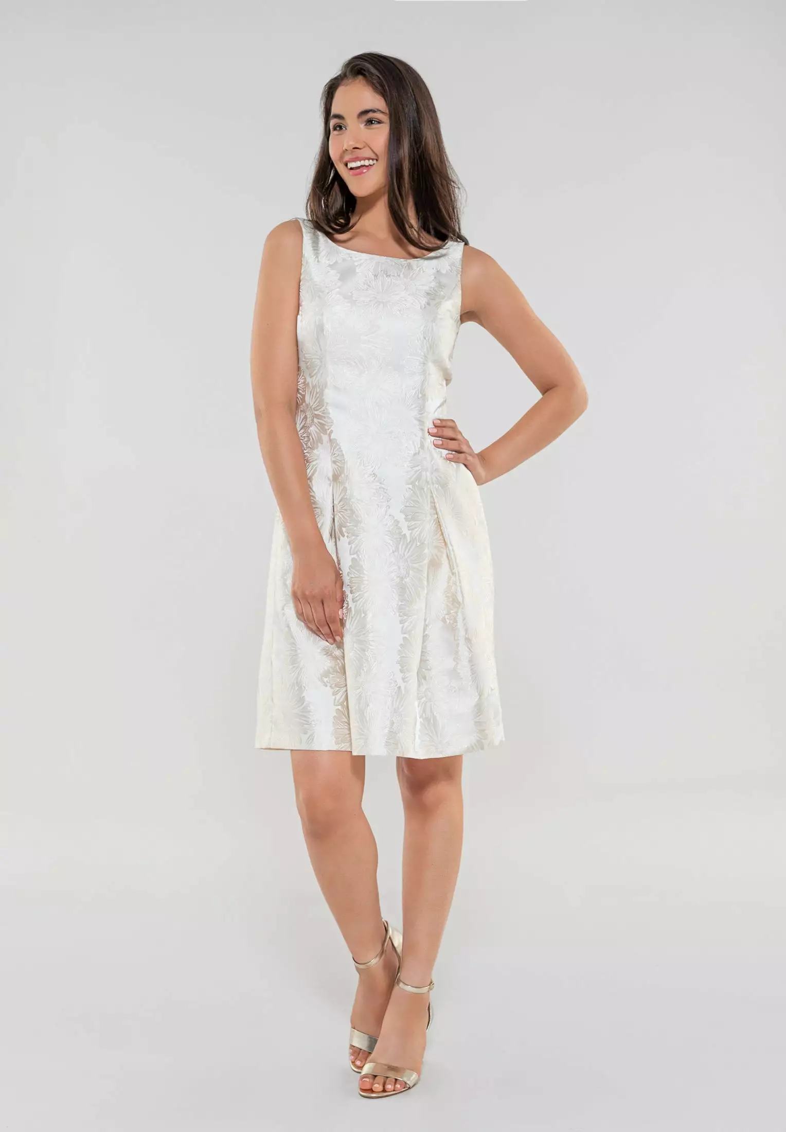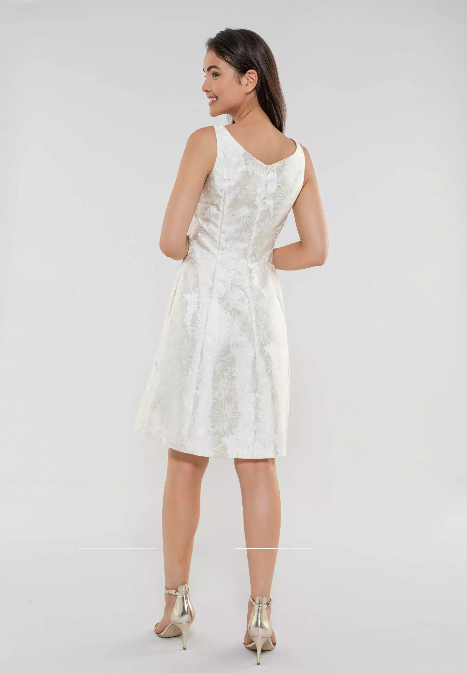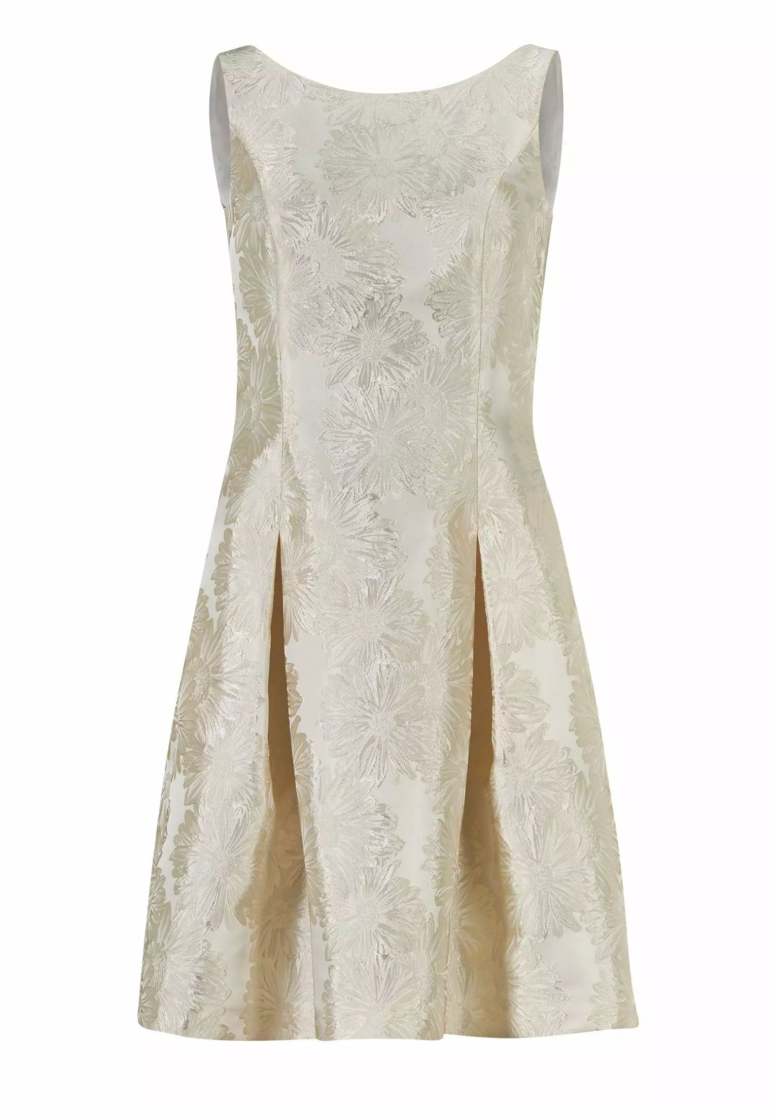 Jurk met bloemen jaquard in een a-lijn model. De jurk is mouwloos, valt op knie lengte en heeft een ronde halslijn. We hebben een bijpassende blazer jas bij deze jurk. De jurk heeft een blinde rits aan de achterzijde.