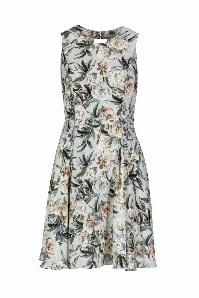 A-lijn jurk met prachtige bloemenprint. De achtergrond kleur is mint en de bloemen zijn licht van kleur, omhult door groene bladeren. De jurk zit aangesloten aan de top kant en loopt zwierig uit vanuit de taille.