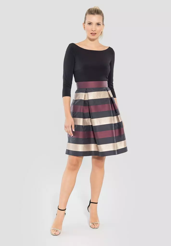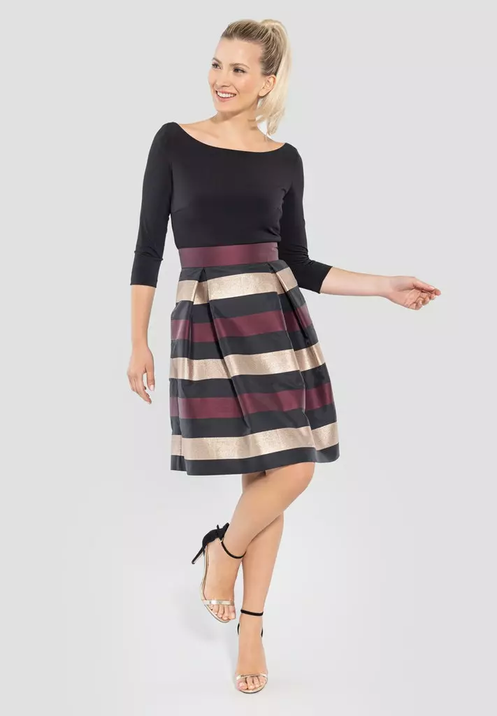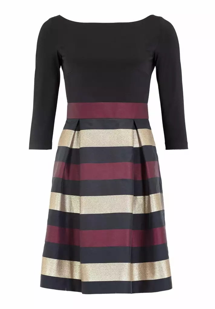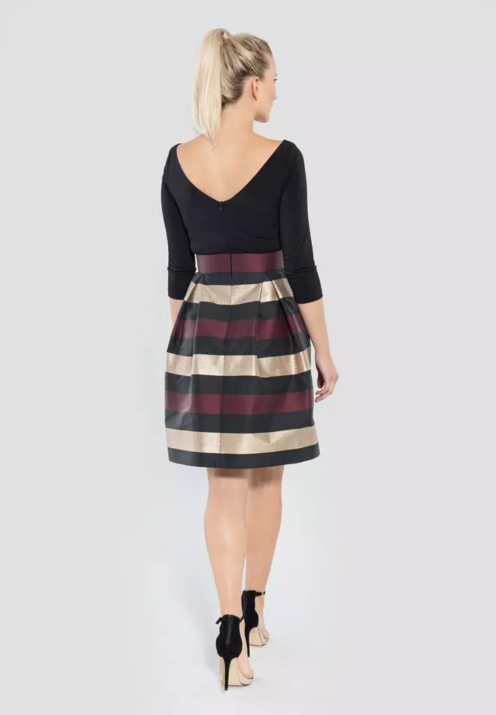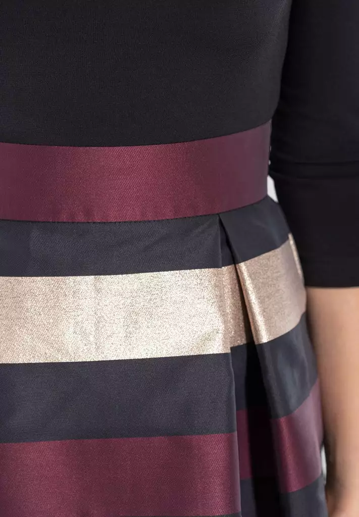 Cocktail jurk met horizontale strepen in het zwart, wijnrood en goud. De jurk heeft een getailleerde top en loopt dan uit in een a-lijn jurk.