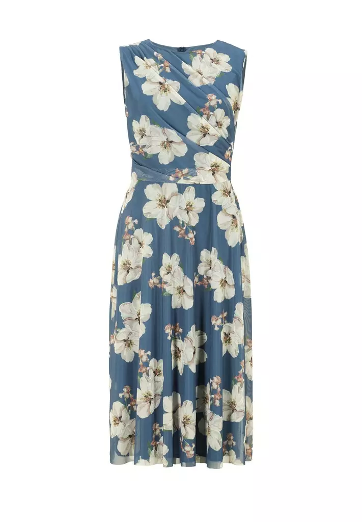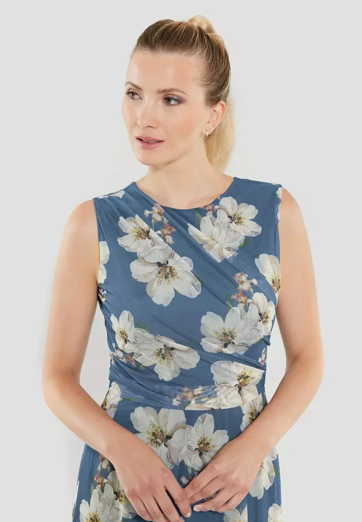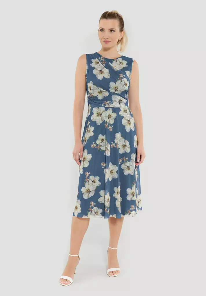 Vrolijke bloemenjurk met een midi lengte. De jurk is mouwloos, heeft een ritssluiting aan de achterzijde en heeft een schitterende tailleband waardoor deze extra mooi uitkomt.