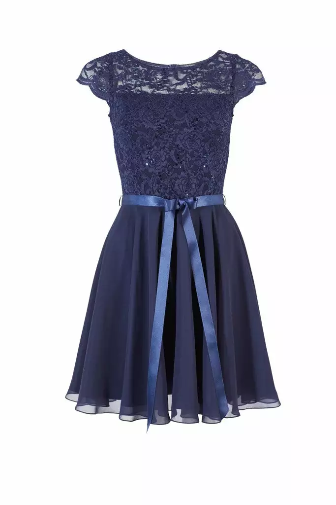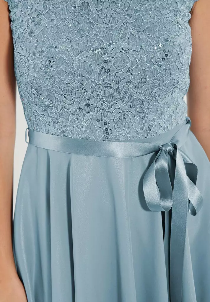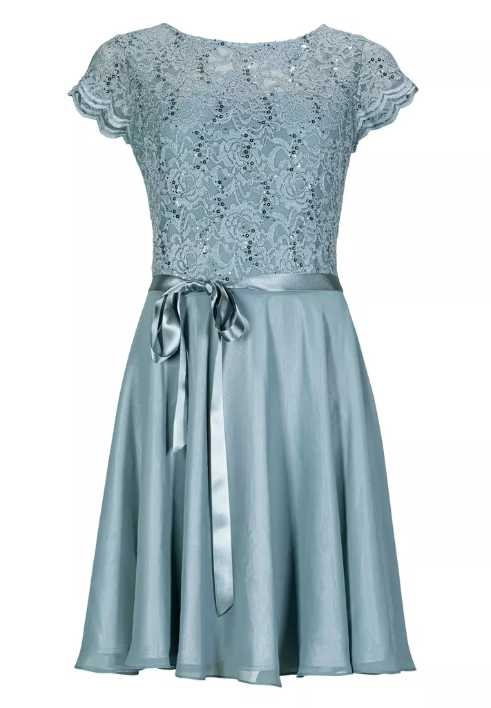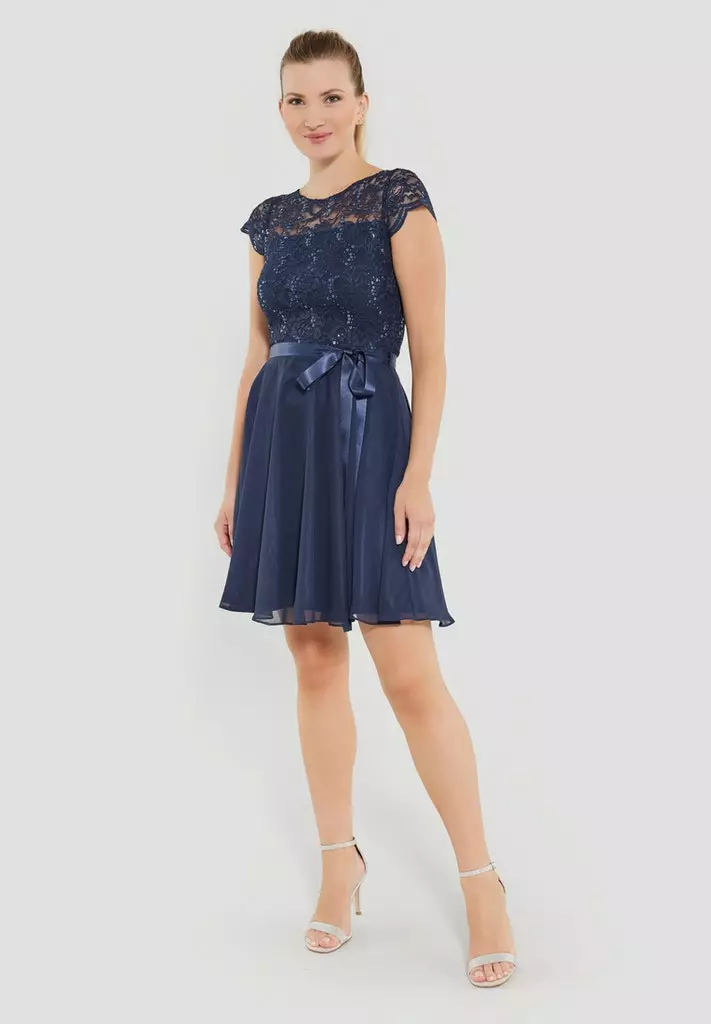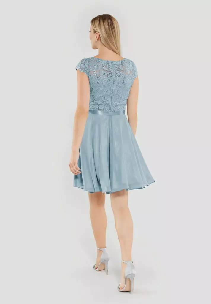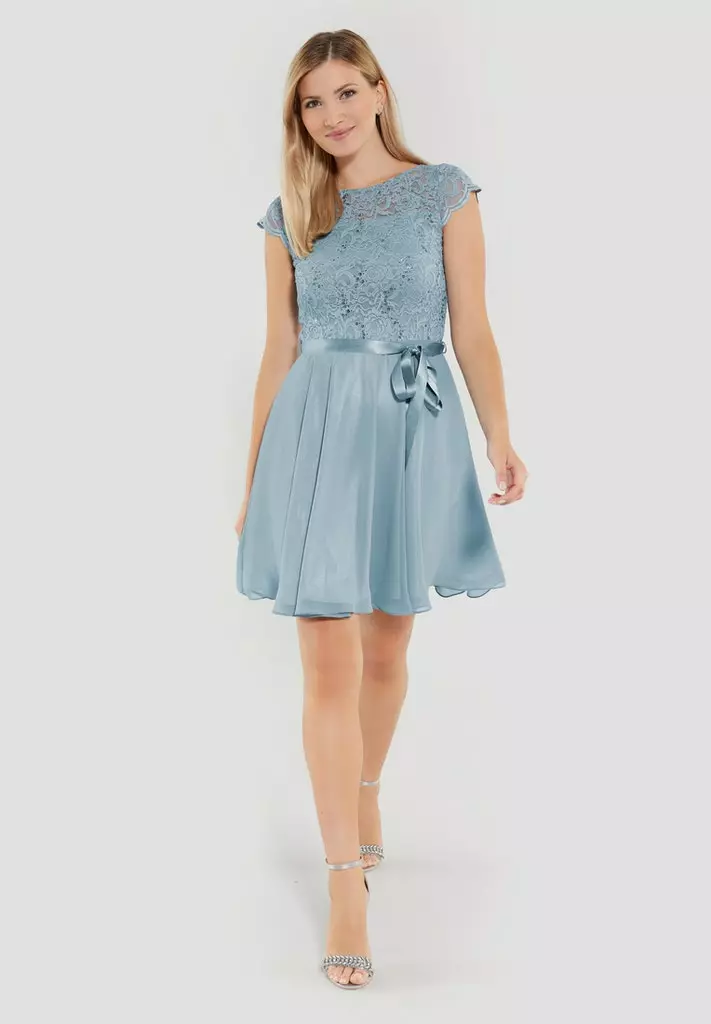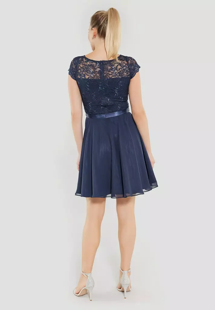 Cocktail jurk die zeer geschikt is voor een gala of bruiloft. De jurk heeft een kanten top gedeelte voorzien van pailetten, korte mouwen en valt rondom de knie. Vanuit de taille, die je met een koord extra kunt tailleren, loopt de rok soepel uit.