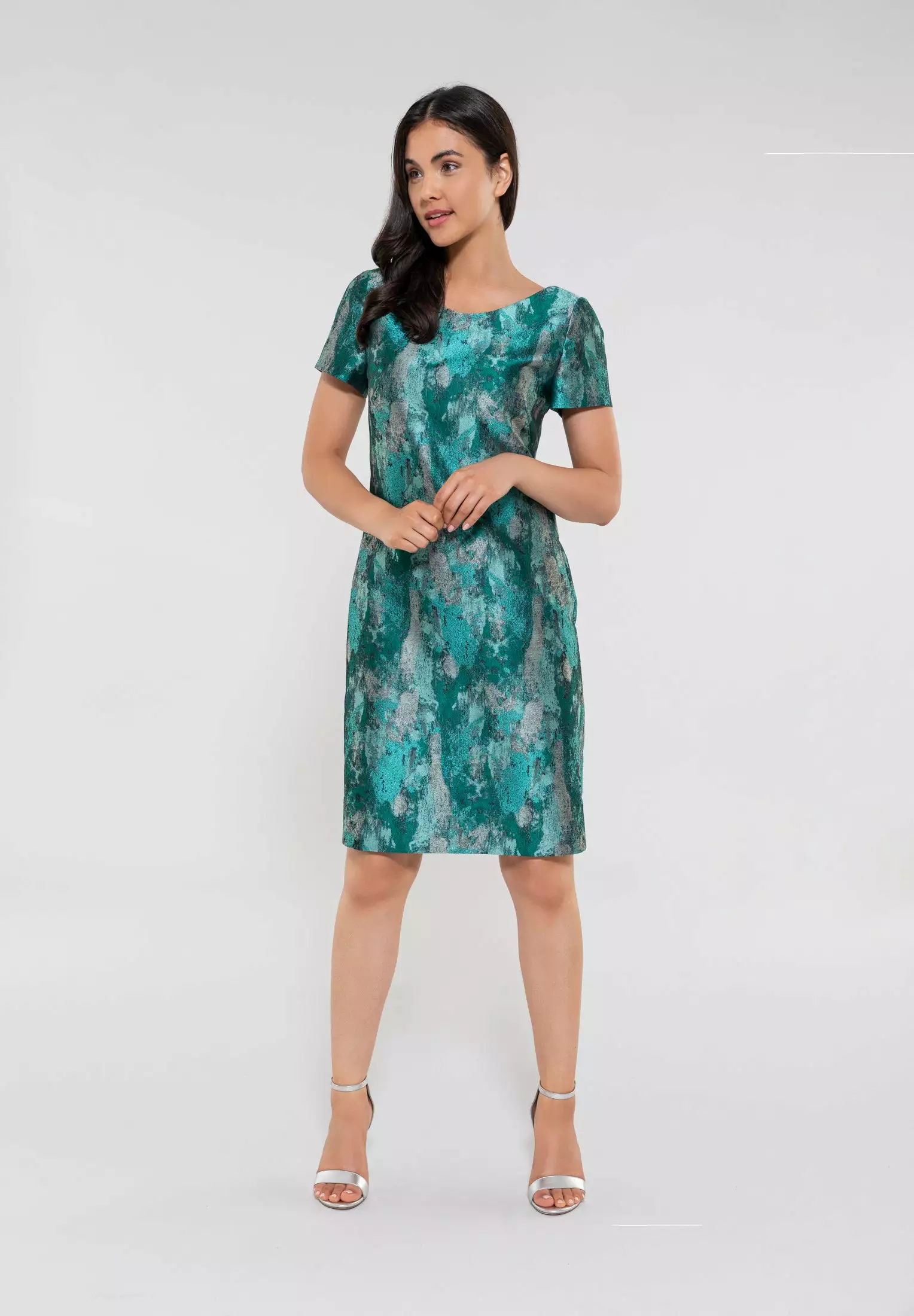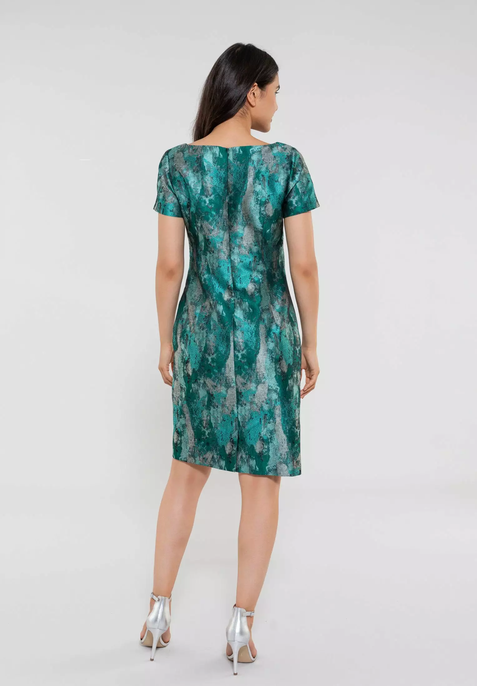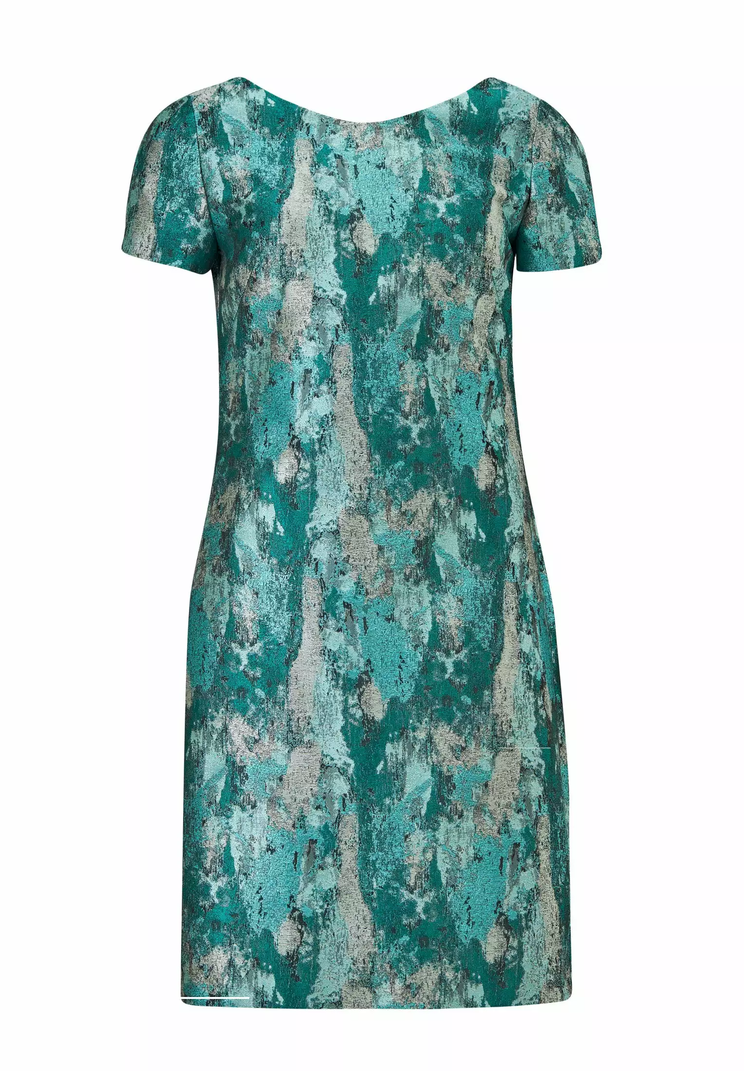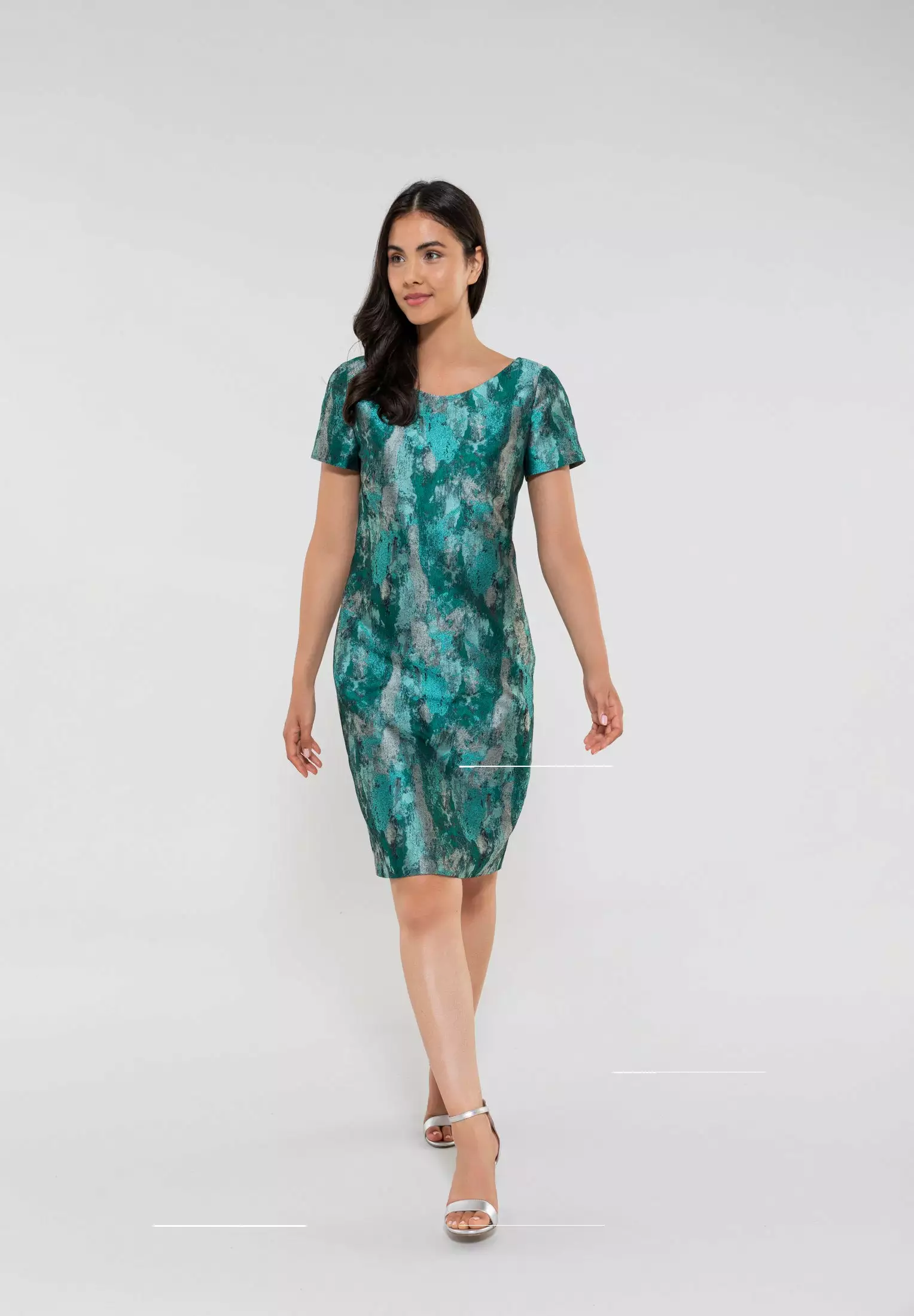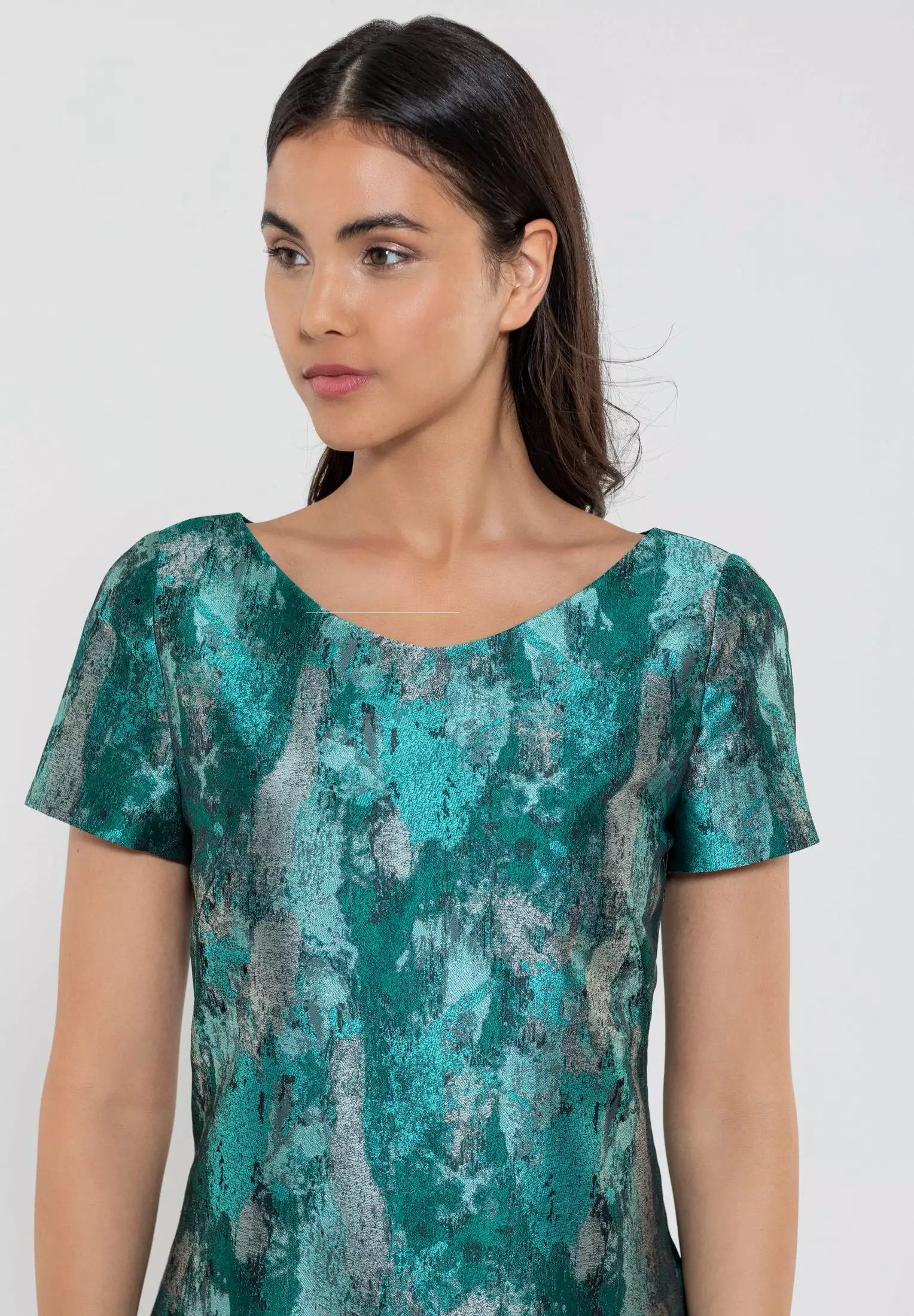 Deze jurk heeft een coating waardoor er een mooie glans ontstaan. De jurk heeft een ronde halslijn en korte mouwen.