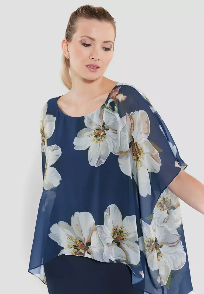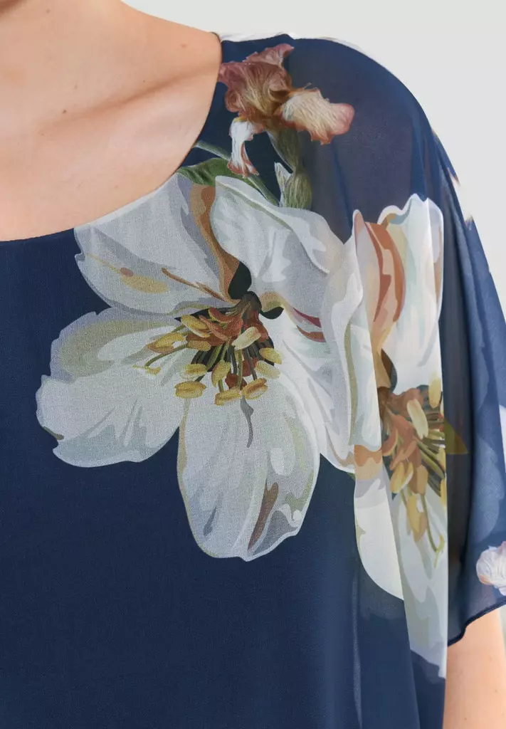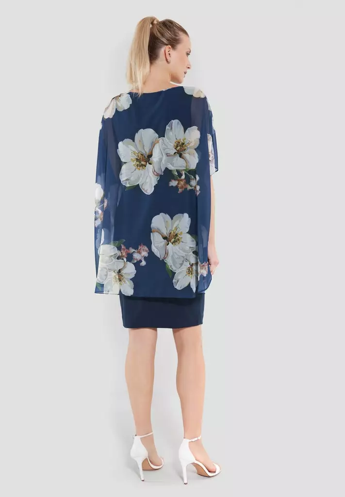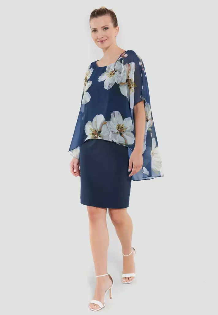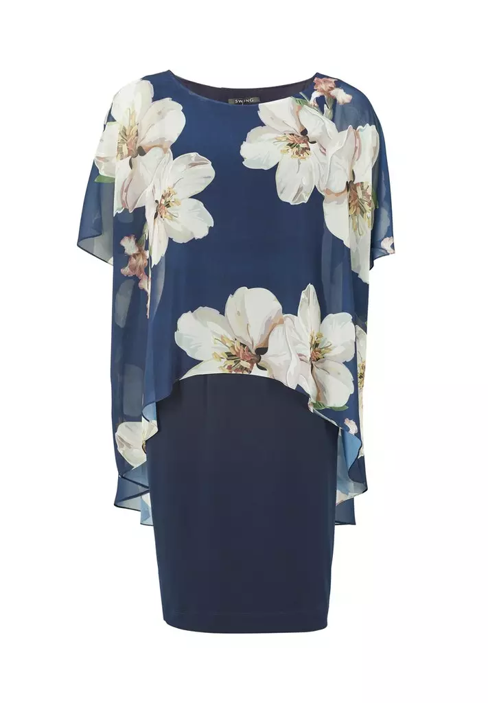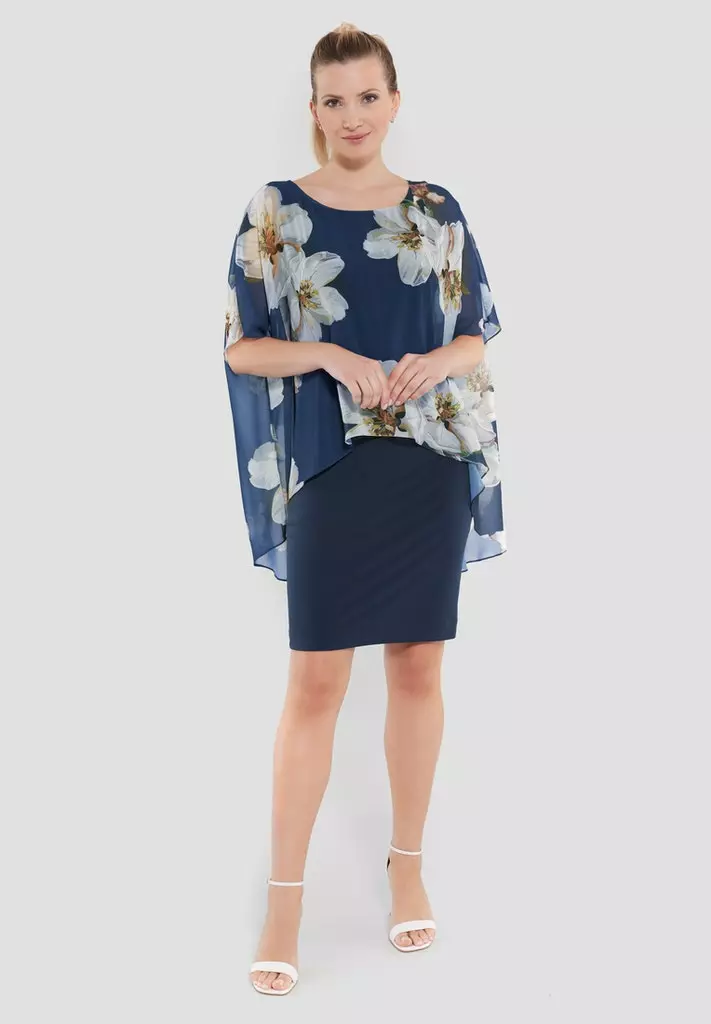 Een aansluitende jurk met een beprinte chiffon laag die losjes over de jurk valt.