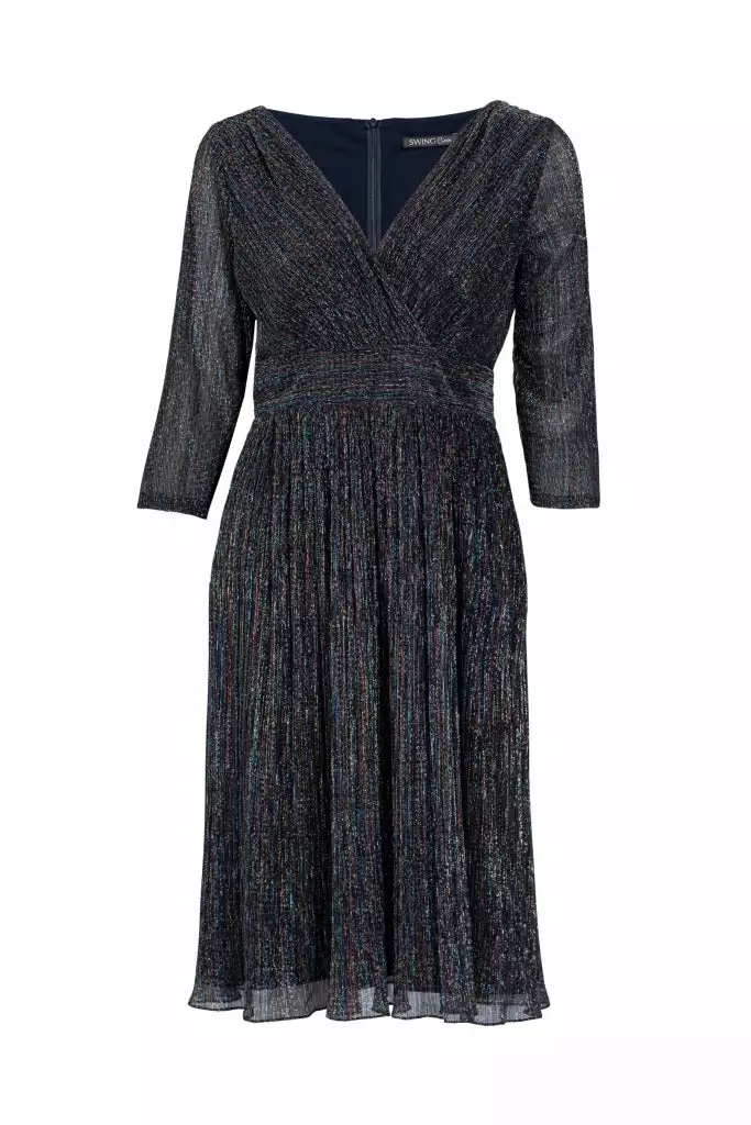 Deze shiny lurex cocktail jurk zit prachtig getaileleerd in je taille, heeft een drie kwartmouw en overslag v-halslijn.