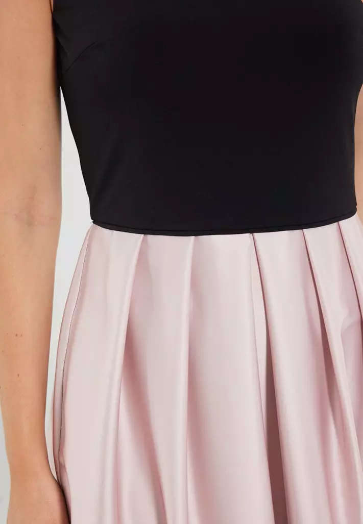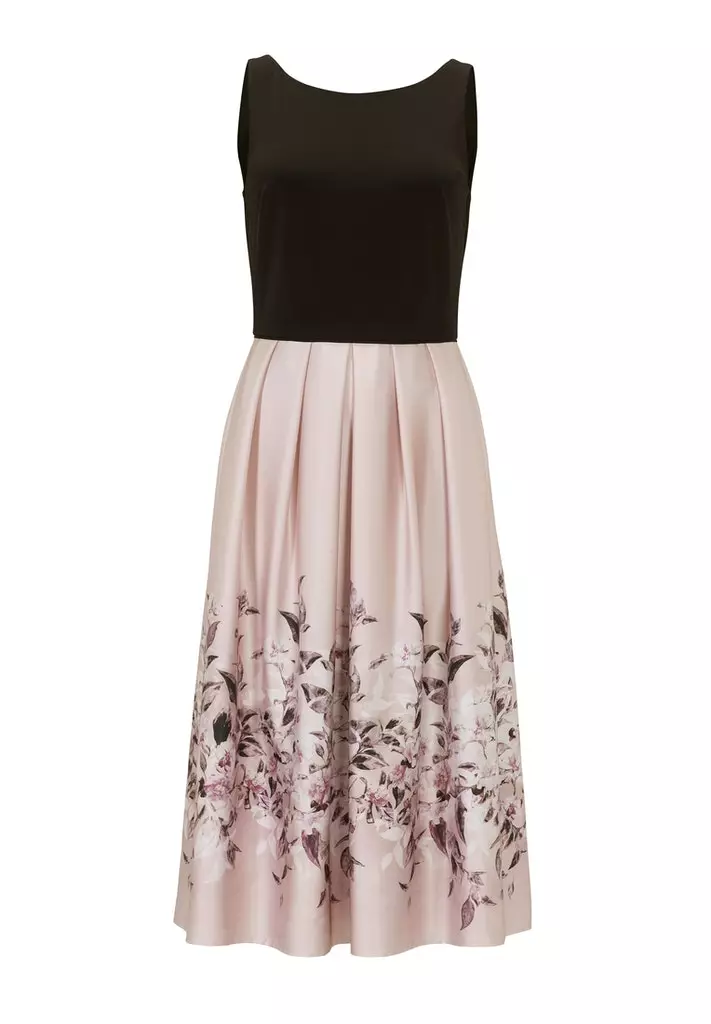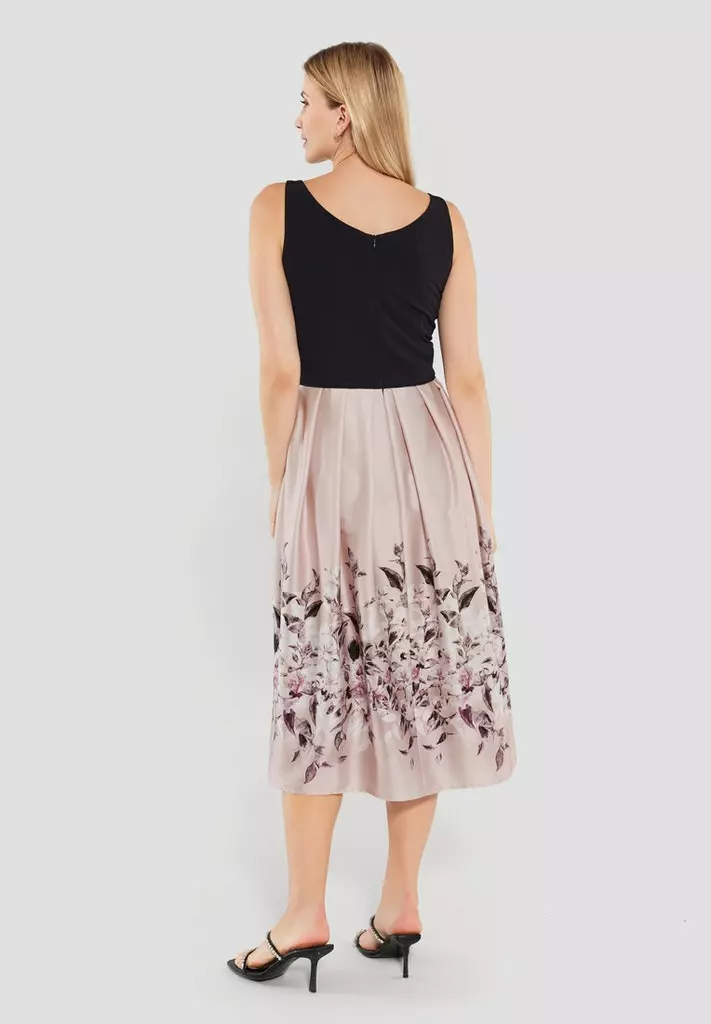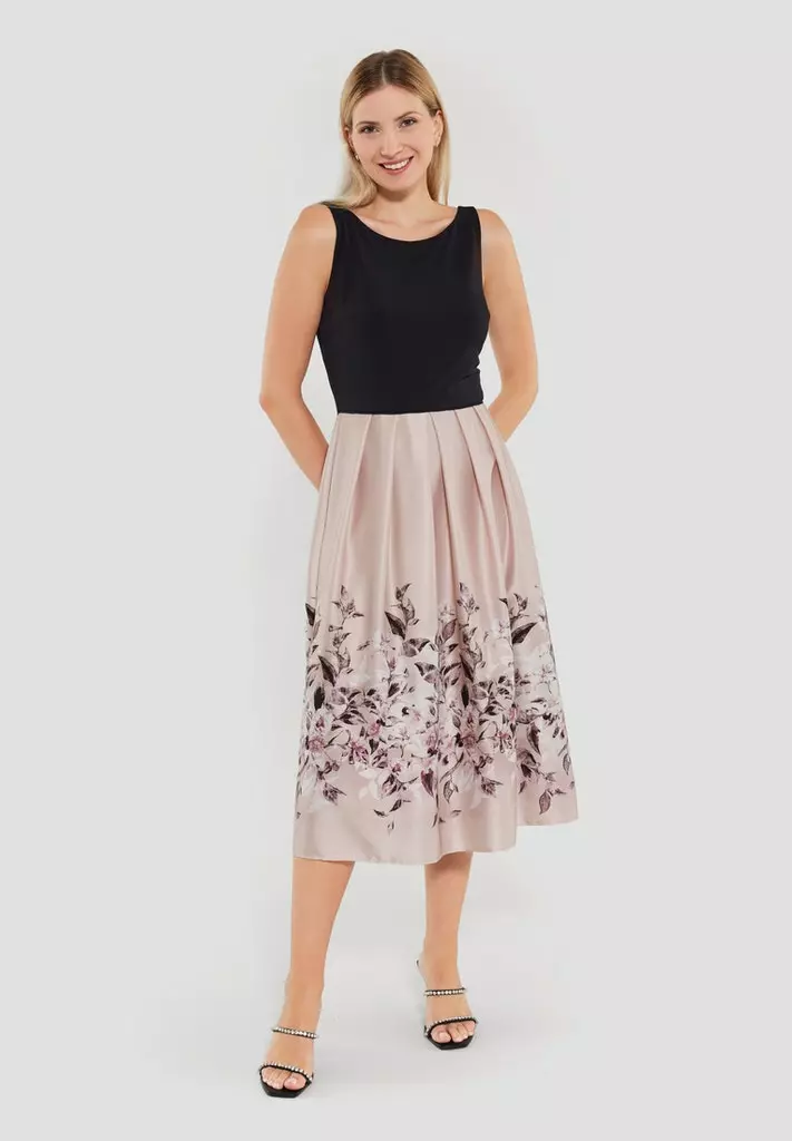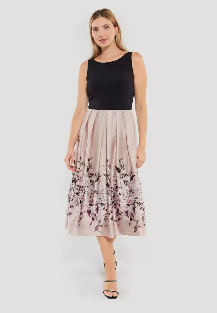 Midi jurk met effen zwarte top en rose rok voorzien van een prachtige bloemenprint. We hebben bijpassende bolero’s, vestjes om de outfit helemaal compleet te maken.