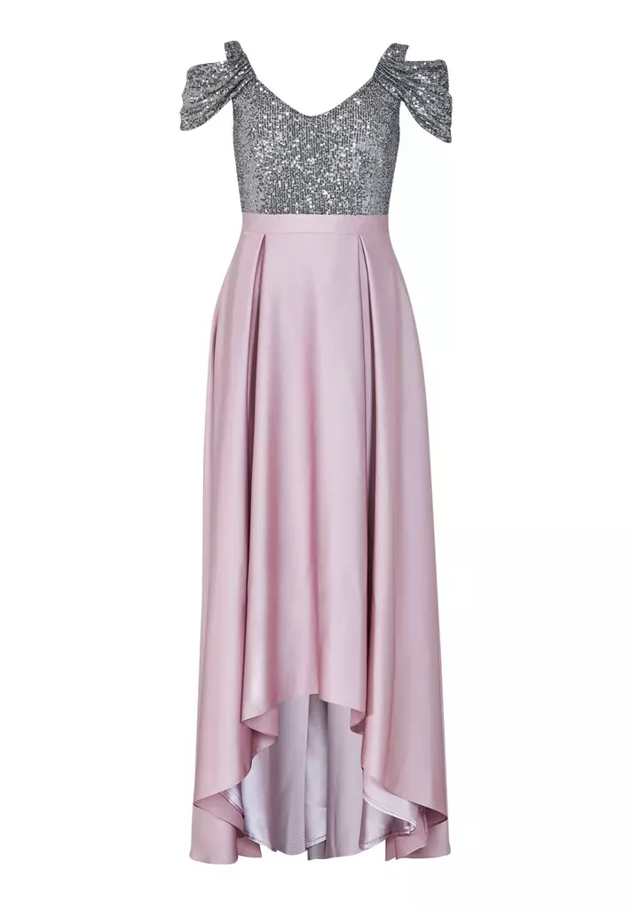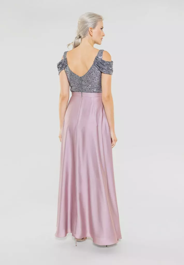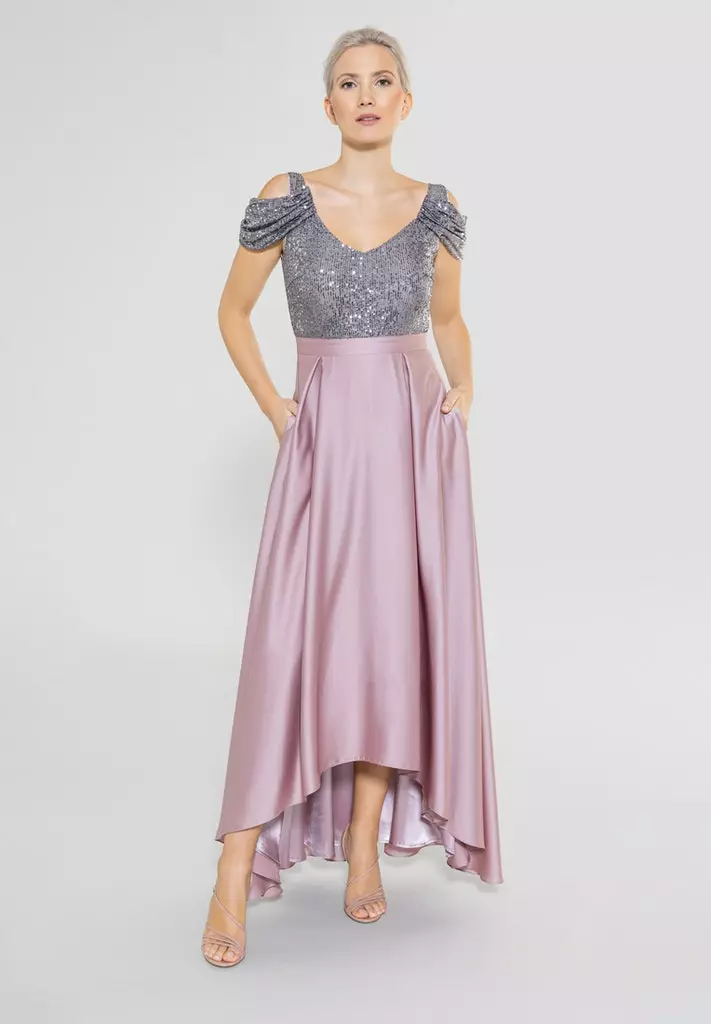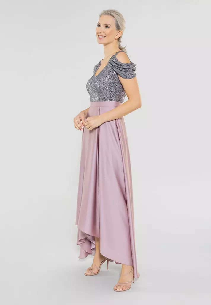 Asymetrische gala jurk met pailetten aan de top kant en dan een zwierige satijnen rok! Kijk eens naar die prachtige mouwen die over je bovenarm vallen. Een en al glamour!
