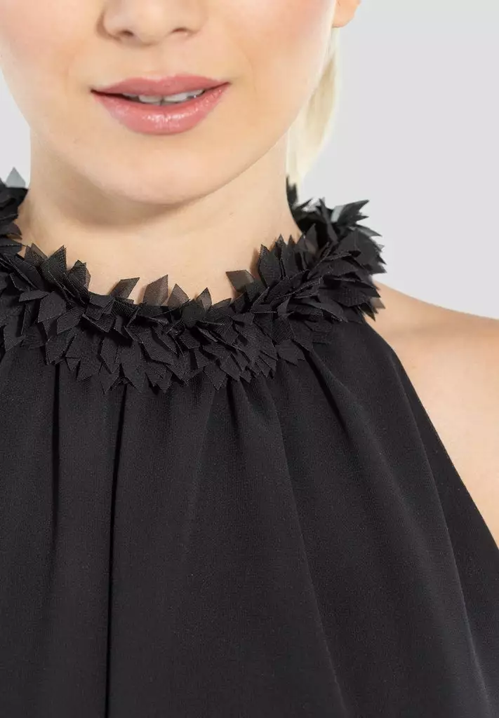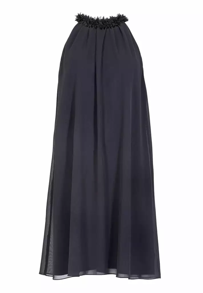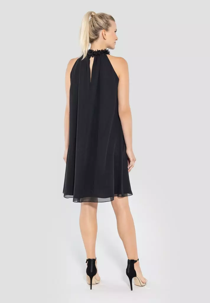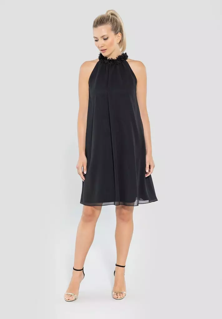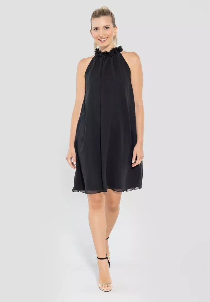 Soepelvallende little black dress die mouwloos is, tot rondom de knie valt en een leuke halslijn heeft.