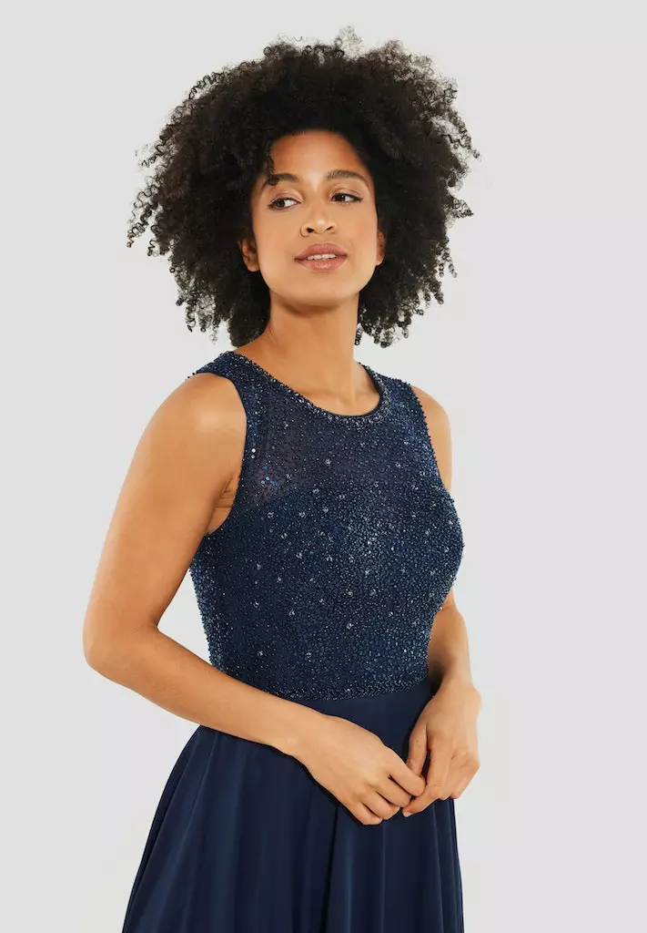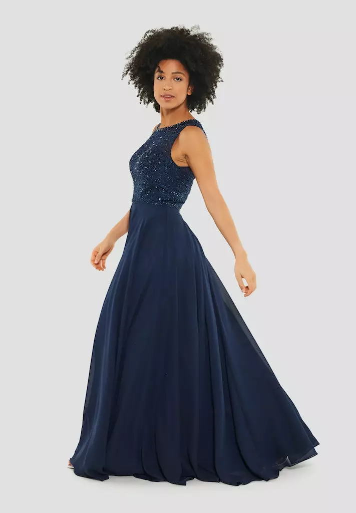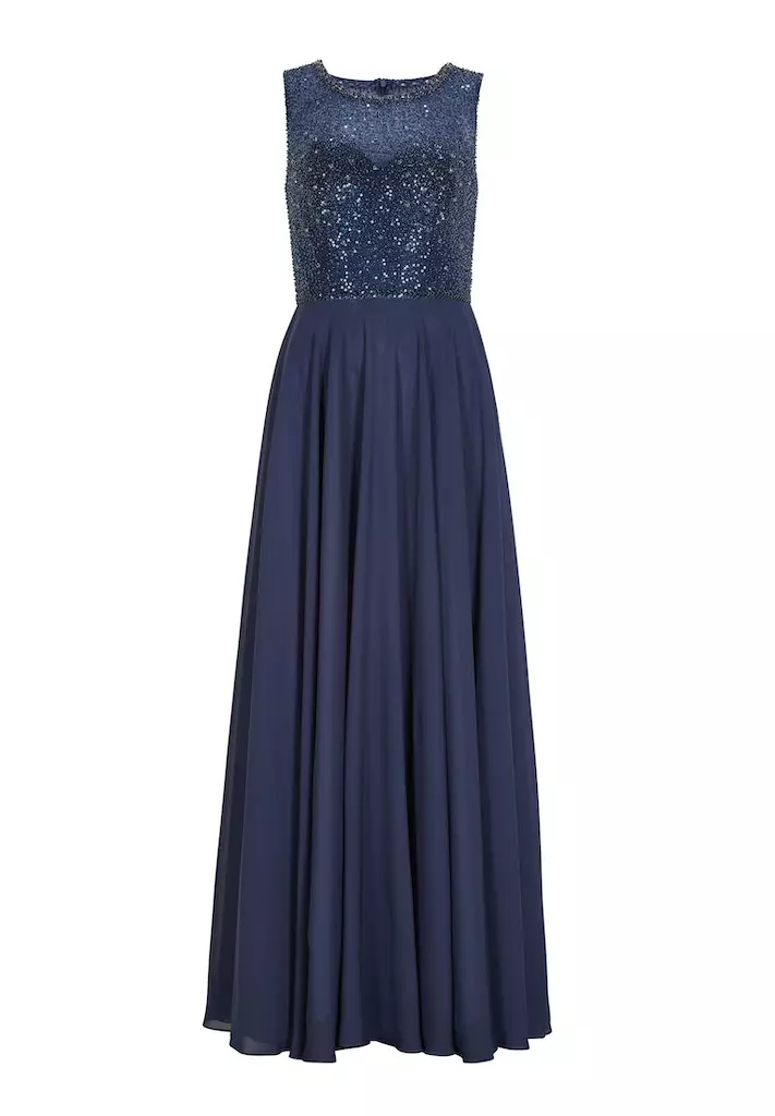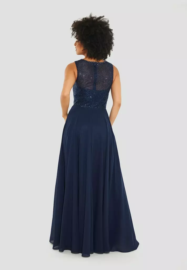 Deze gala jurk heeft een top voorzien van glitters en kleine steentjes. De jurk is mouwloos en heeft een ronde halslijn.