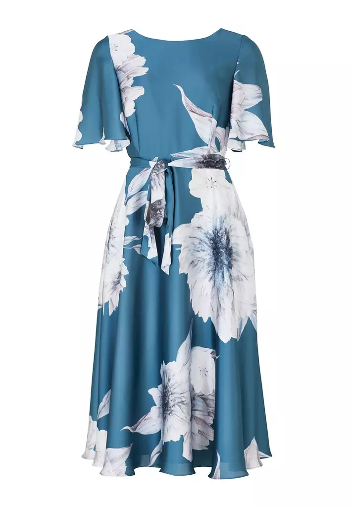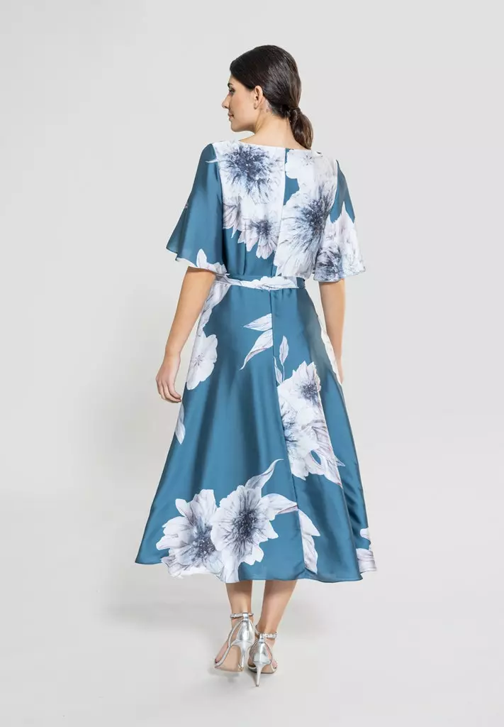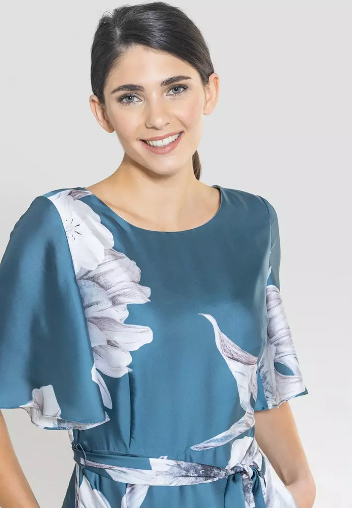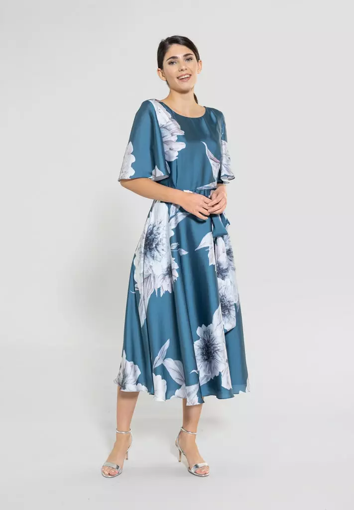Satijnen midi jurk met mooi bloemendessin. De jurk valt aangesloten aan de top en loopt uit in een prachtige zwierige rok. De taille wordt mooi benadrukt door het taillekoord te strikken naar wens. De jurk heeft een korte mouw, ronde halslijn en een ritssluiting aan de achterzijde.