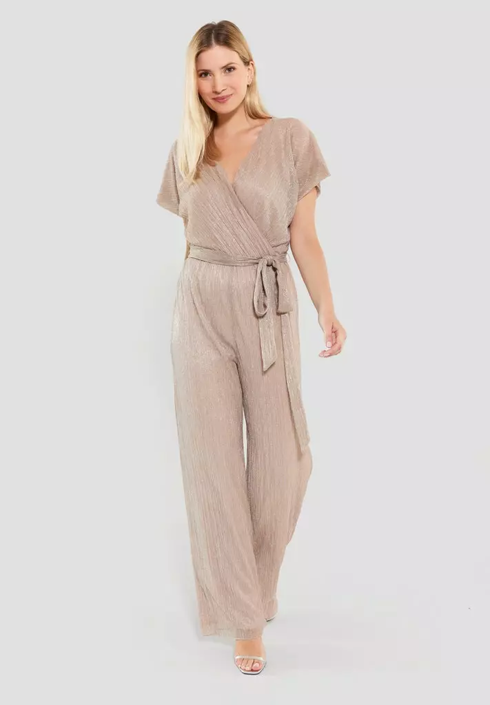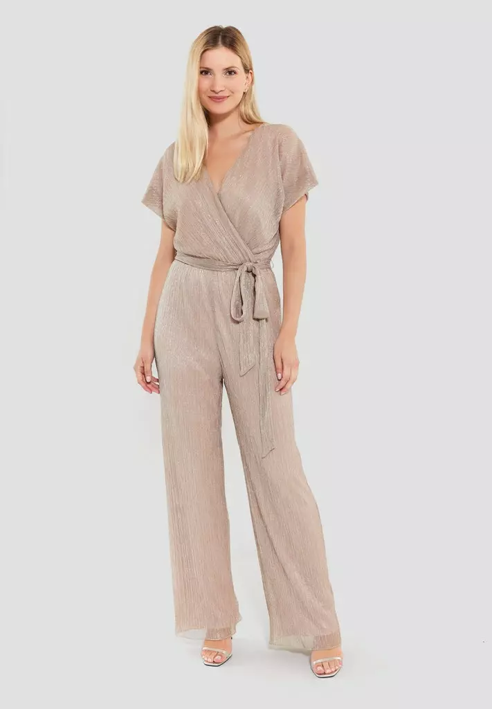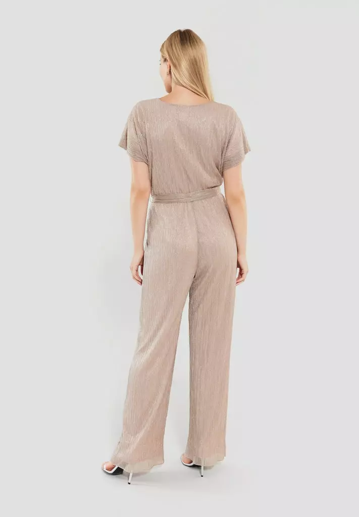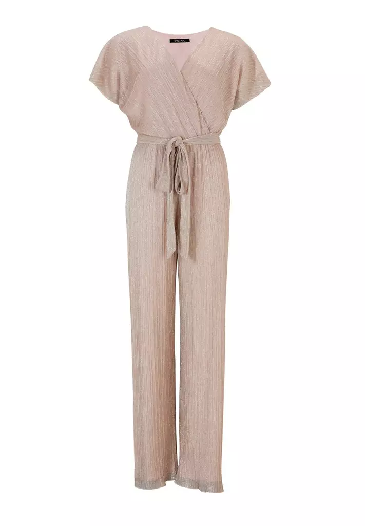 Prachtige jumpsuit met lurex draad. De jumpsuit heeft wijde pijpen, een v-hals en korte mouw.