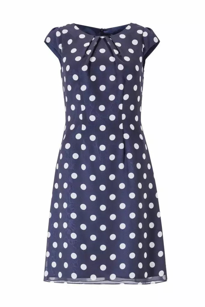 Stipjes zijn altijd goed! Tijdloos en classy. De jurk zelf is navy blauw van kleur, heeft een kapmouw en heeft een leuk accent bij de ronde halslijn.