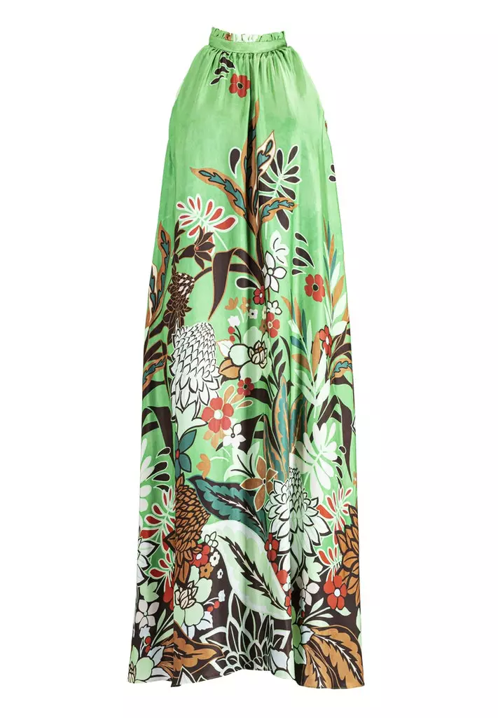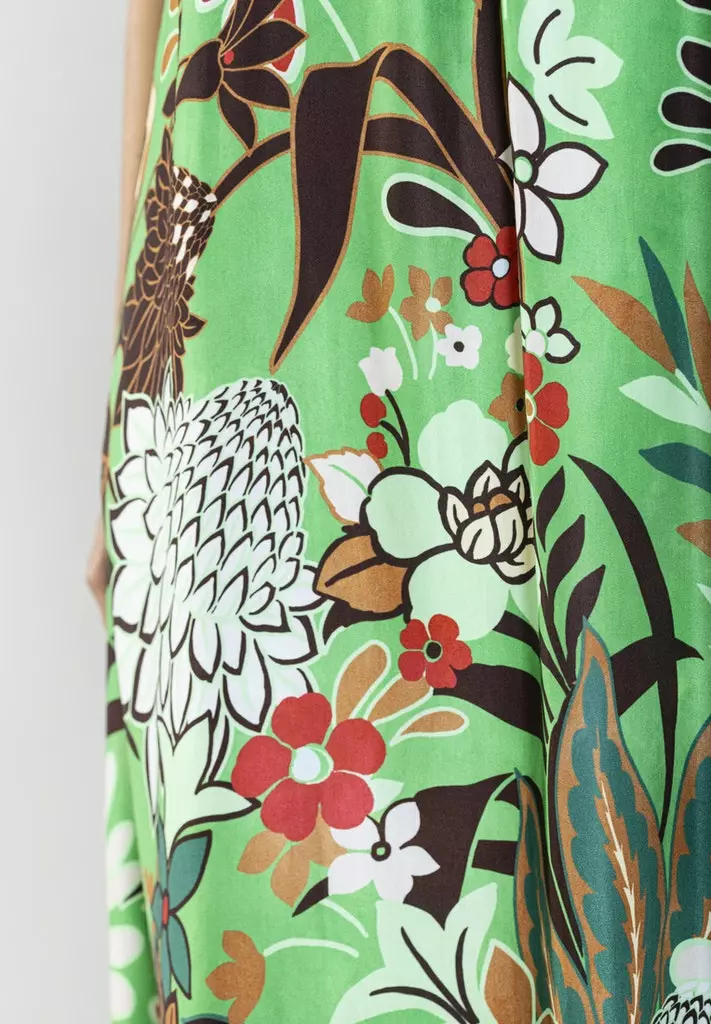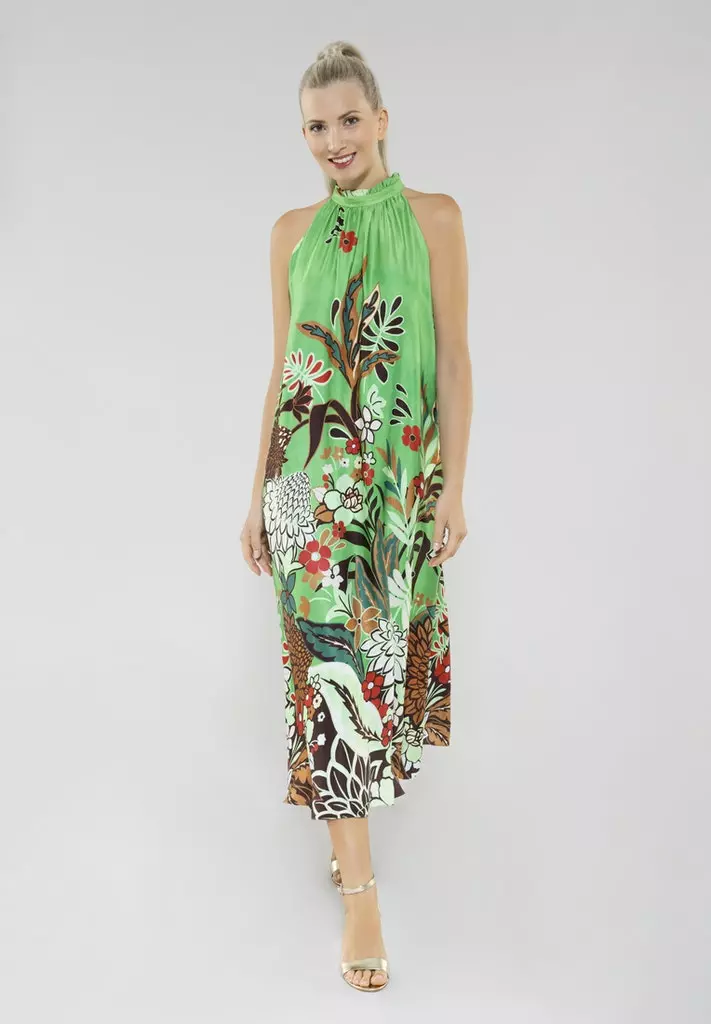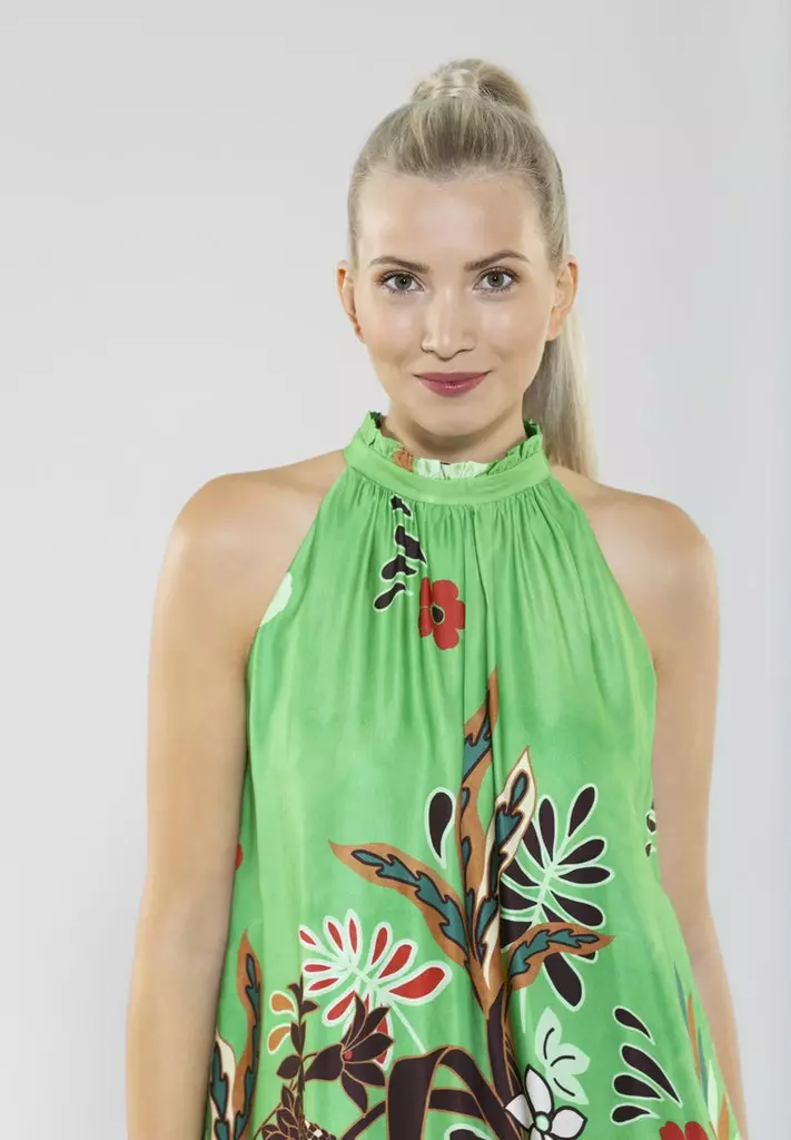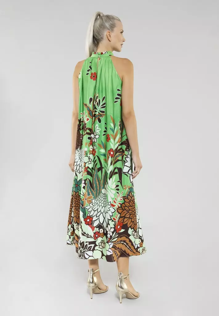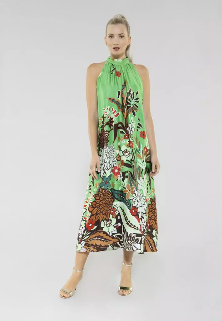 Heerlijke midi jurk met prachtige print gemaakt van 100% viscose! Hoe lekker voor een warme zomerse dag?! De jurk is mouwloos en heeft een mooie halslijn die aan de achterzijde te sluiten is via een knoopje.