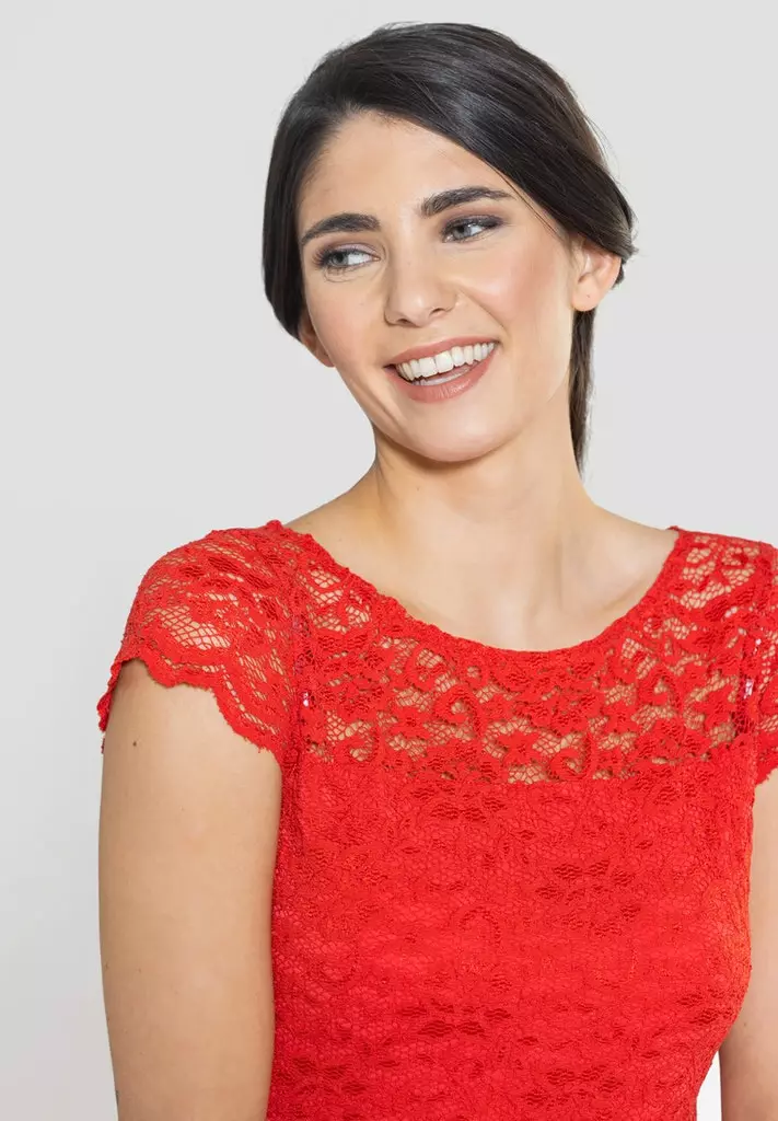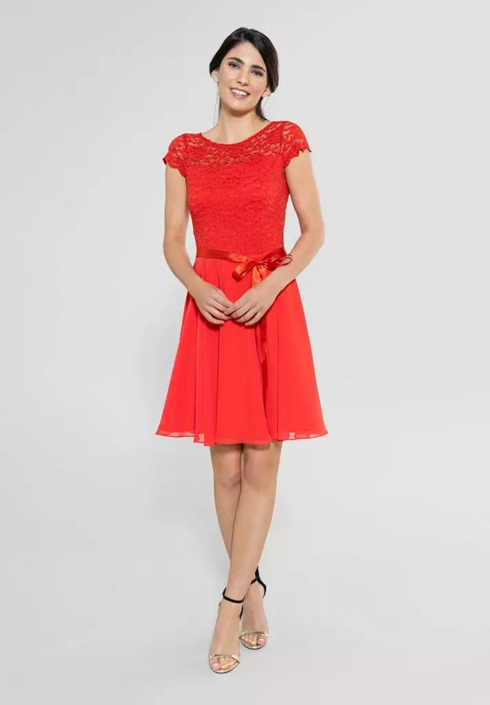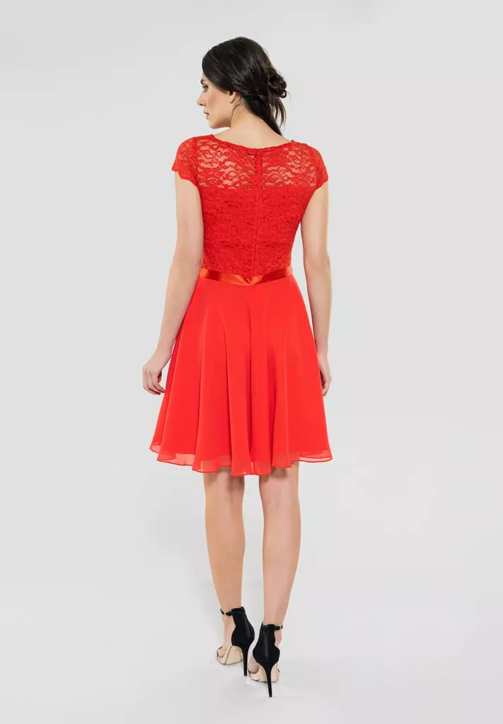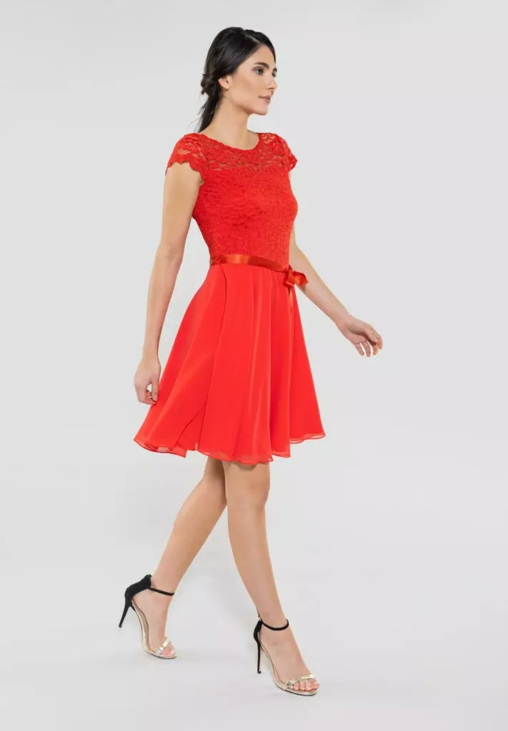 Jurk met kanten top dat mee rekt die uitloopt in een zwierige chiffon rok. De jurk heeft een satijnen lint dat gestrikt dient te worden.