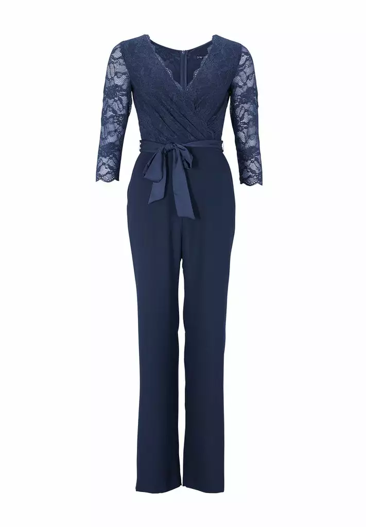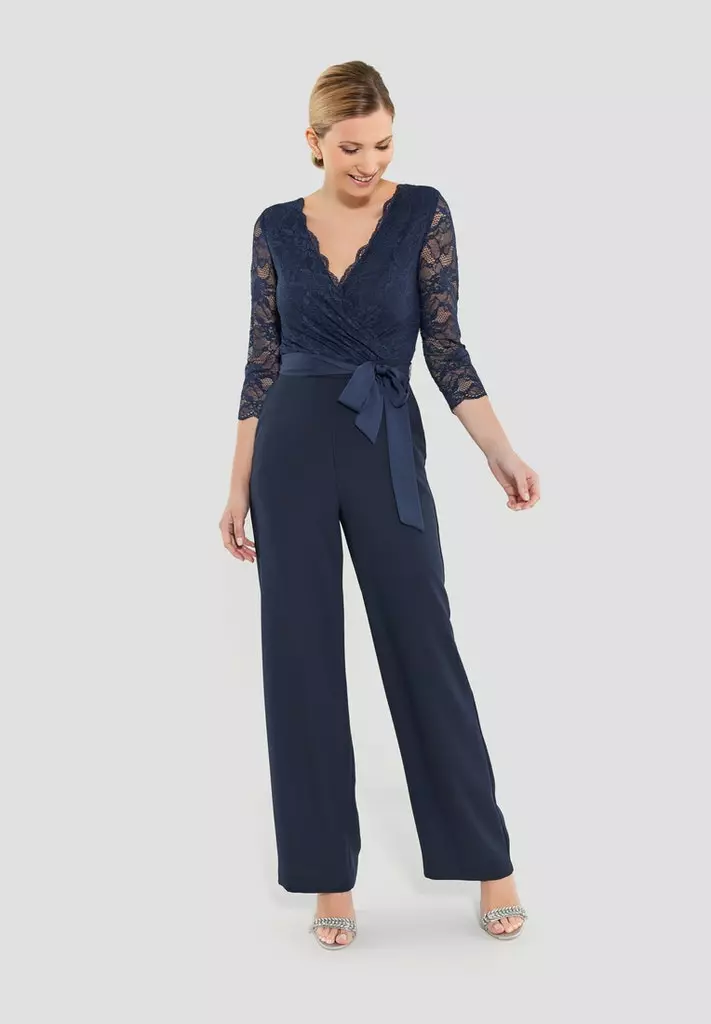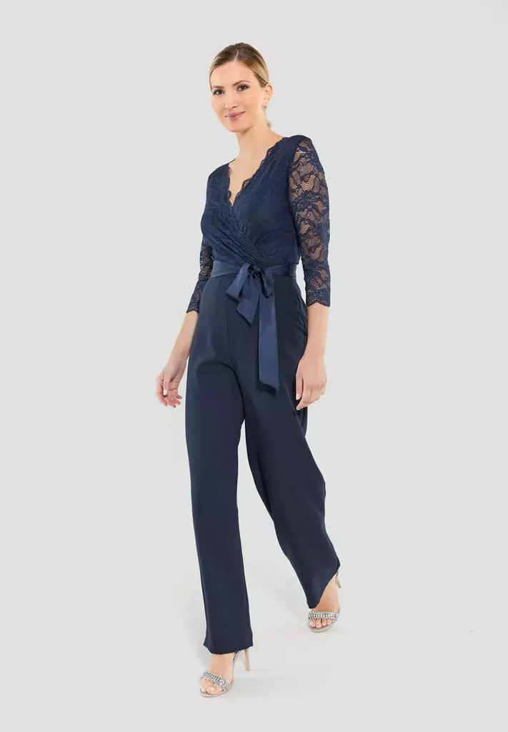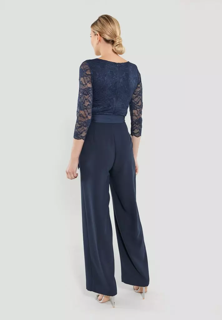 Jumpsuit met kanten v-hals top en drie kwart mouw. De jumpsuit heeft een iets wijdere pijp en valt mooi getailleerd in de taille.