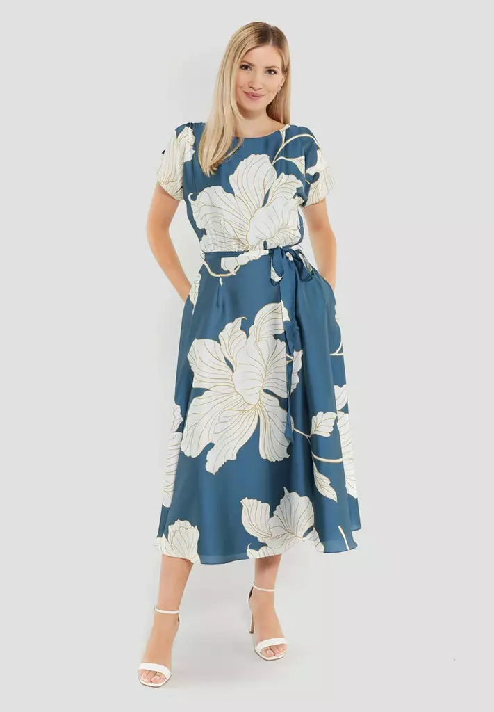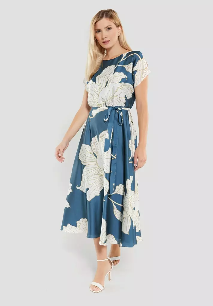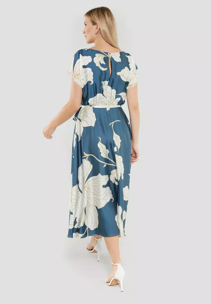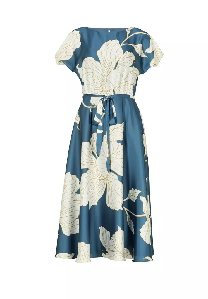 Deze satijnenjurk heeft een grafische bloemenprint en valt op midi lengte. De jurk heeft een ritssluiting aan de zijkant en een tailleband om de taille te benadrukken. De jurk valt zwierig.