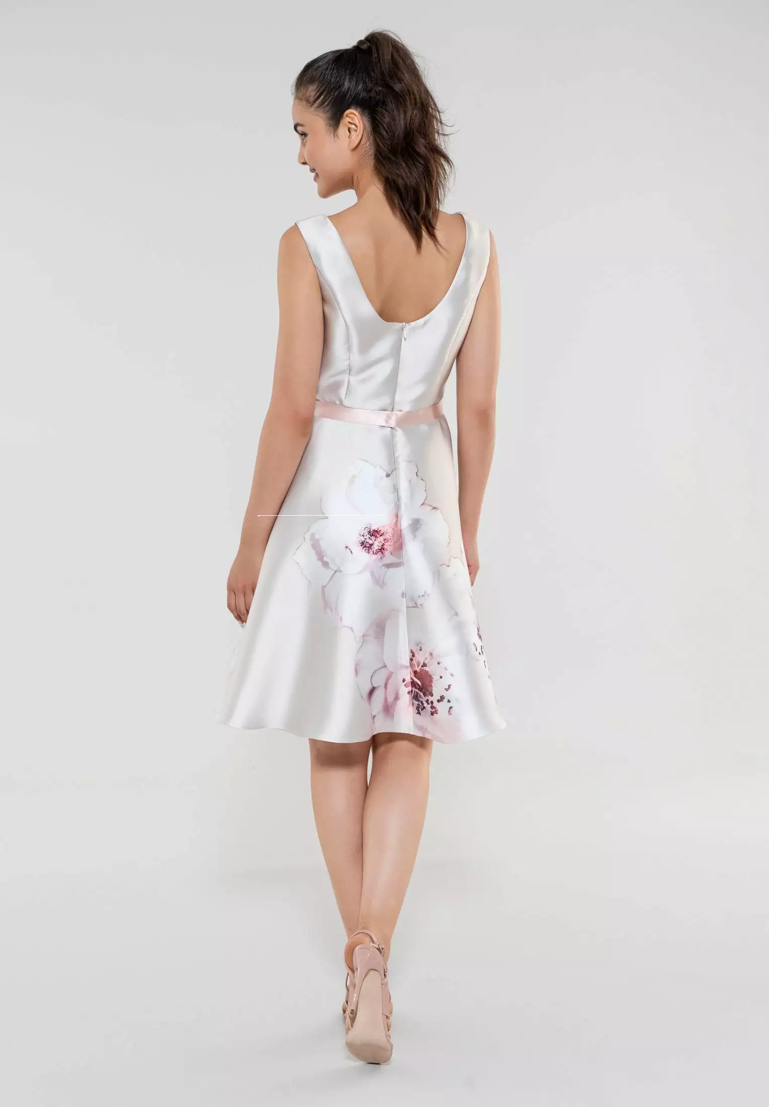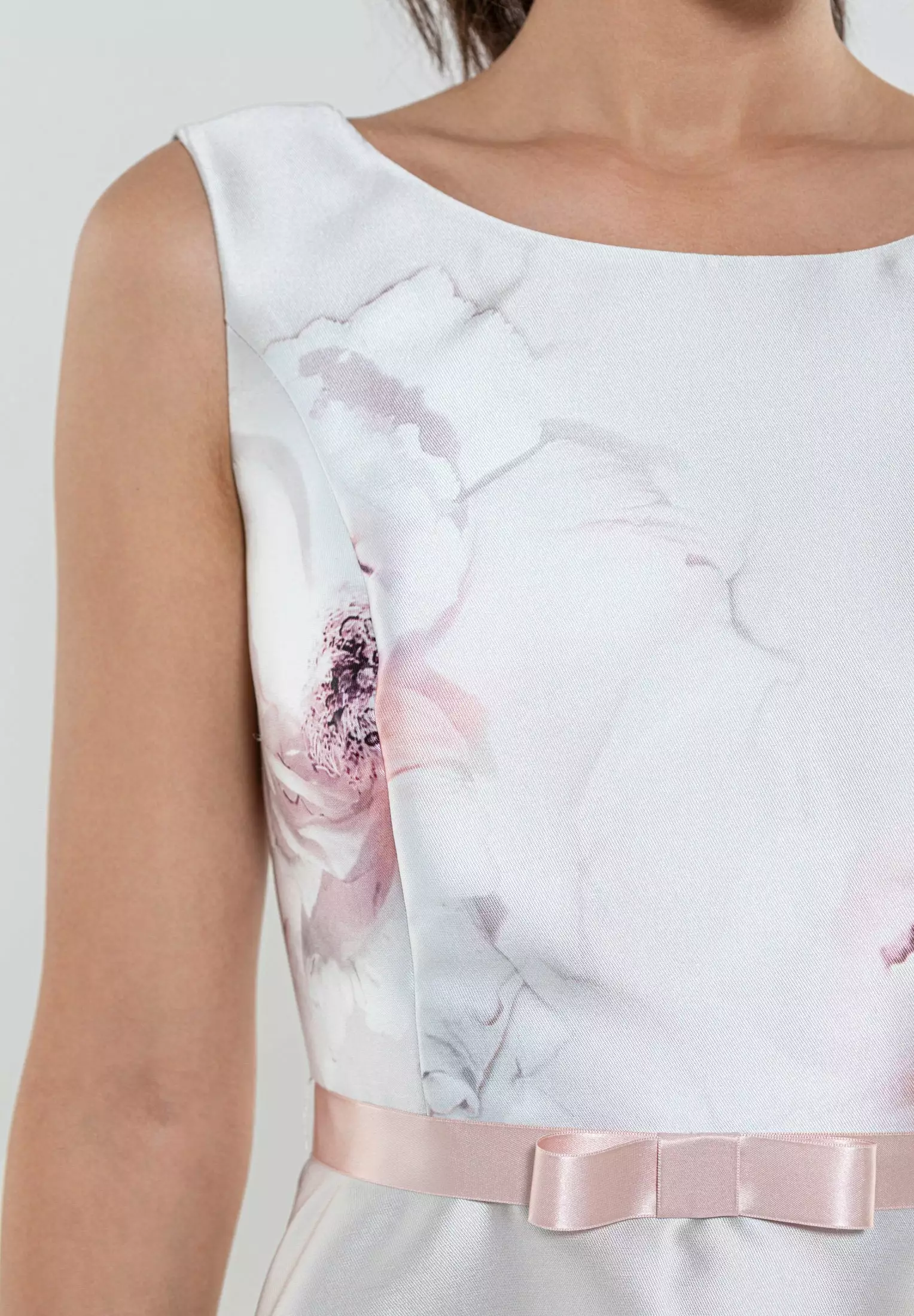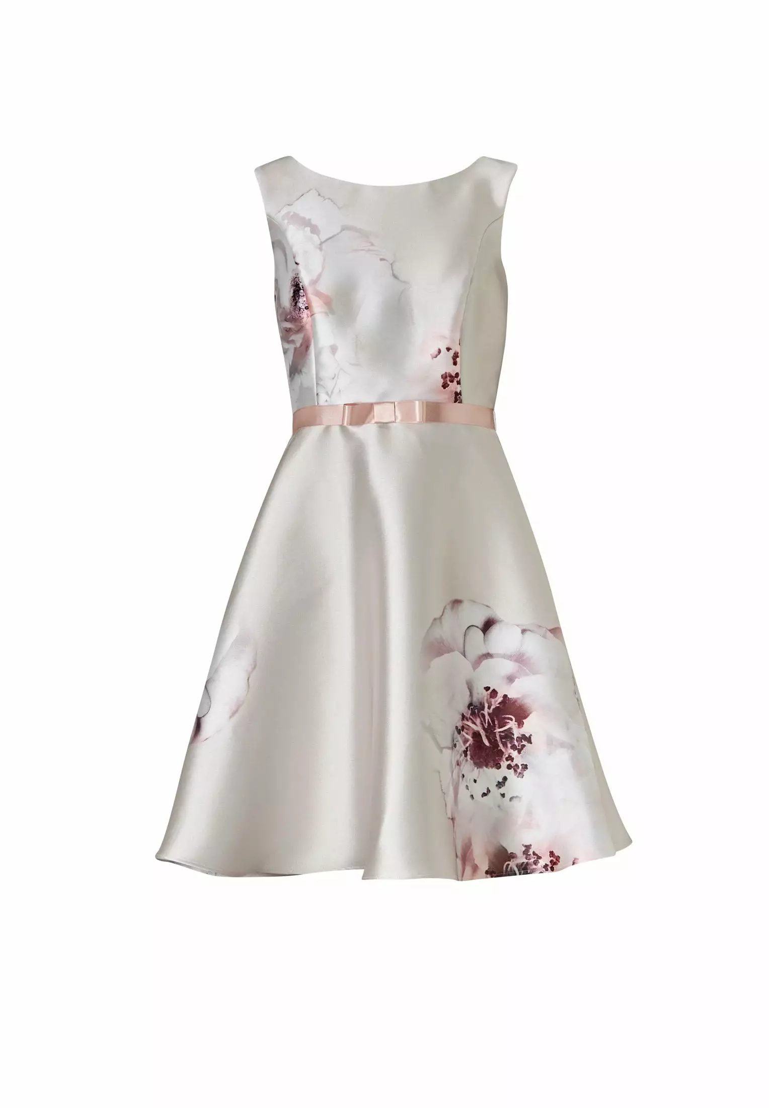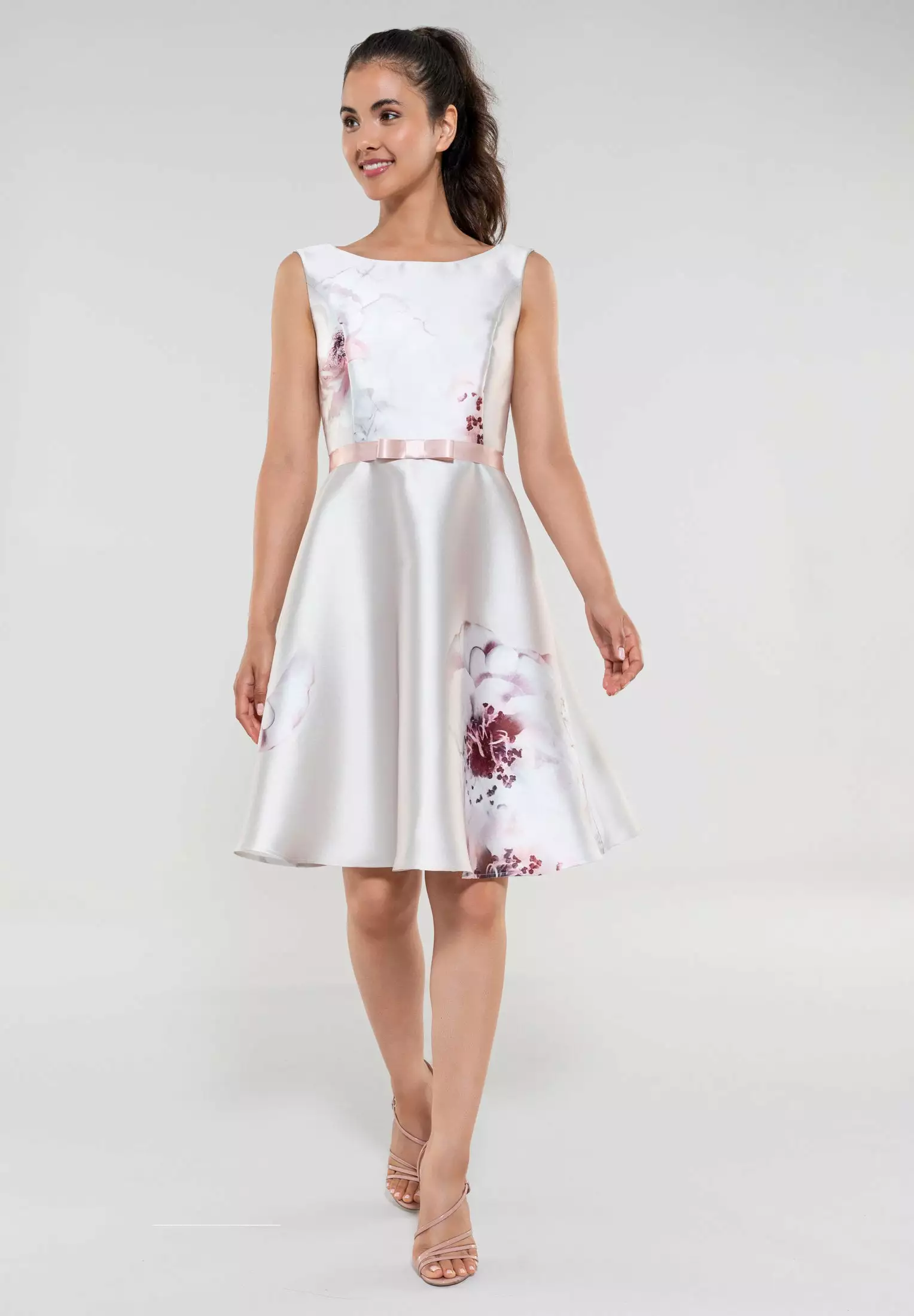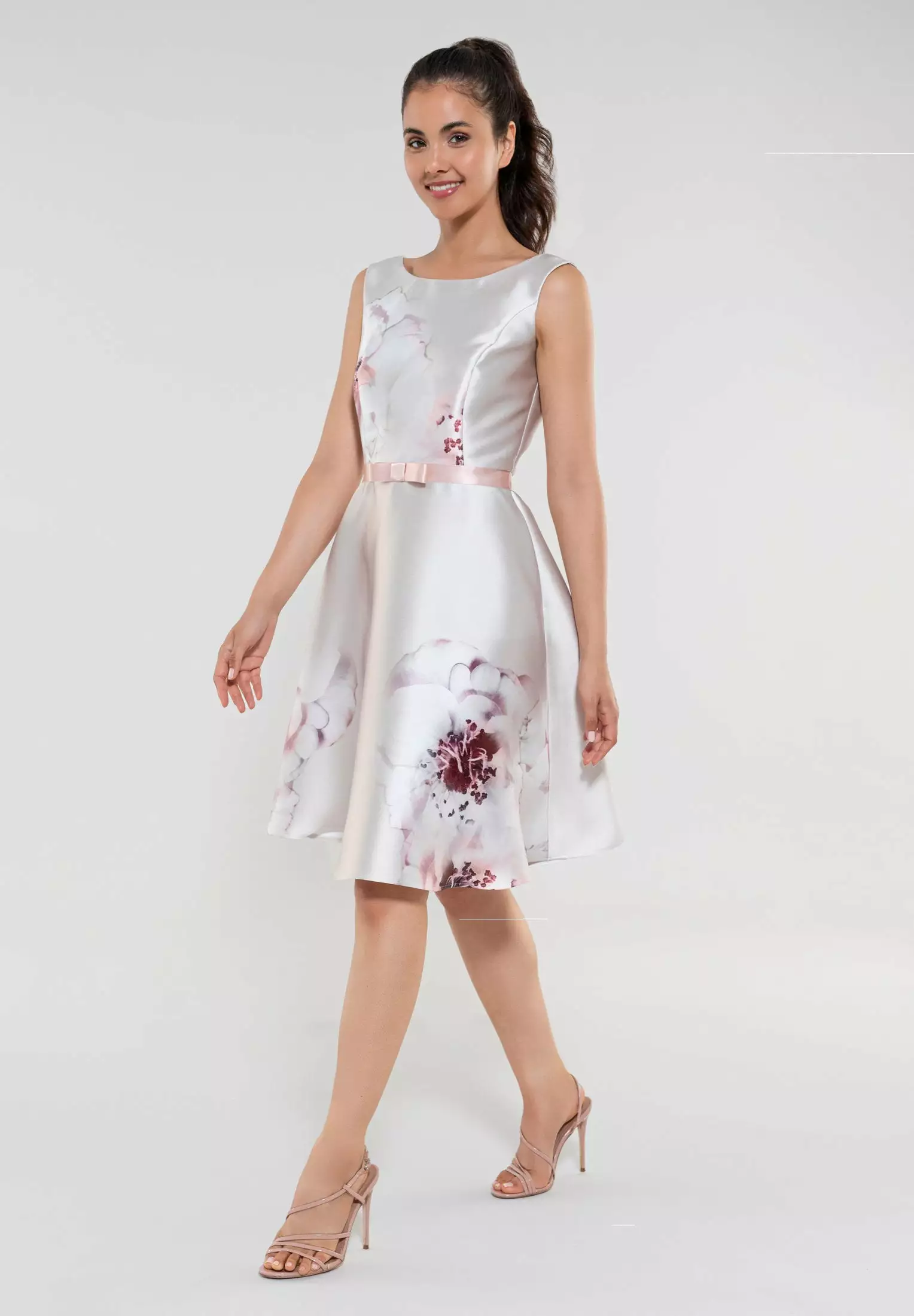 A-lijn jurk met prachtig bloemendessin. De jurk heeft een tailleband met strikje erop, ronde halslijn en is mouwloos. Vanuit de taille loopt de jurk uit in een rok die in vorm blijft staan.
