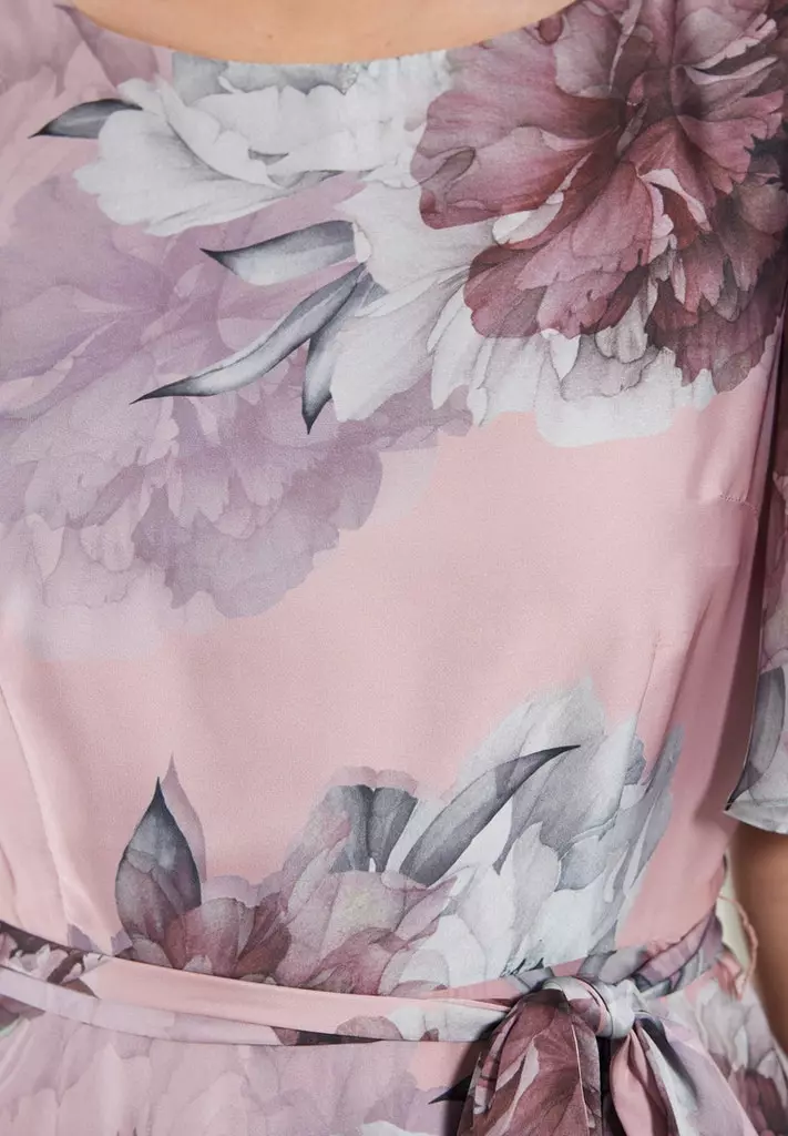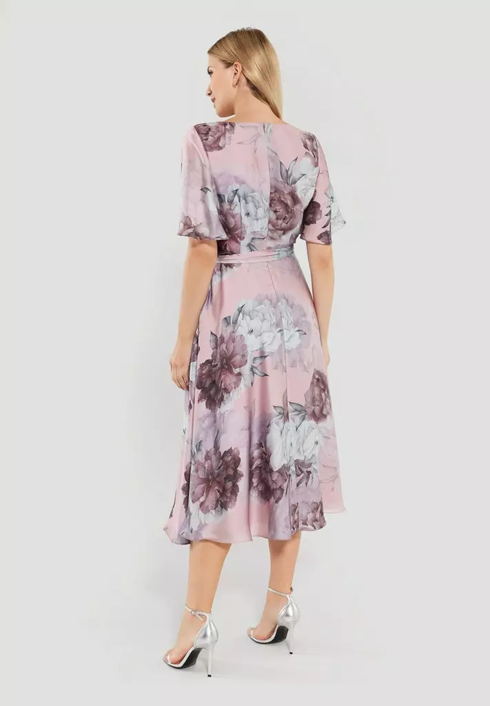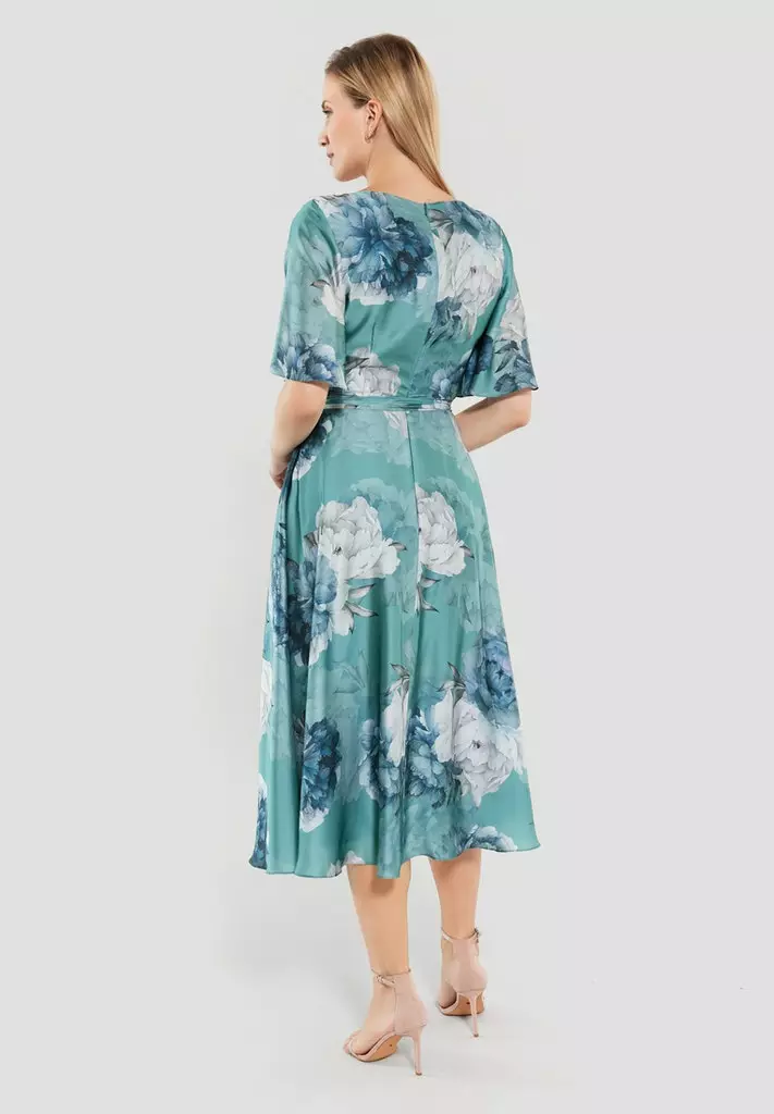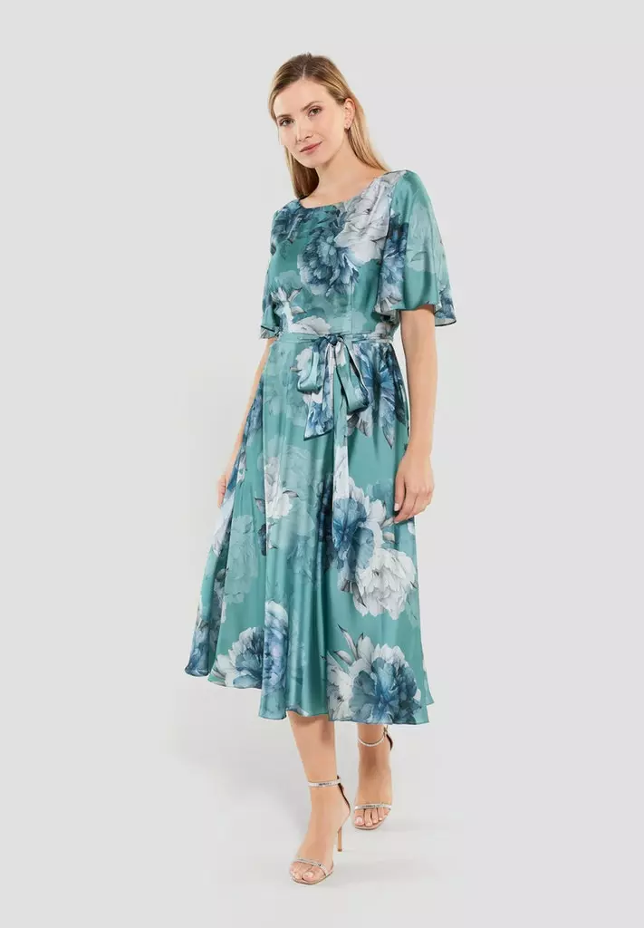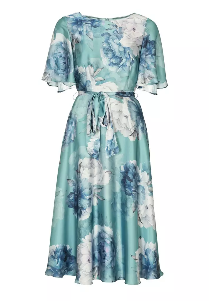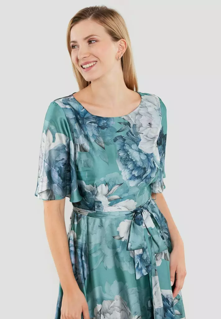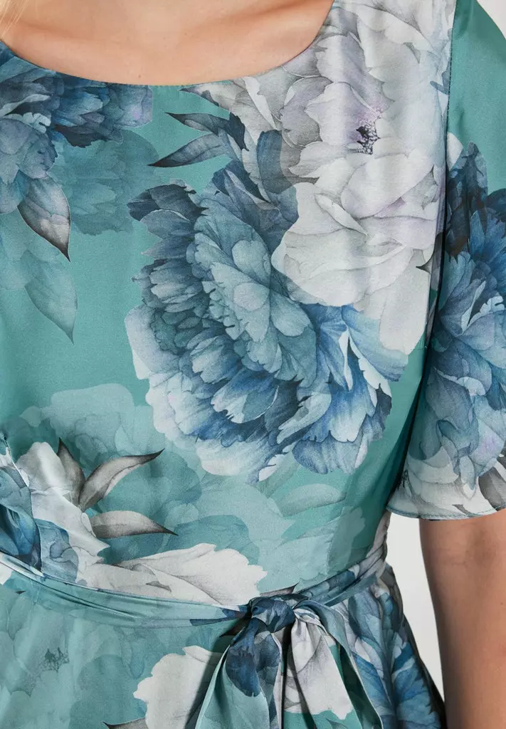Een bloemenprint op een satijnen doek, wat wil je nog meer? Deze jurk heeft een midi lengte, ronde halslijn en korte mouw. Zwierig en tevens mooi getailleerd in de taille.