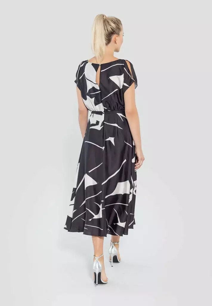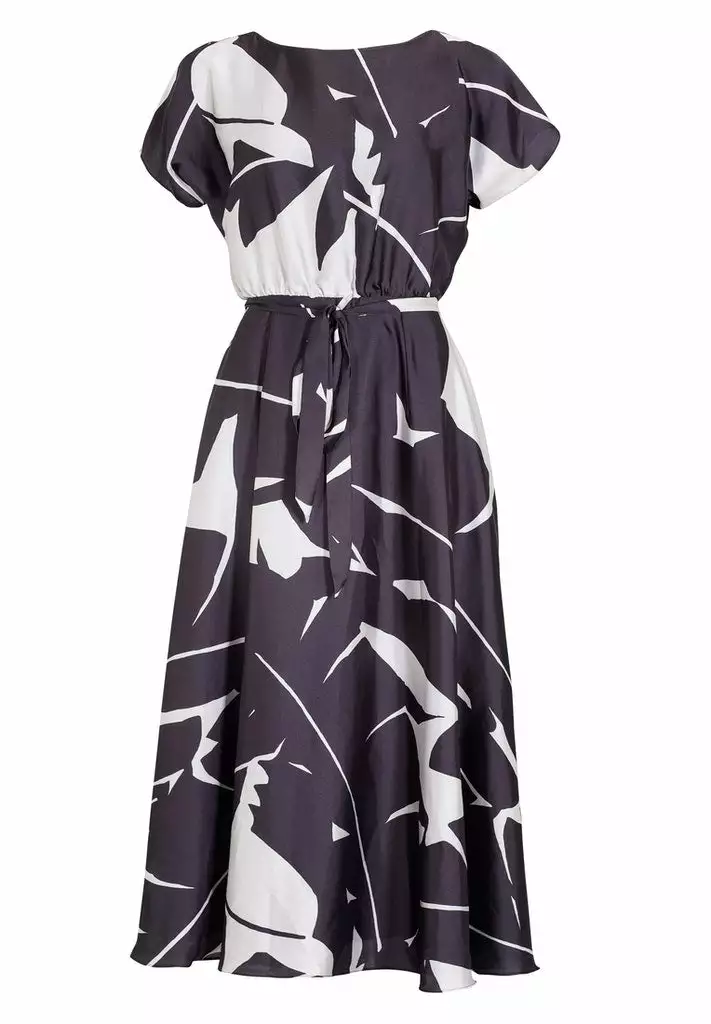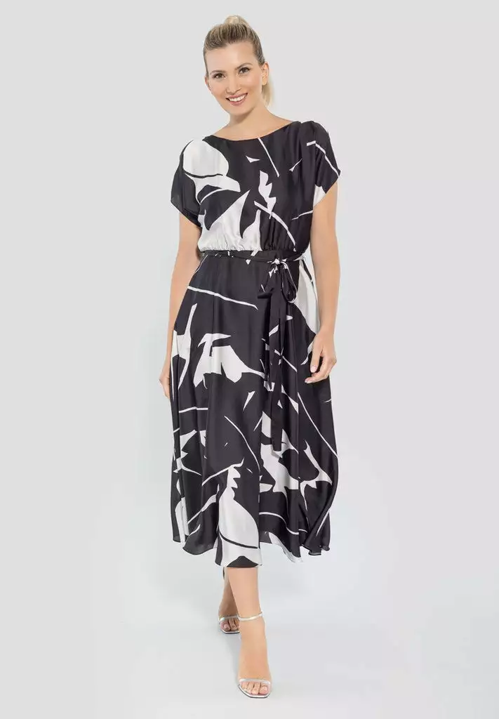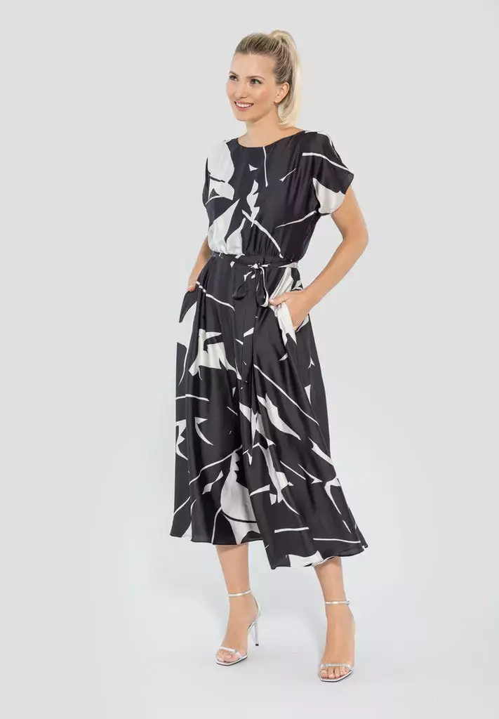 Satijnen midi jurk met mooi zwart wit dessin. De jurk valt aangesloten aan de top en loopt uit in een prachtige zwierige rok. De taille wordt mooi benadrukt door het taillekoord te strikken naar wens. De jurk heeft een korte mouw, ronde halslijn en een ritssluiting aan de achterzijde.